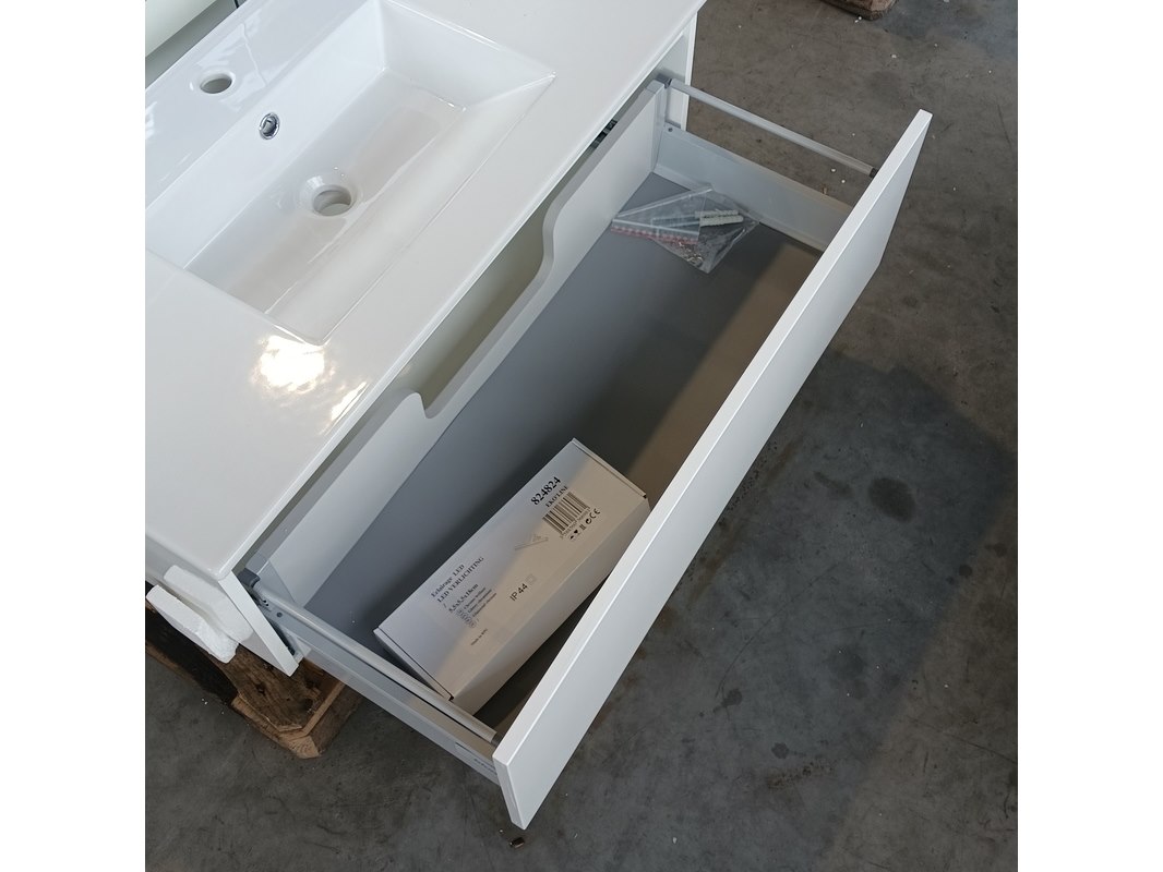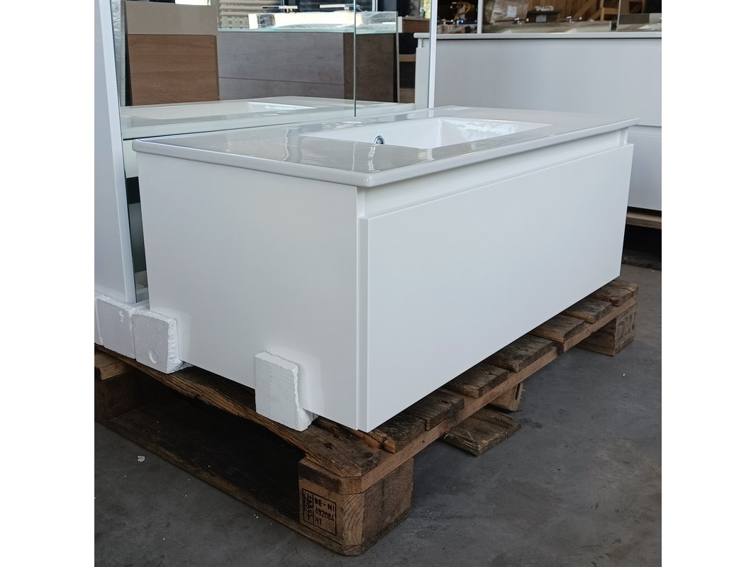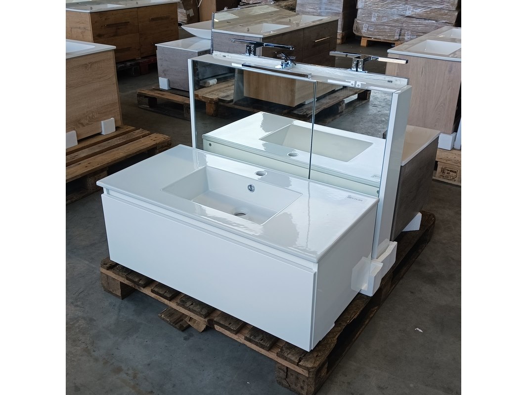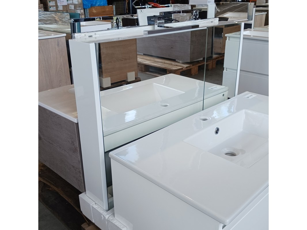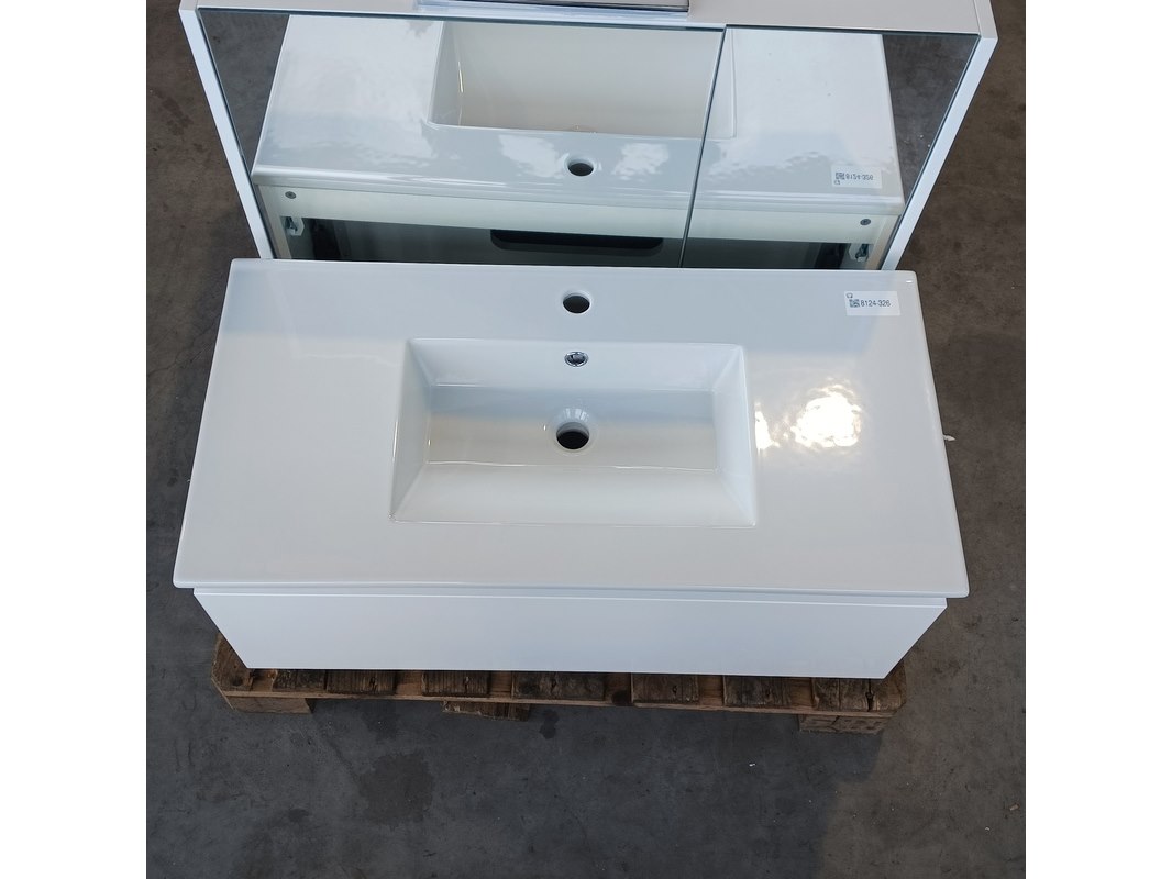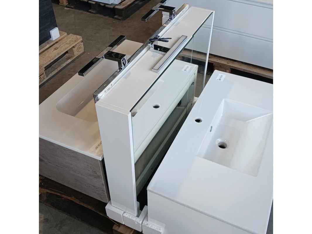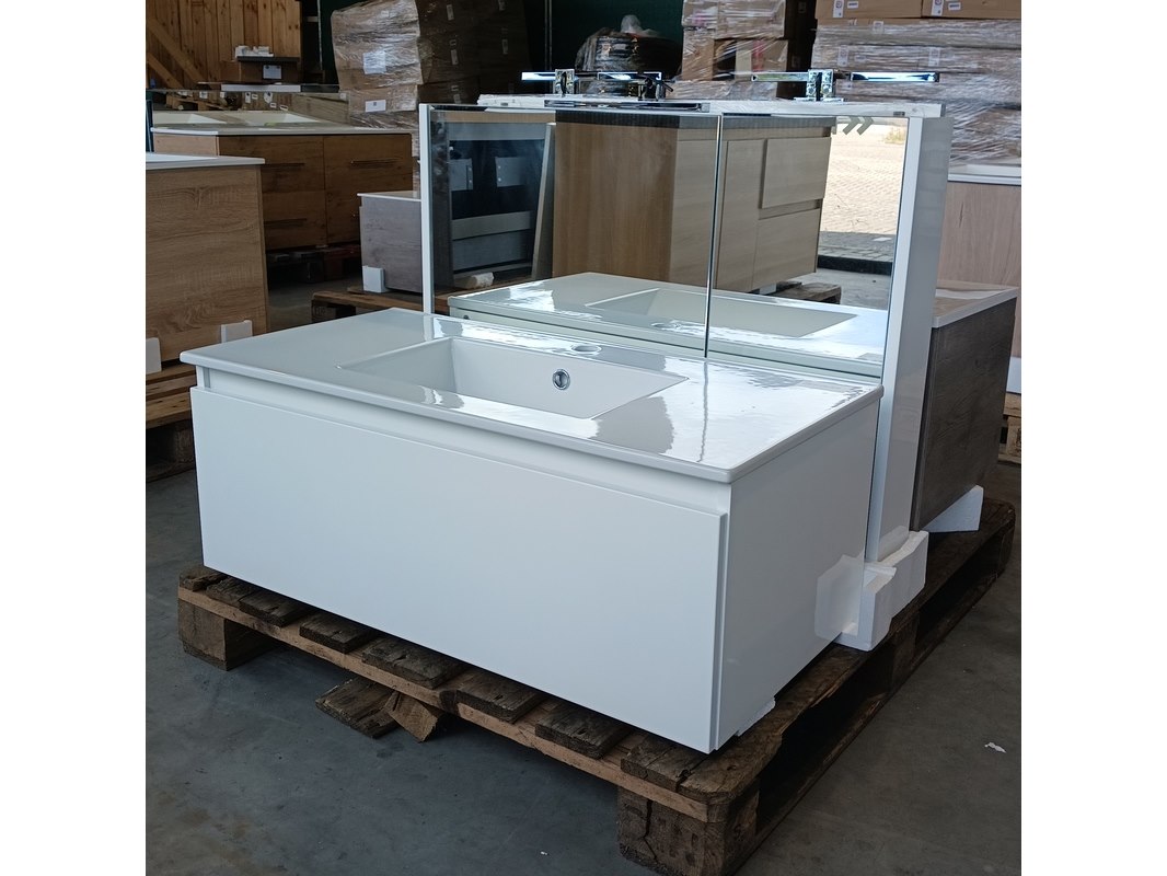 Merk: Dekker -Zevenhuizen Product: Badmeubel Kleur: Hoogglans wit Afmeting: 90x46cm Conditie: Nieuw Specificaties: 1 lade met softclose, met Blum lade-geleiders, keramische wastafel, spiegelkast, 2 deurtjes met softclose, dubbel spiegelend, met velichting