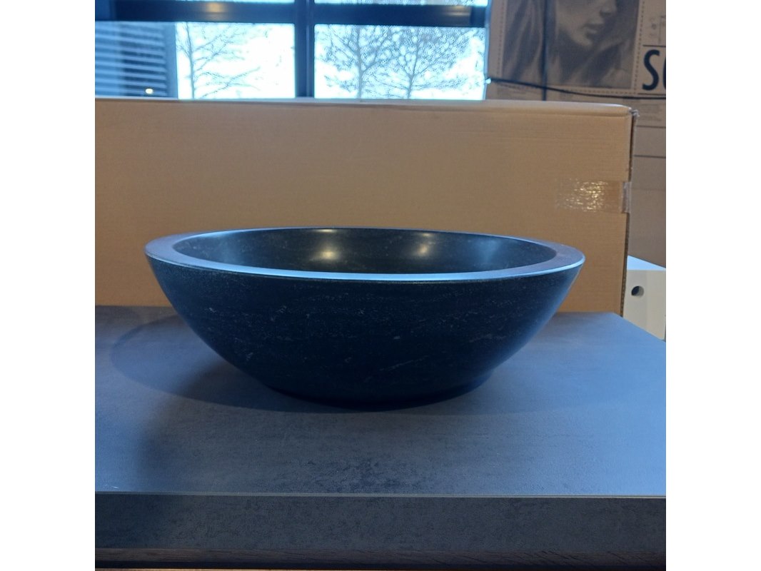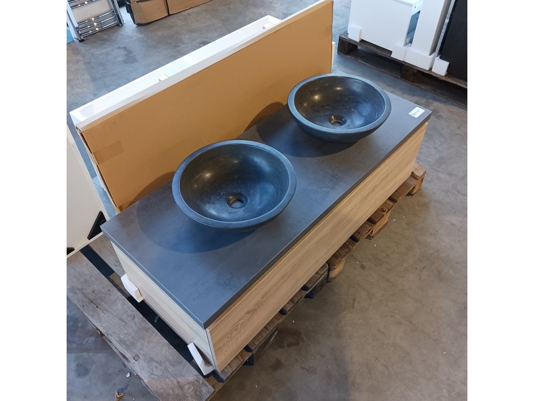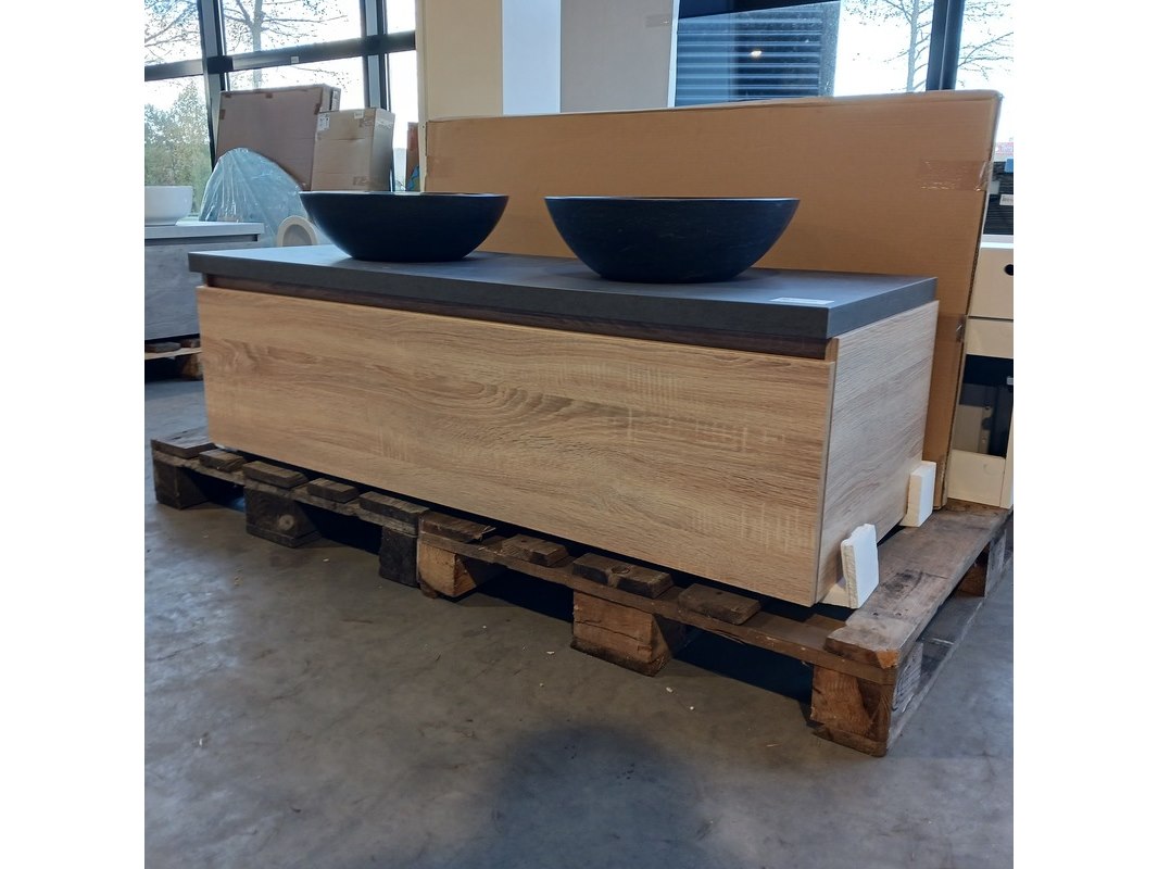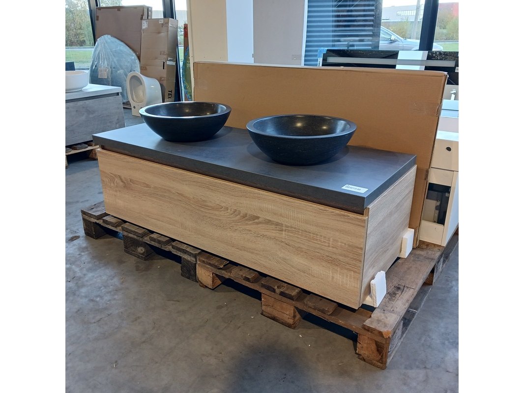 Product: Badmeubel Kleur: Beach oak Afmeting: 130x50cm Specificaties: 1 lade met softclose, Blum lade geleidesysteem, topblad, antraciet, 130x50cm, 2x hardstenen waskom, gezoet, antraciet, Ø 40cm