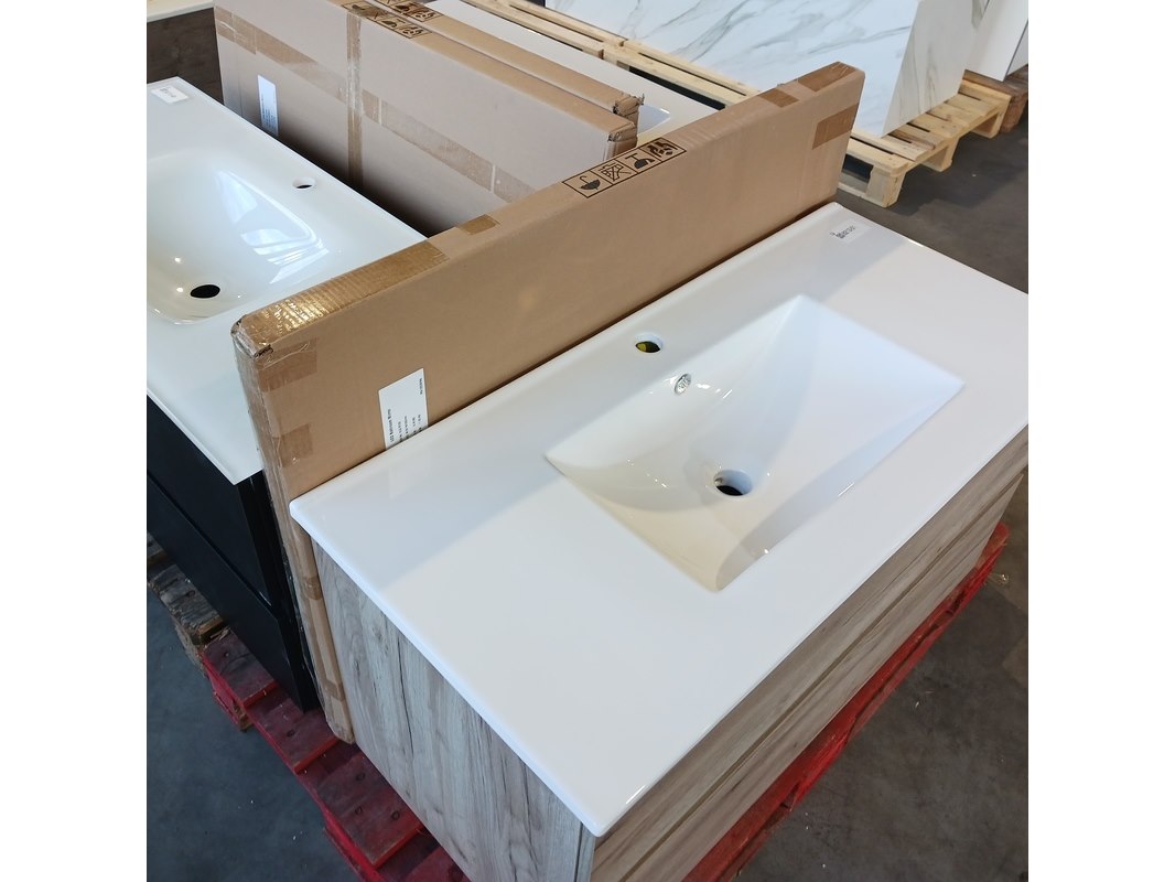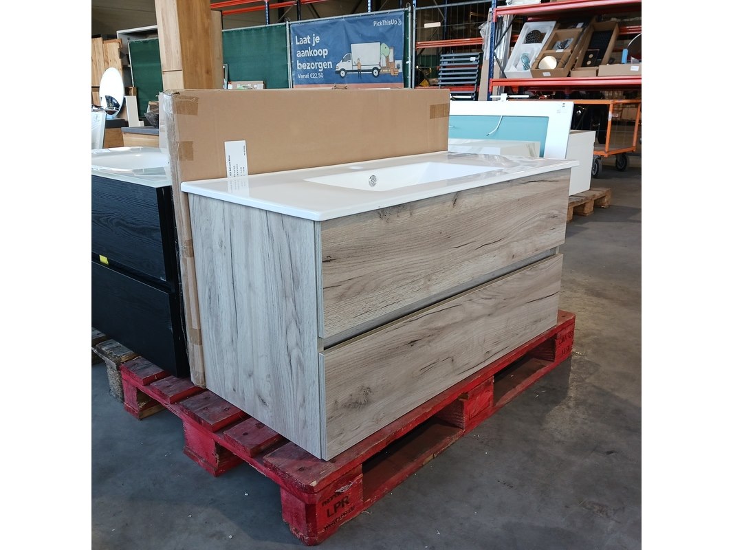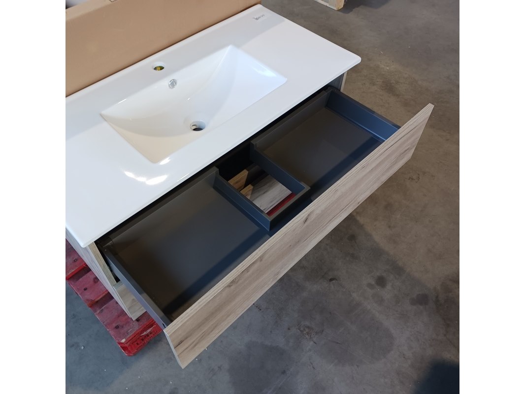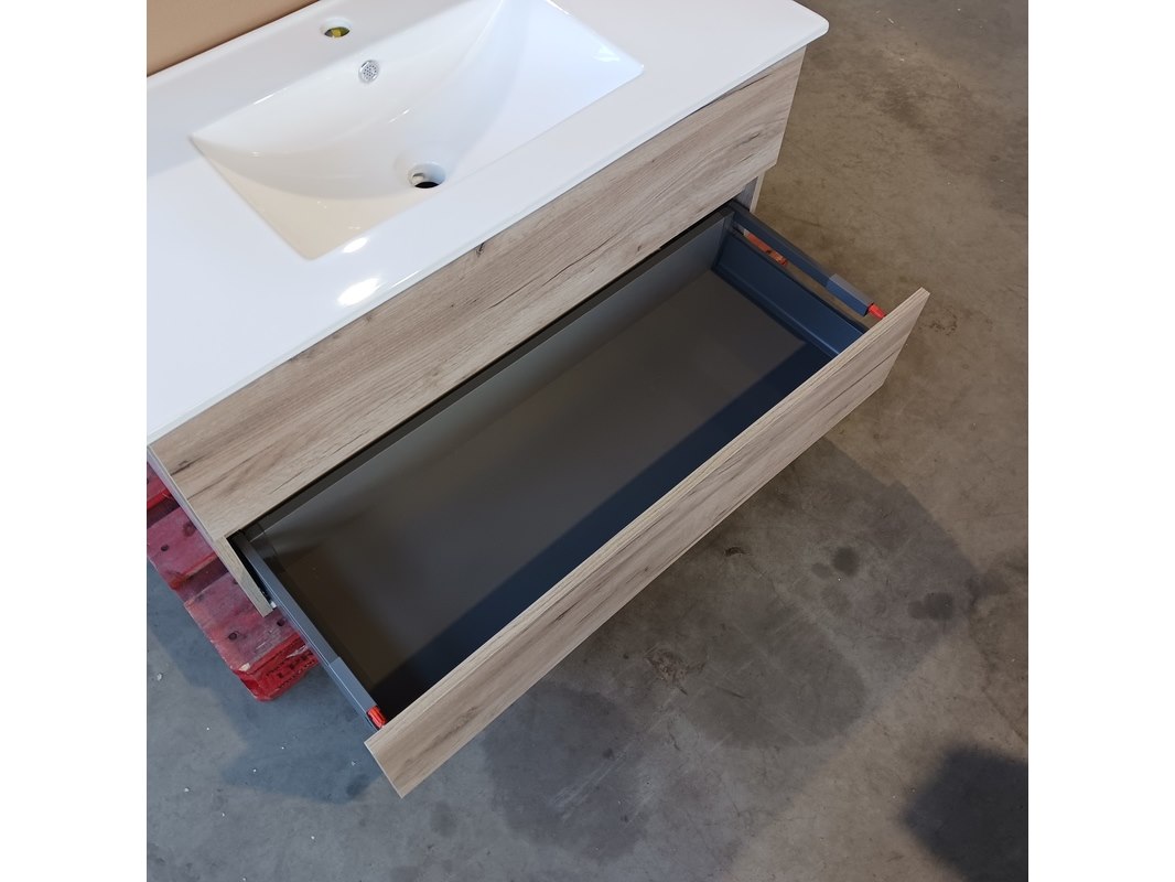 Merk: HR Badmeubelen Product: Badmeubel Kleur: Craft oak Afmeting: 100x46cm Specificaties: 2 lades met softclose, greeploos, keramische wastafel, 1 bak, 1 kraangat, spiegel, 100x70cm,, rondom LED, spiegelverwarming, sensorbediening