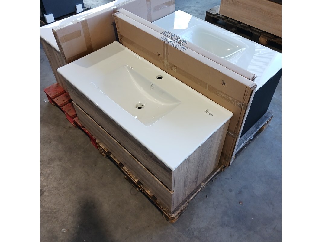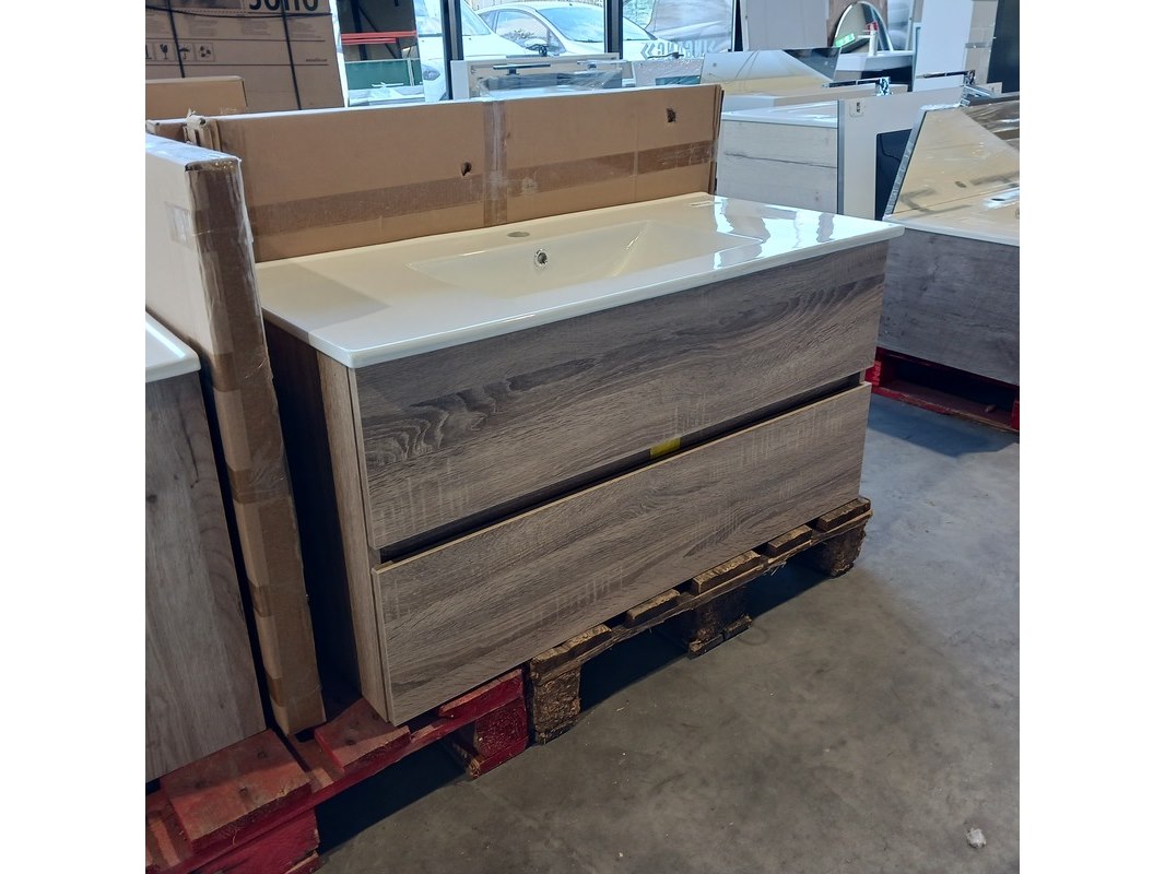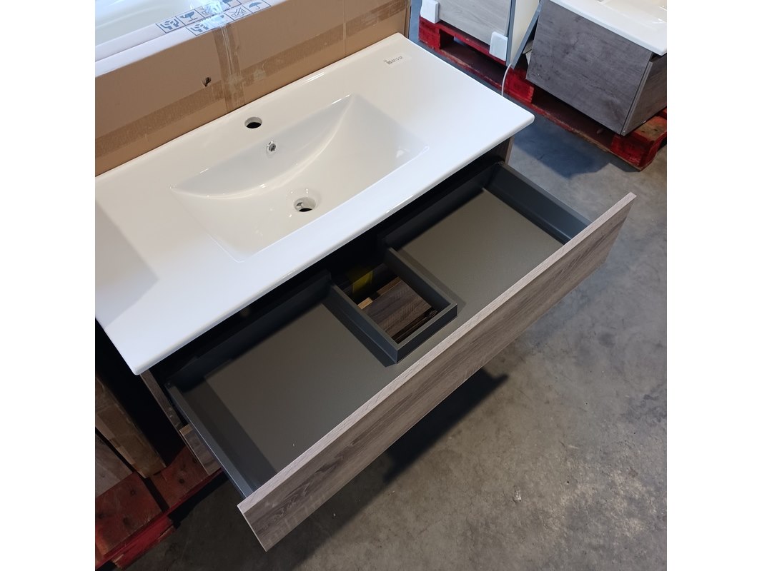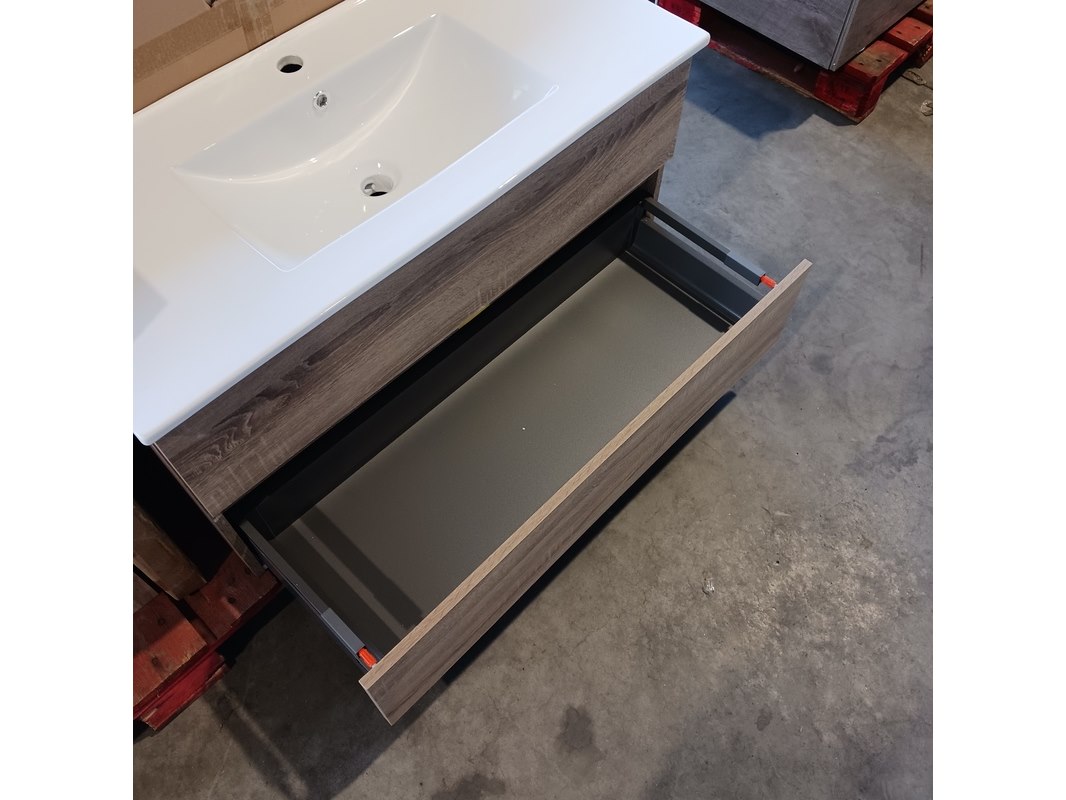 Merk: HR Badmeubelen Product: Badmeubel Kleur: Grijs eiken Afmeting: 100x46cm Specificaties: 2 lades met softclose, greeploos, keramische wastafel, 1 bak, 1 kraangat, spiegel, 100x70cm,, rondom LED, spiegelverwarming, sensorbediening
