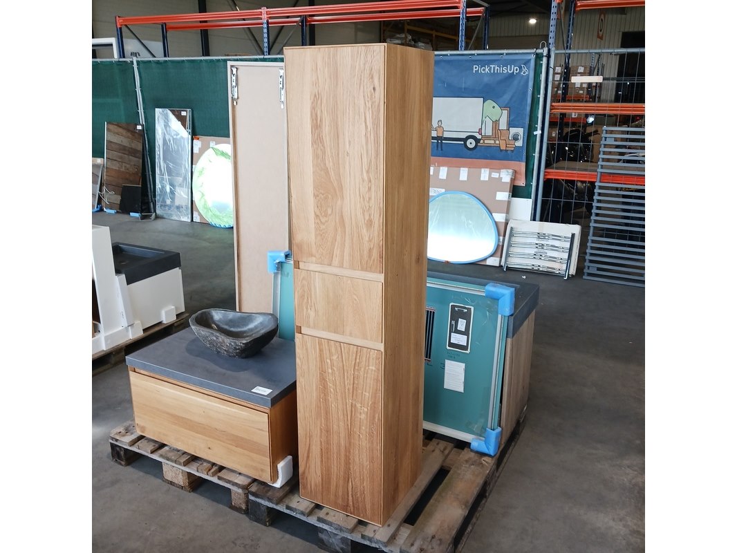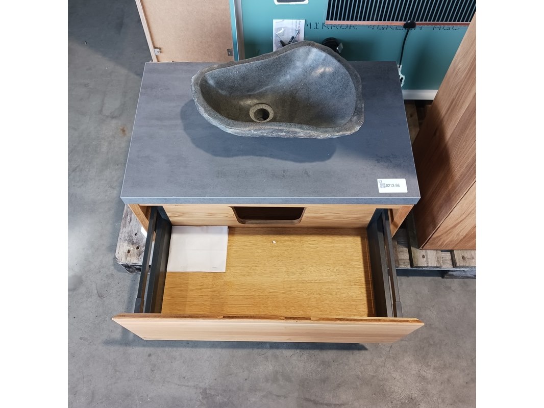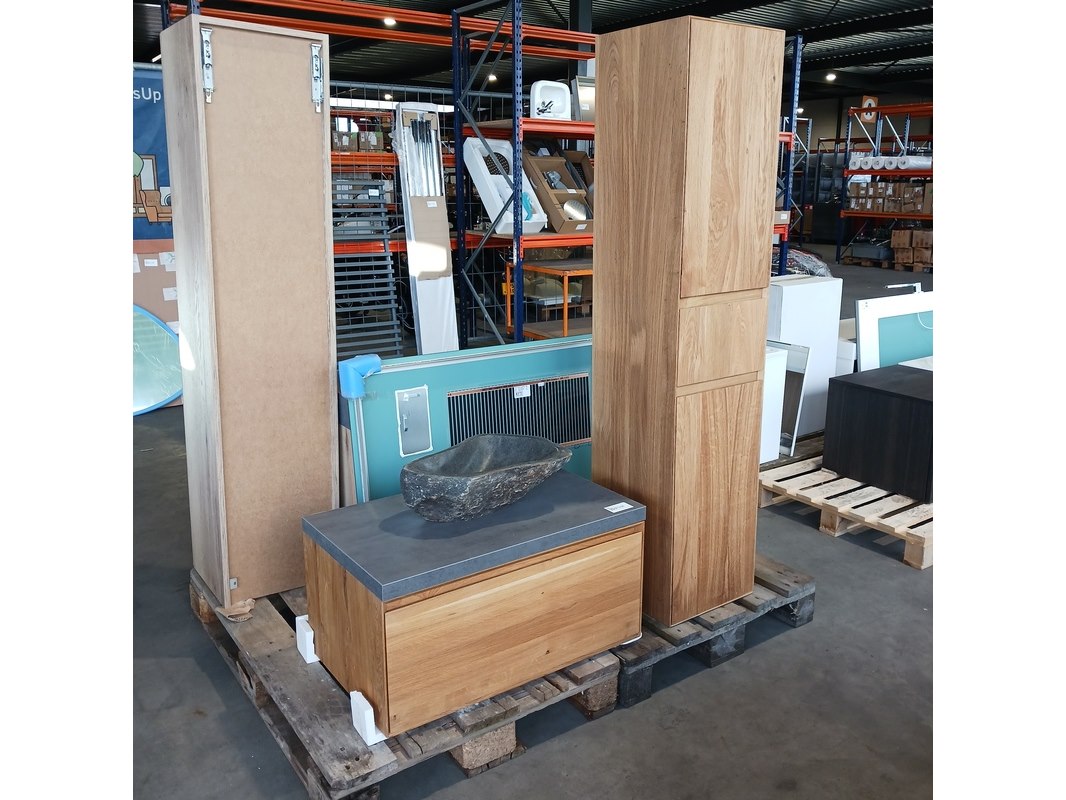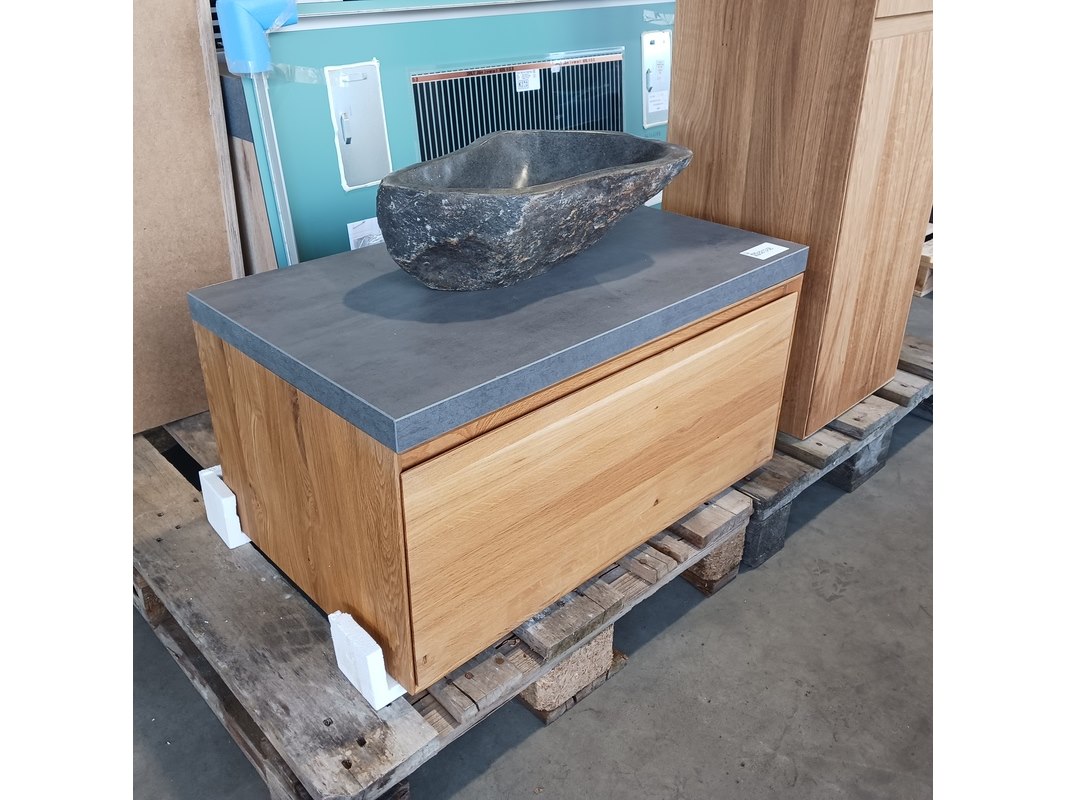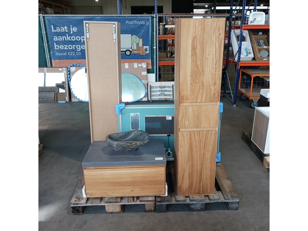 Product: Badmeubel Kleur: Natuur eiken Materiaal: massief eiken Afmeting: 75x46cm Specificaties: 1 lade met softclose, topblad, antraciet, waskom, Riverstone, hoge kast, 160x35x35cm, 2 deurtjes met softclose, 1 lade met softclose