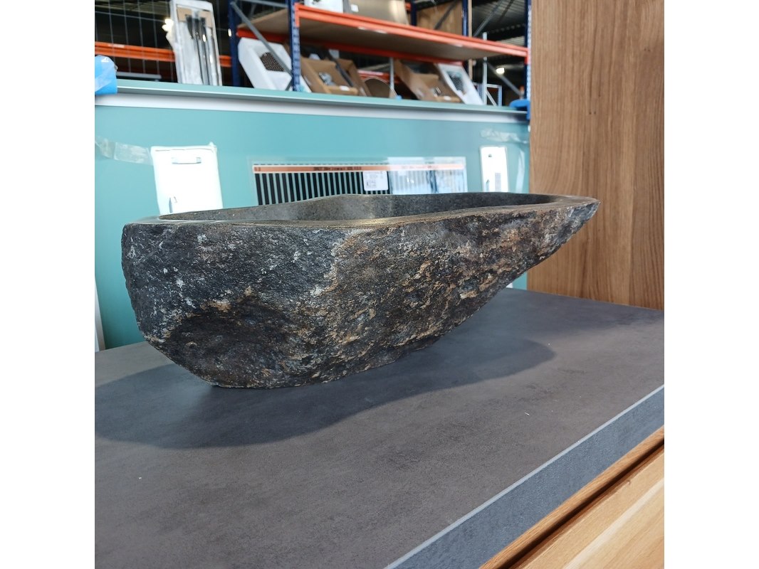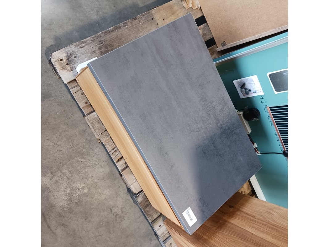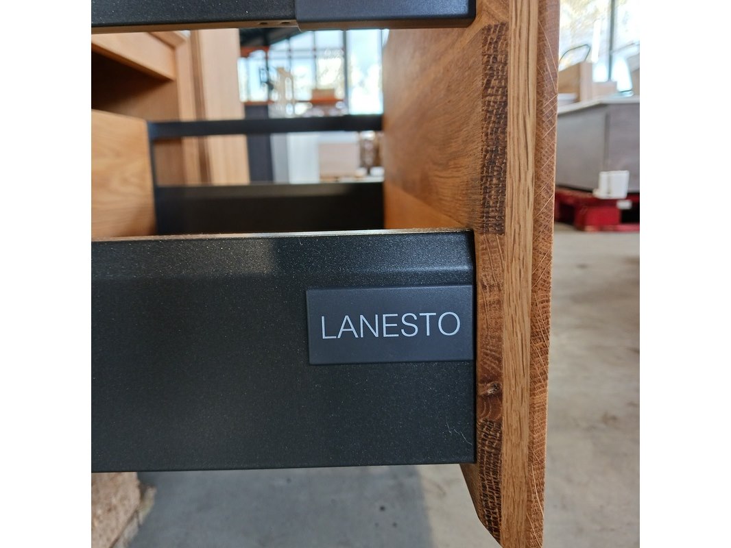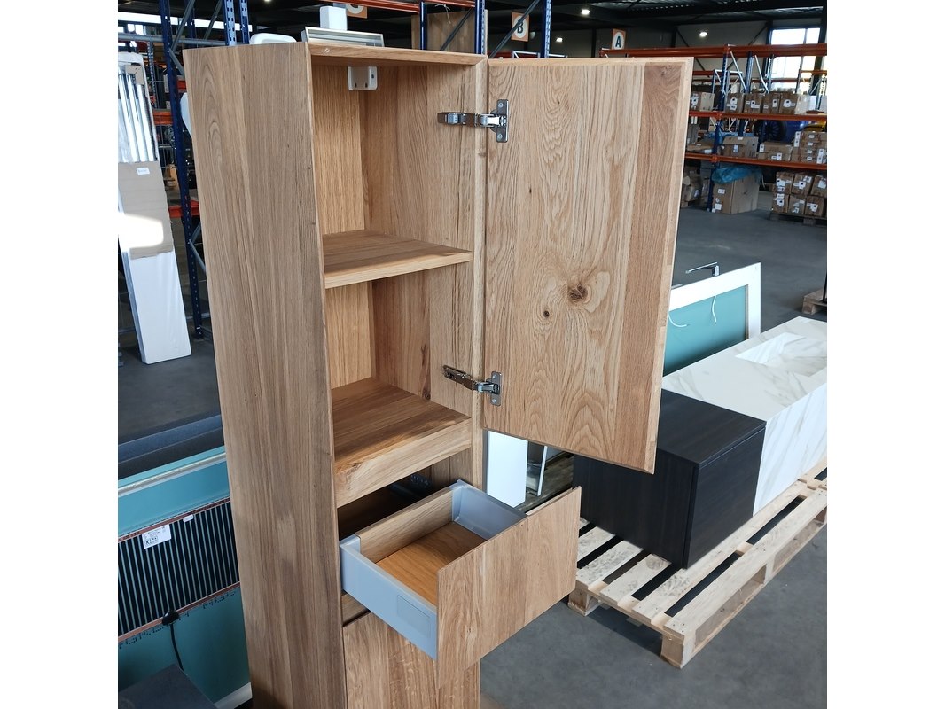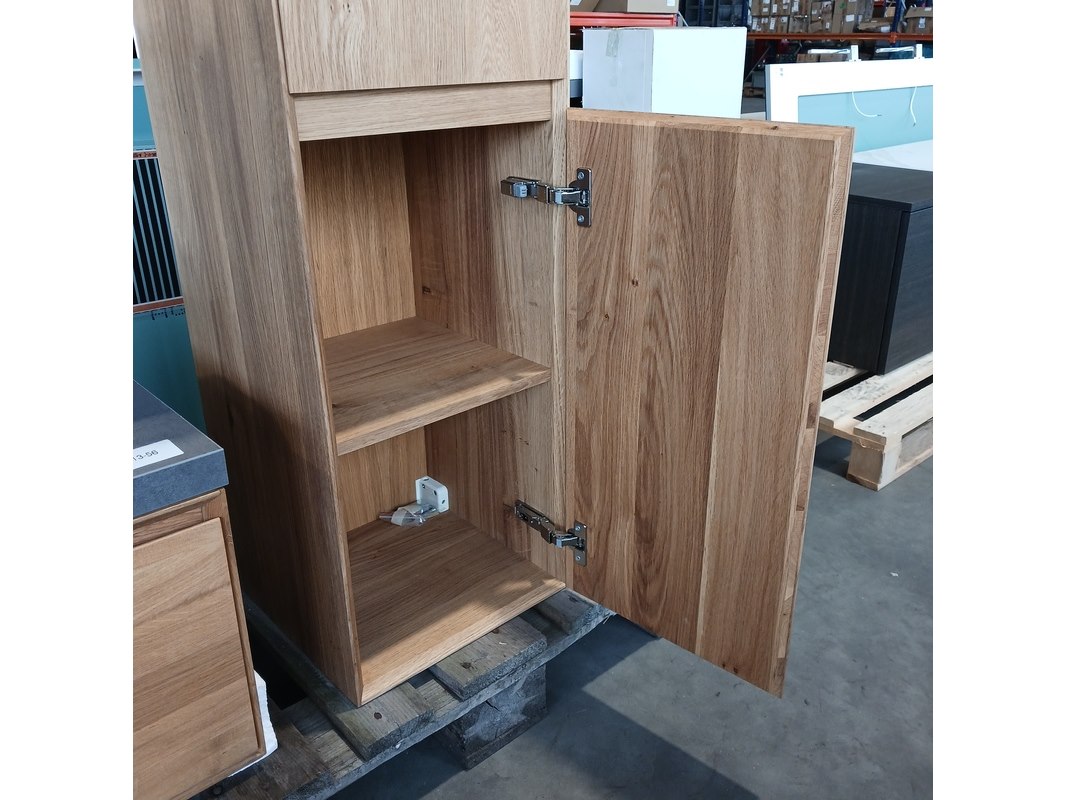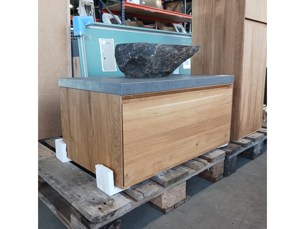 Product: Badmeubel Kleur: Natuur eiken Materiaal: massief eiken Afmeting: 75x46cm Specificaties: 1 lade met softclose, topblad, antraciet, waskom, Riverstone, hoge kast, 160x35x35cm, 2 deurtjes met softclose, 1 lade met softclose