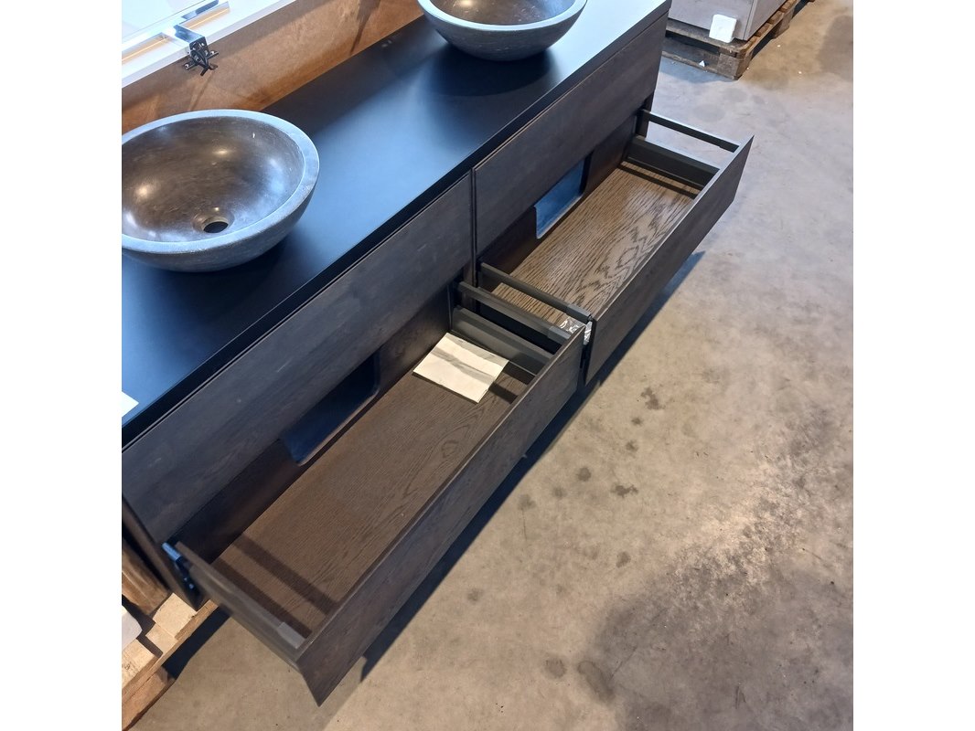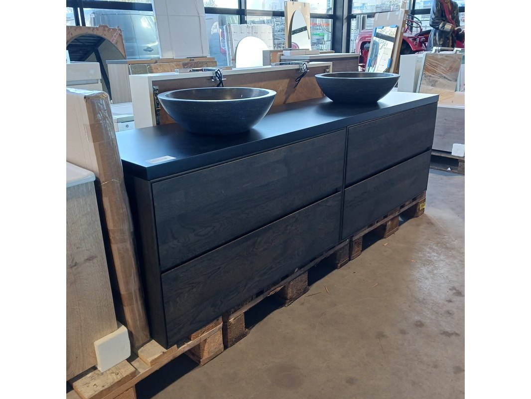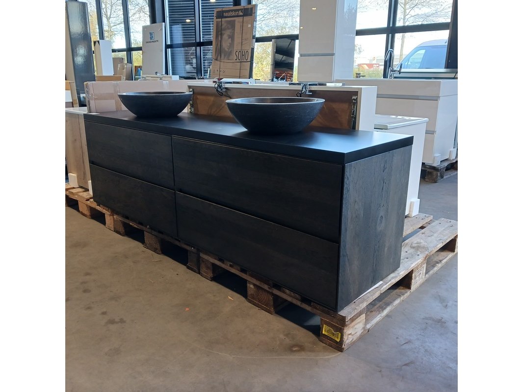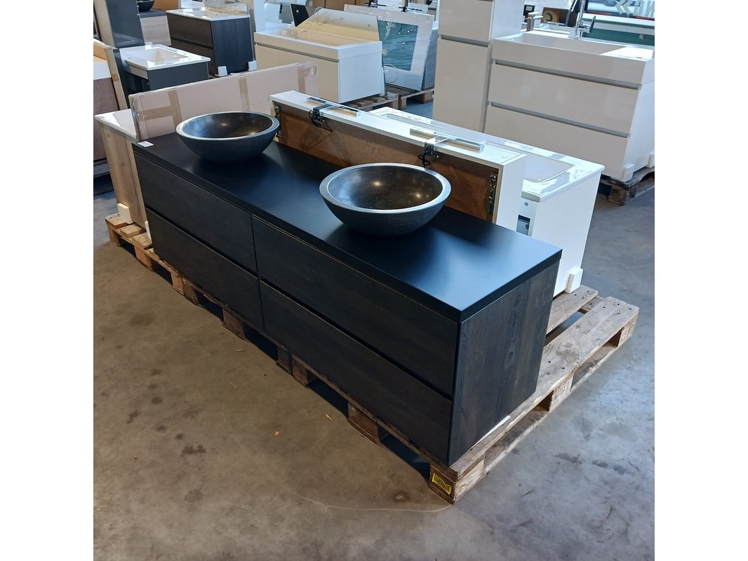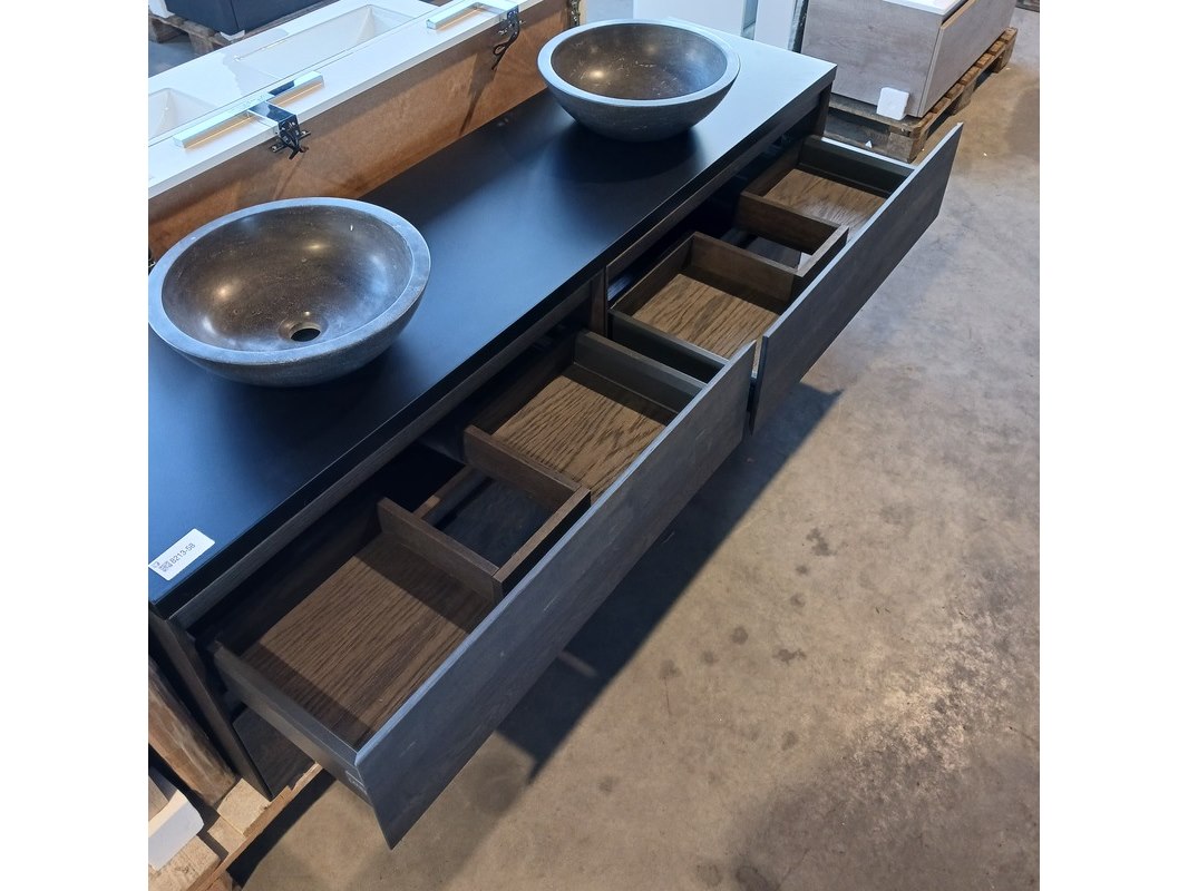 Product: Badmeubel Kleur: Noir 3 Materiaal: massief eiken Afmeting: 180x46cm Specificaties: 4 lades met softclose, greeploos, topblad, matzwart, 2x hardstenen waskom, antraciet gezoet