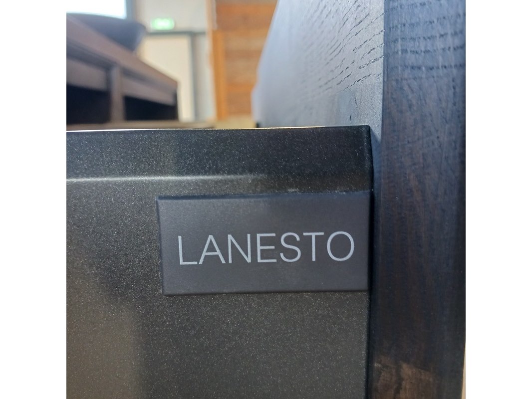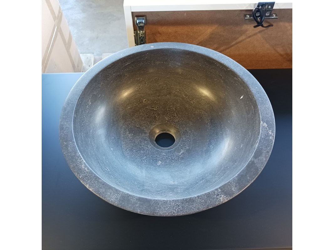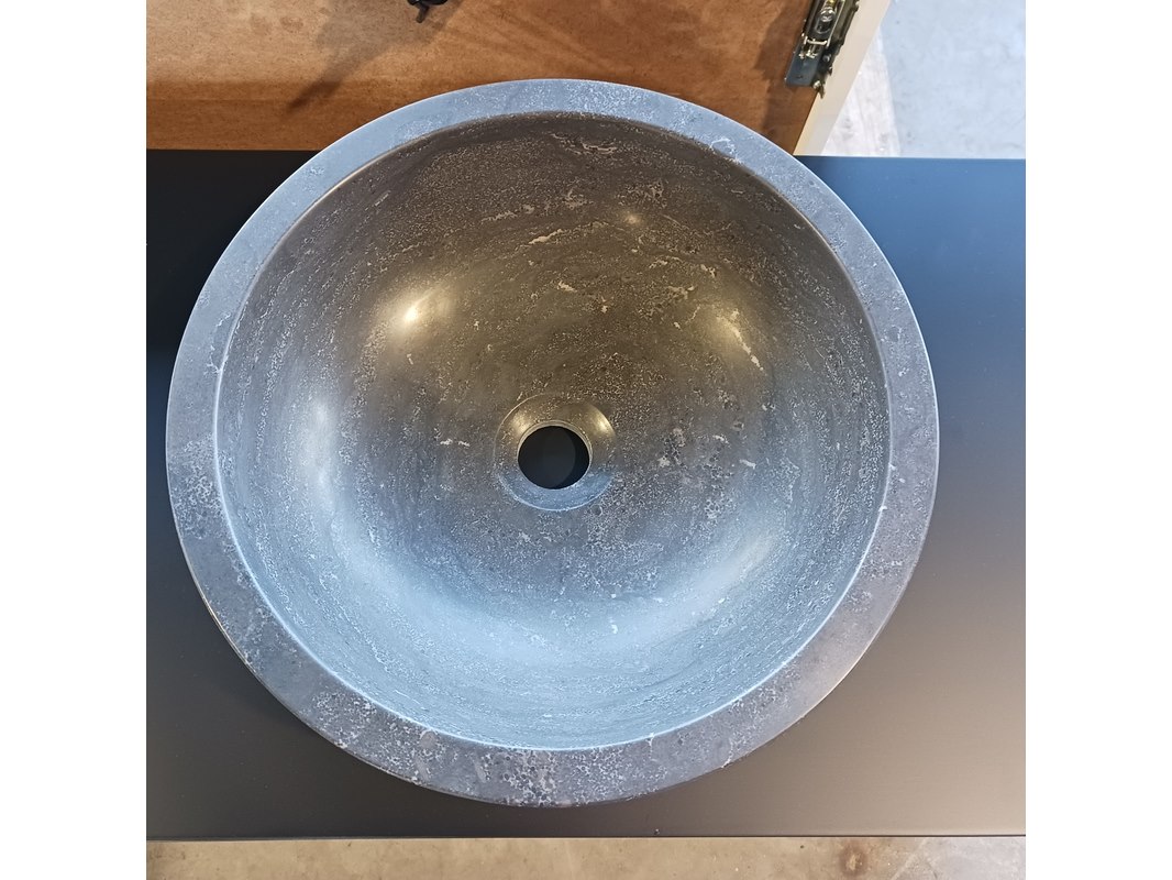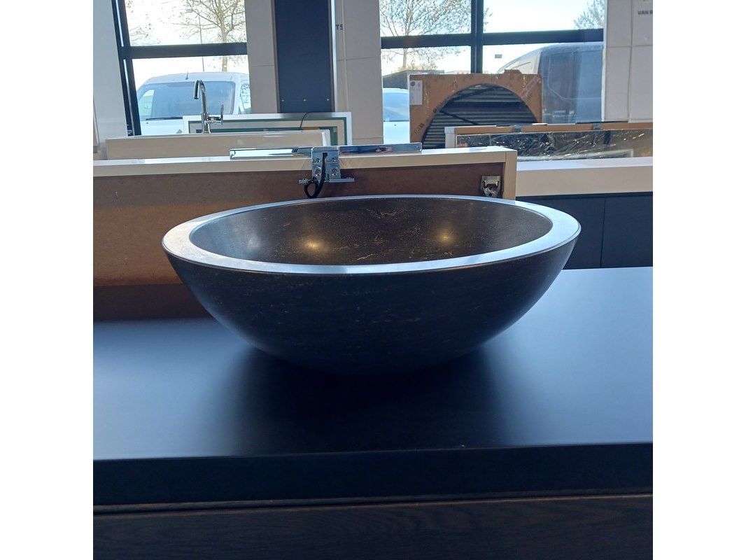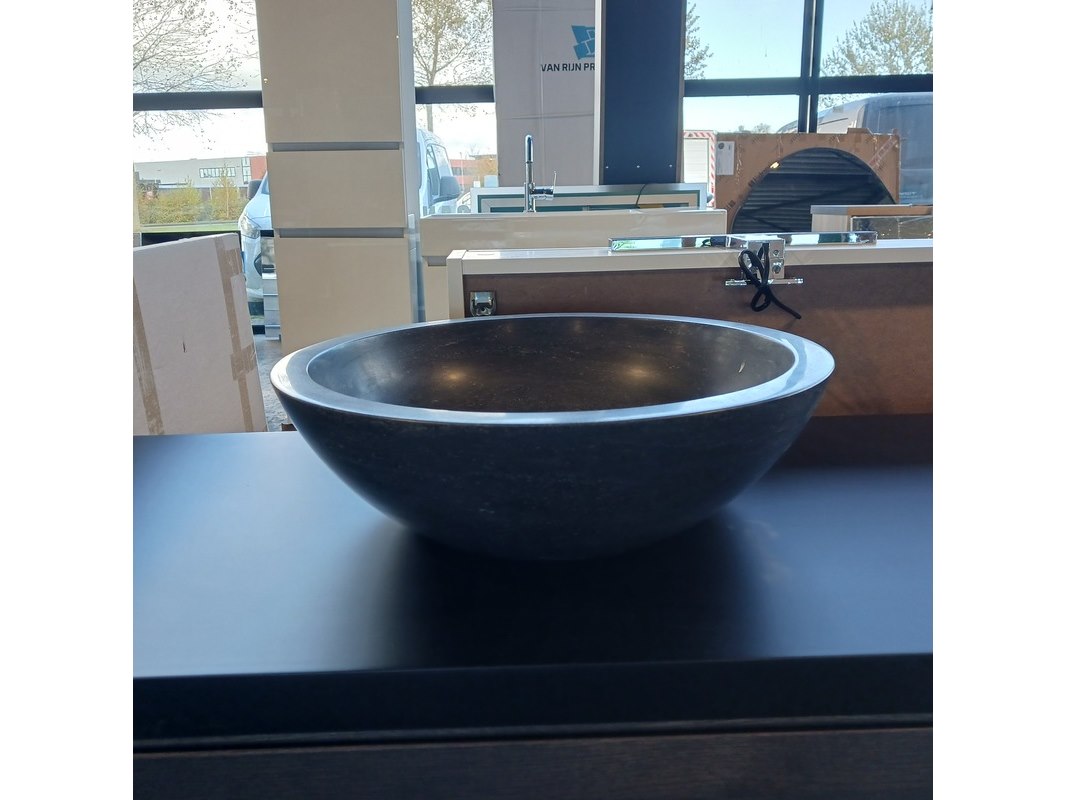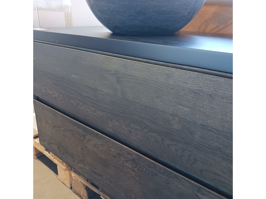 Product: Badmeubel Kleur: Noir 3 Materiaal: massief eiken Afmeting: 180x46cm Specificaties: 4 lades met softclose, greeploos, topblad, matzwart, 2x hardstenen waskom, antraciet gezoet