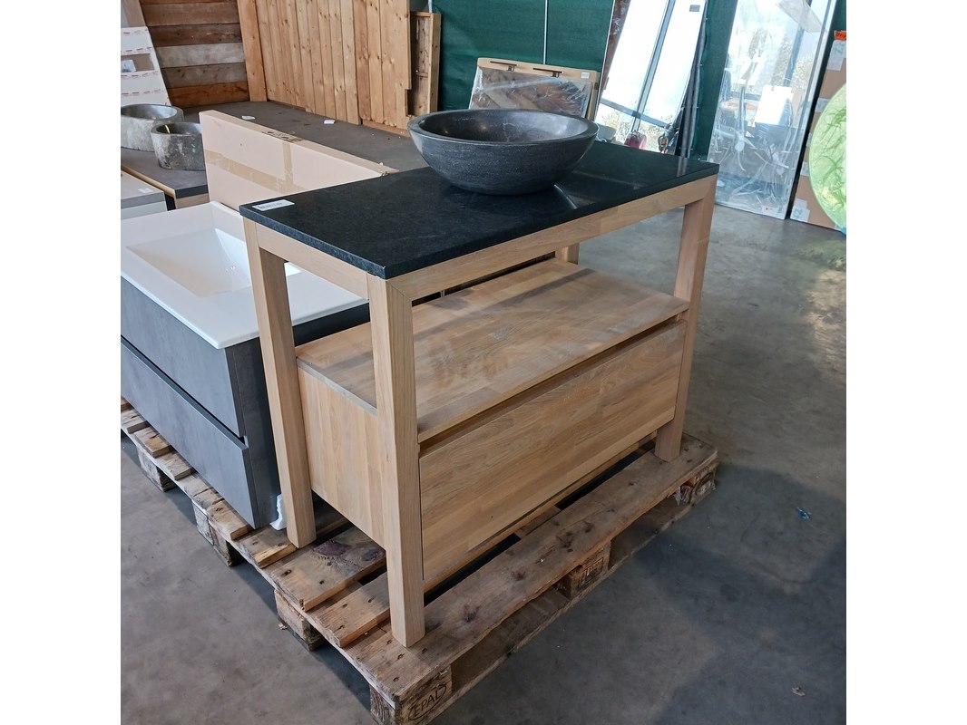 Merk: Finewood design Product: Staand badmeubel Kleur: Eiken naturel Materiaal: massief eiken Afmeting: 100x46cm Specificaties: 1 lade met s.c., greeploos, topblad met waskom, hardsteen, antraciet, hoogte, 80cm