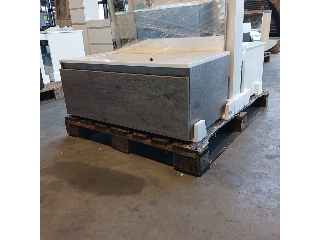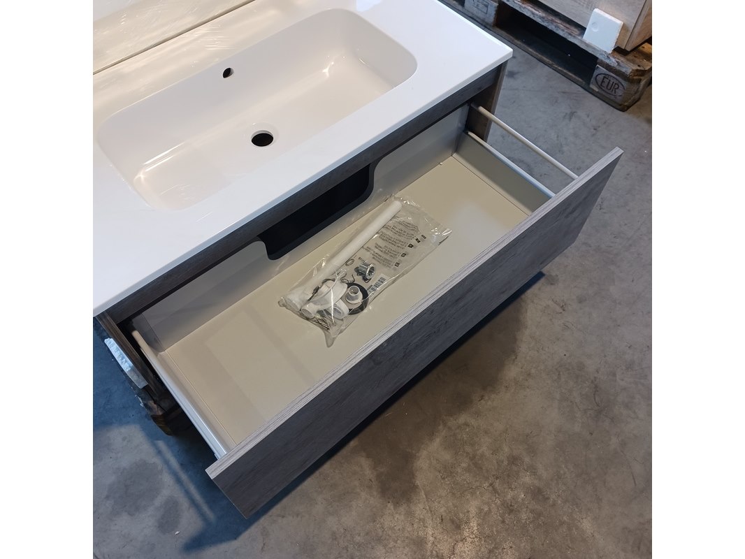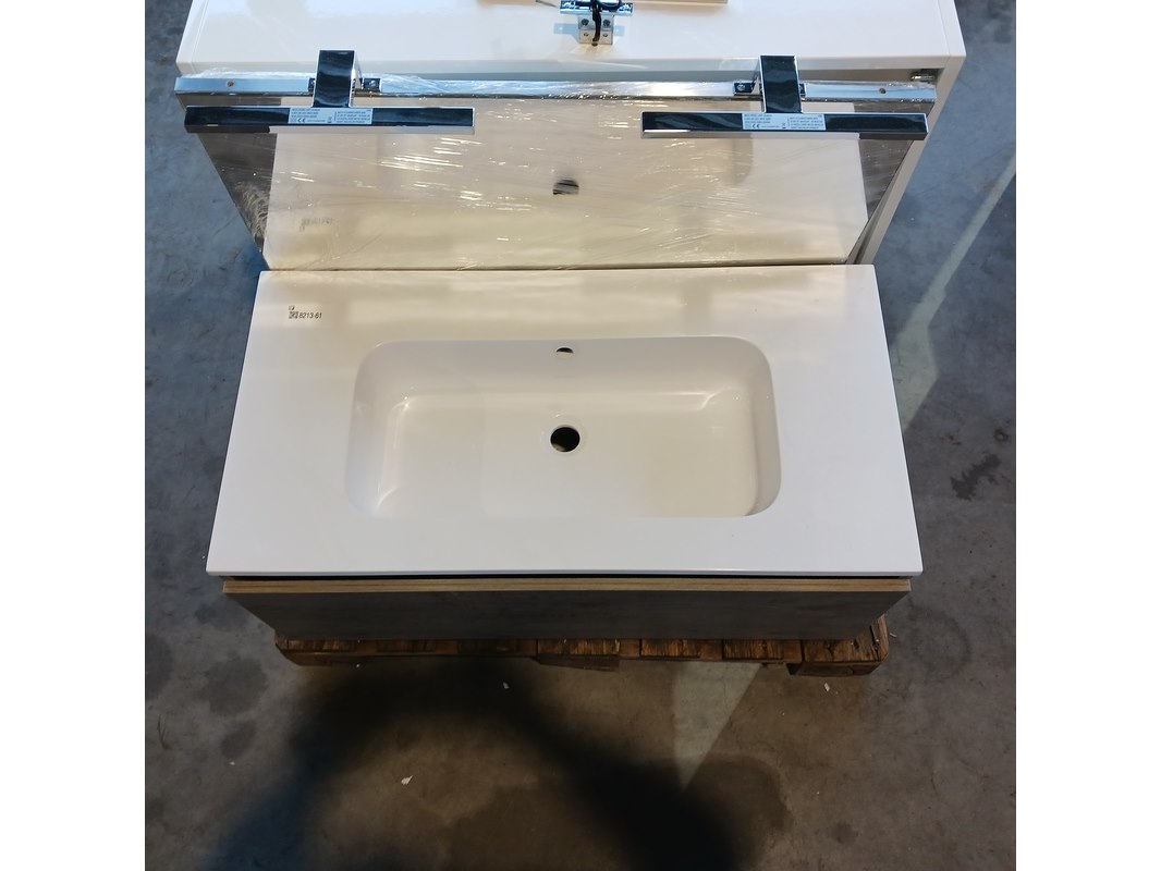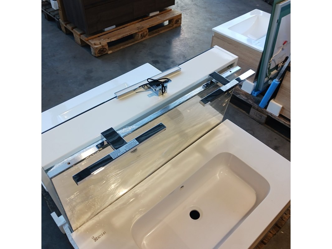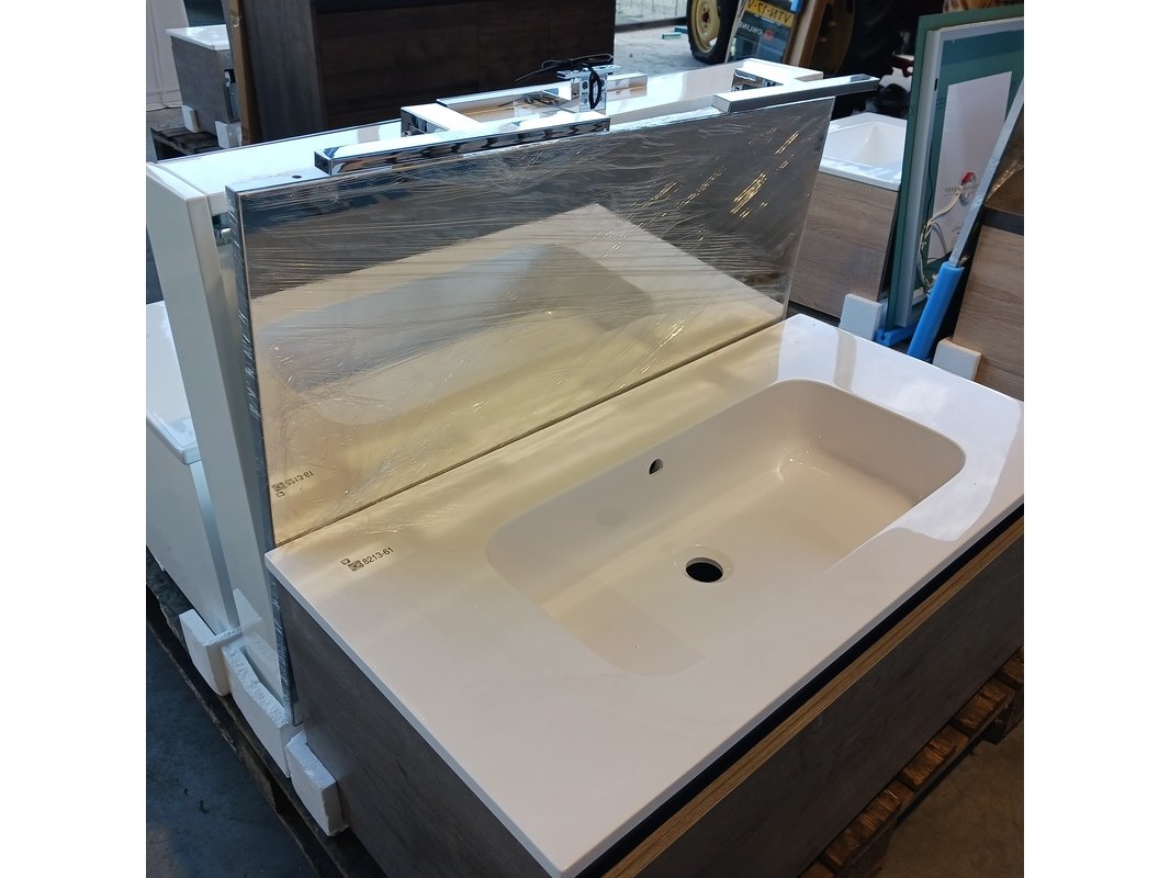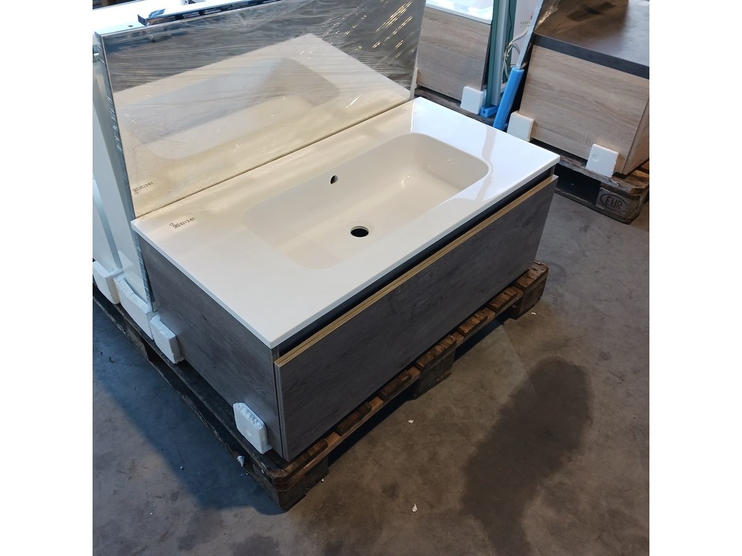 Merk: Blum Product: Badmeubel Kleur: Lancelot grey Afmeting: 90x46cm Specificaties: Keramische wastafel, wit, spiegel, 90x65cm, met 2x verlichting