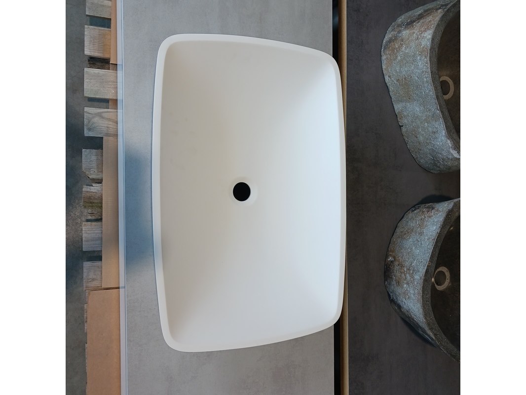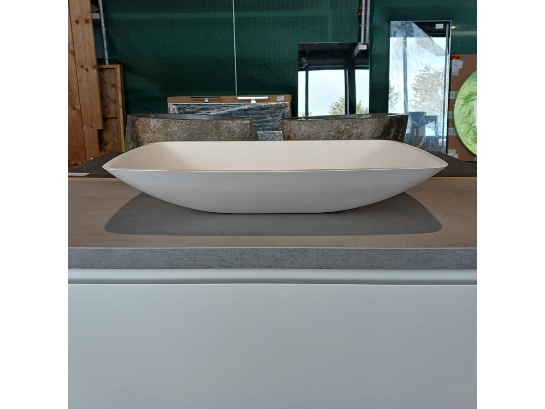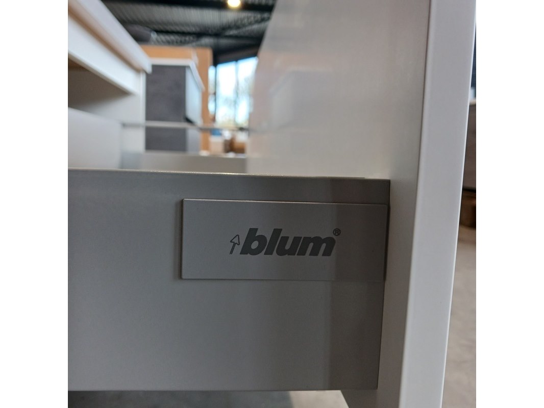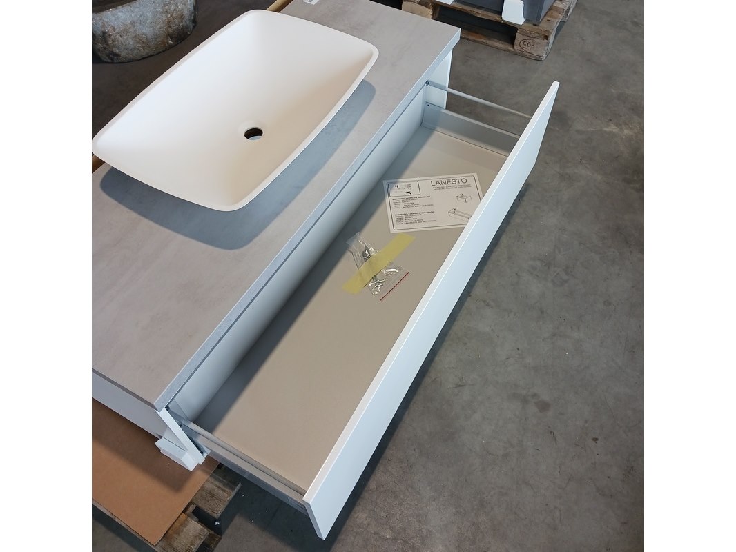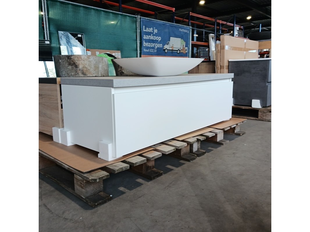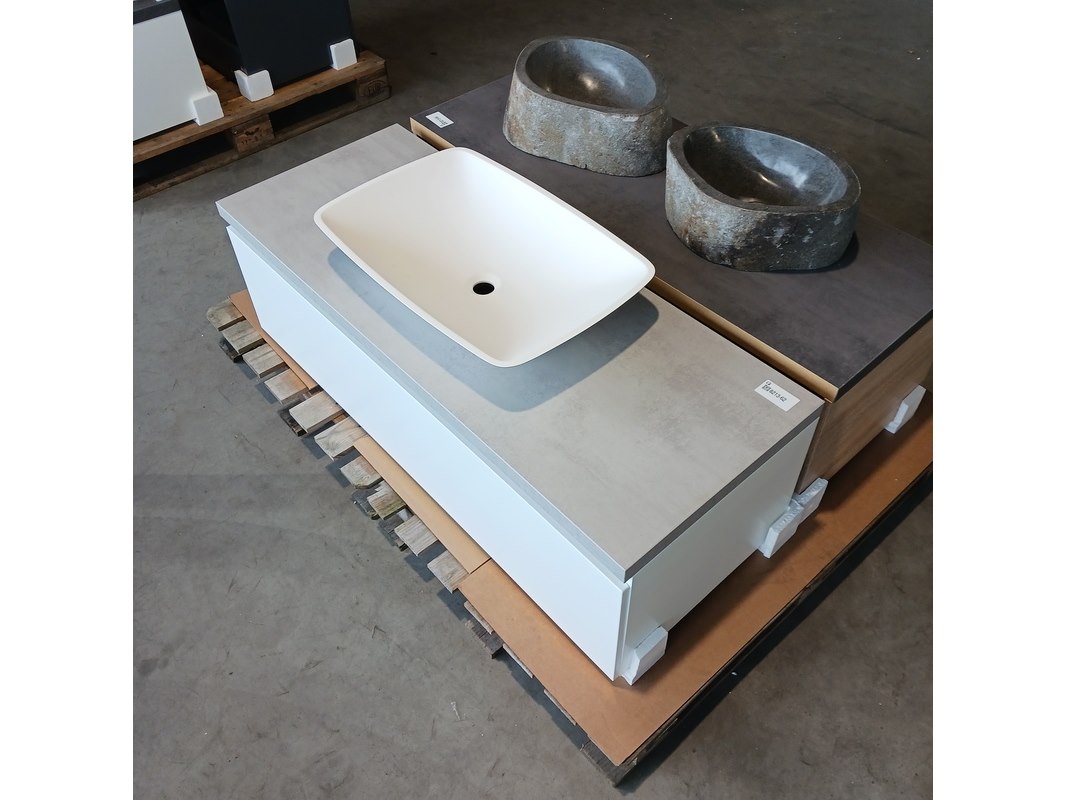 Merk: Blum Product: Badmeubel Kleur: Mat wit Afmeting: 130x50cm Specificaties: 1 lade met s.c. en Blum geleide systeem, topblad betongrijs, waskom, 64x43cm, solid surface, matwit