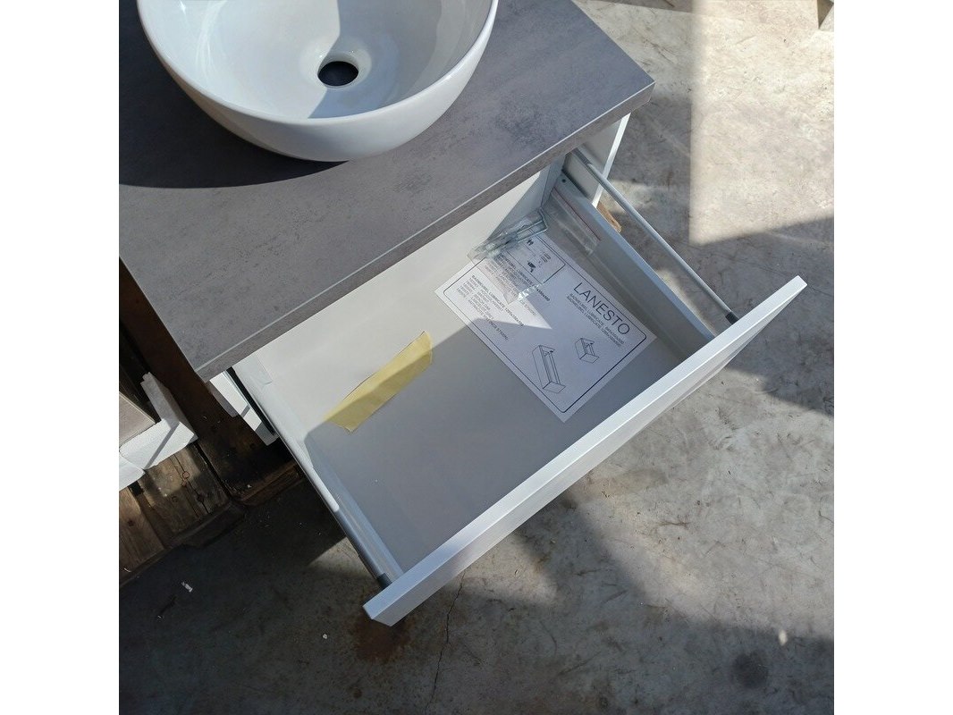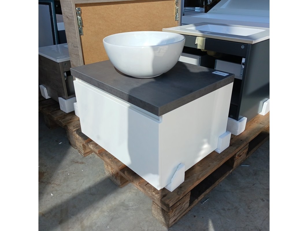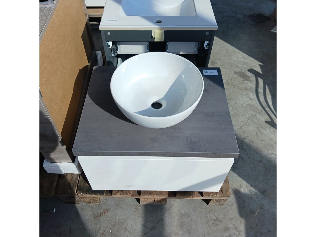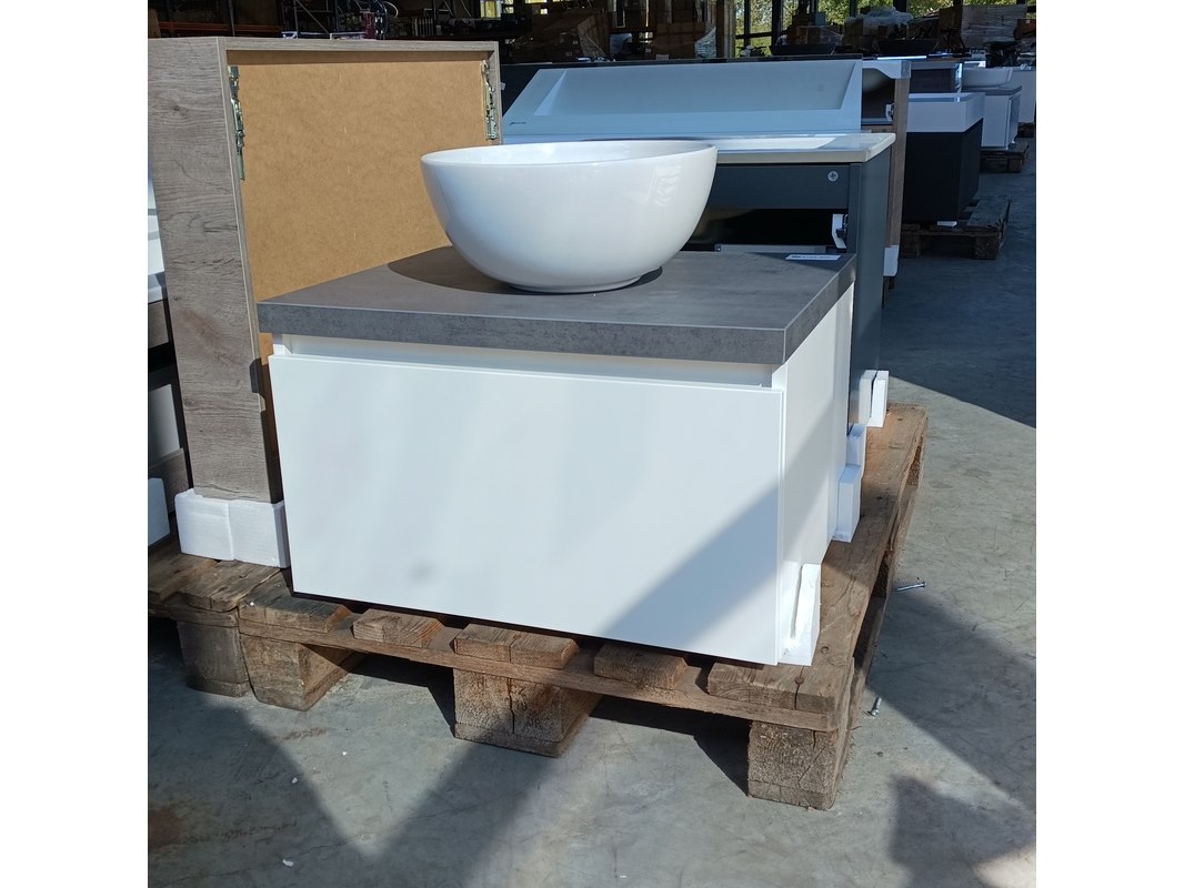 Merk: Dekker -Zevenhuizen Product: Badmeubel Kleur: Hoogglans wit Afmeting: 75x46cm Conditie: Nieuw Specificaties: 1 lade met softclose, met Blum lade-geleiders, topblad antraciet, waskom, keramisch, wit, spiegel met verlichting