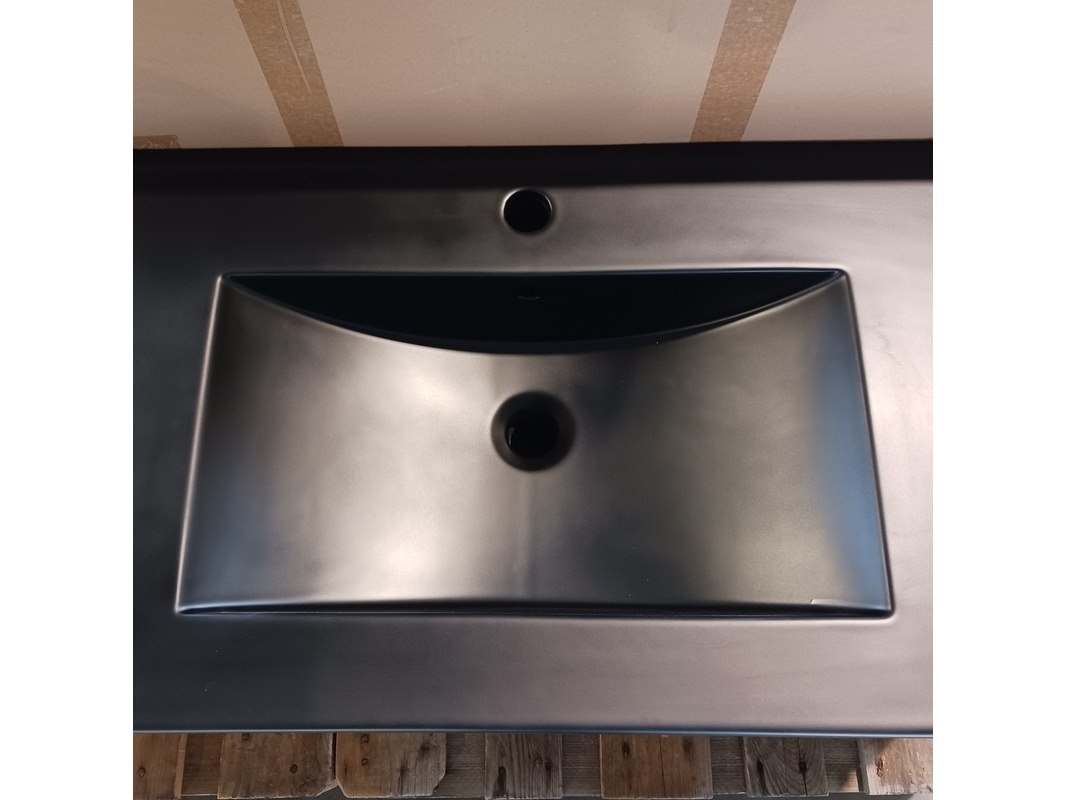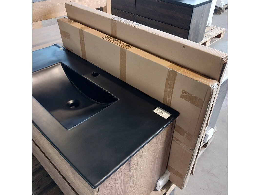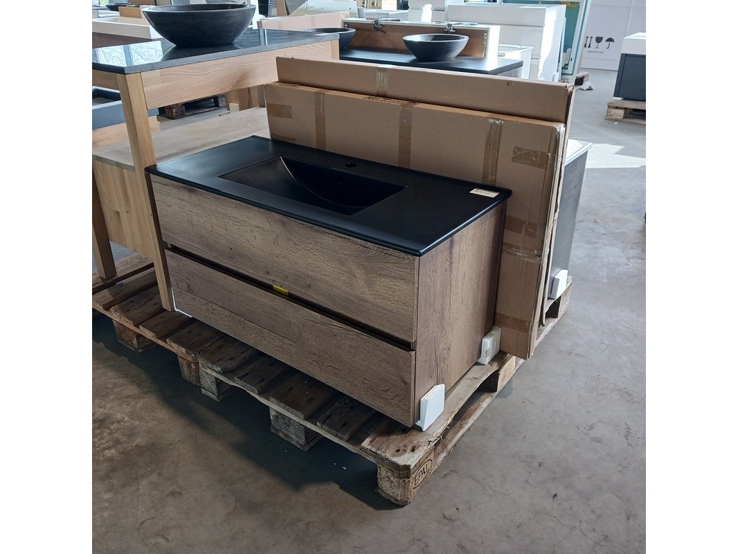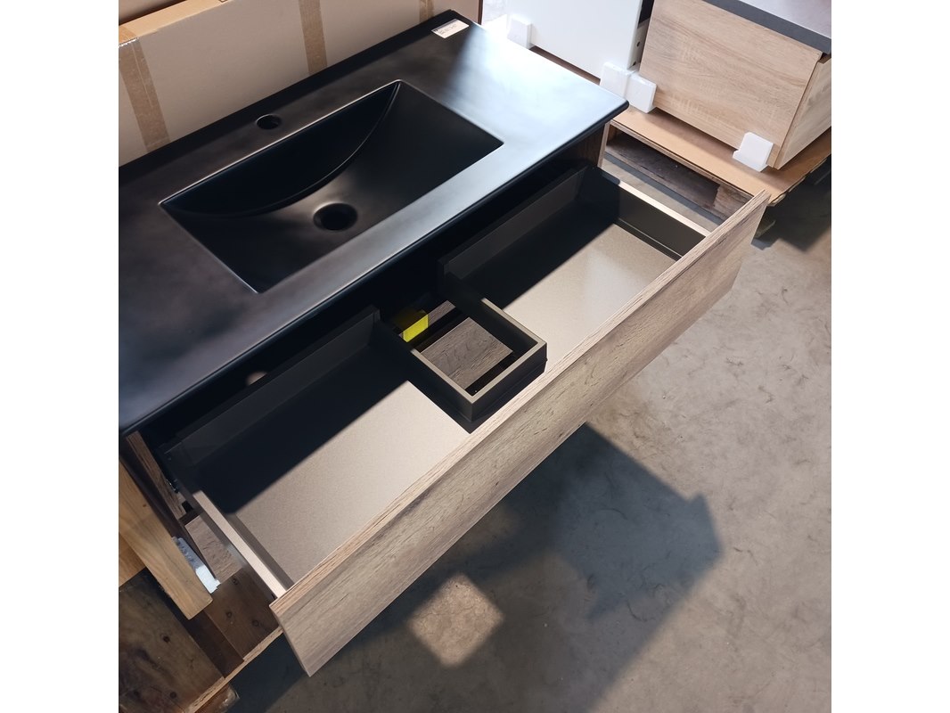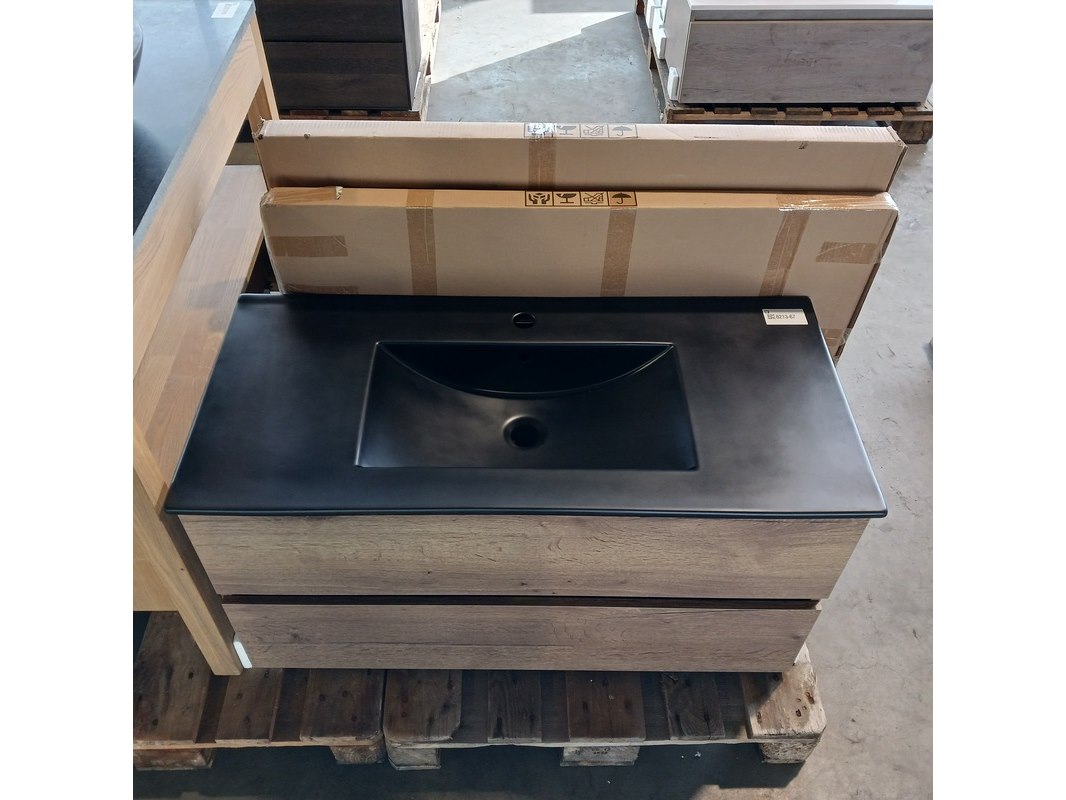 Merk: HR Badmeubelen Product: Badmeubel Kleur: Tobacco Afmeting: 100x46cm Specificaties: 2 lades met softclose, greeploos, keramische wastafel, matzwart, spiegel, 100x70cm, LED rondom, spiegelverwarming, sensorbediening