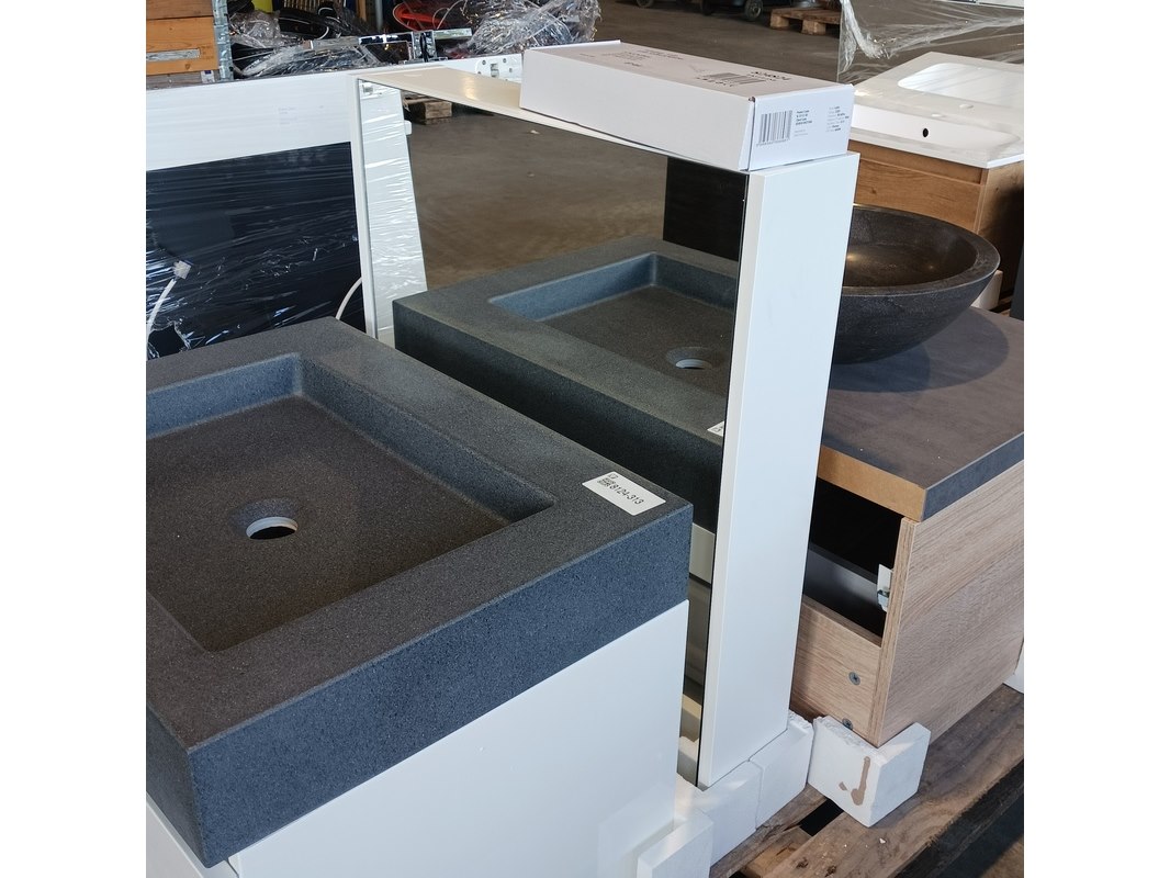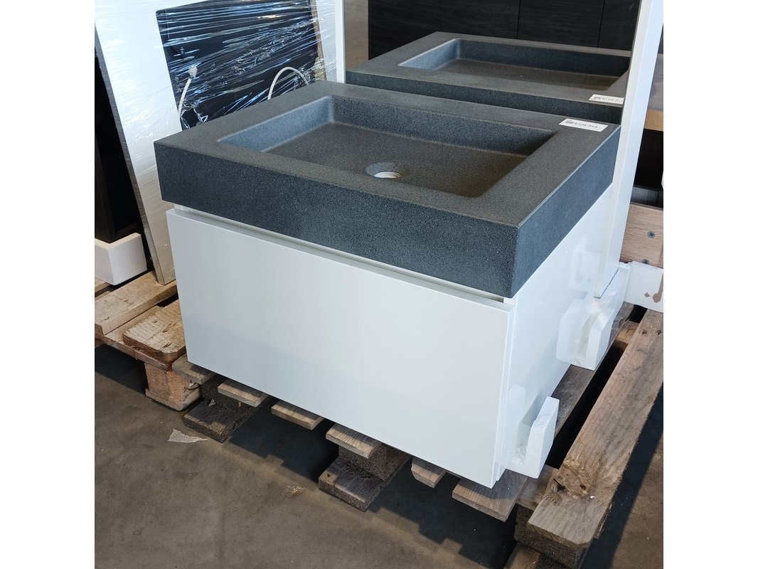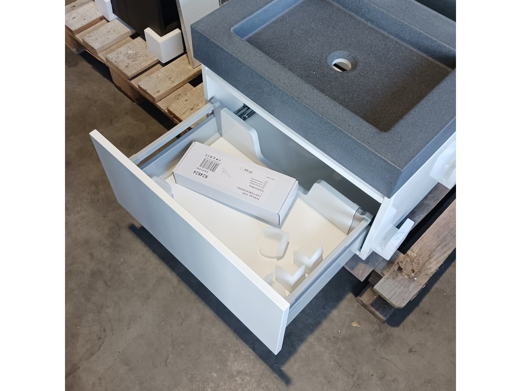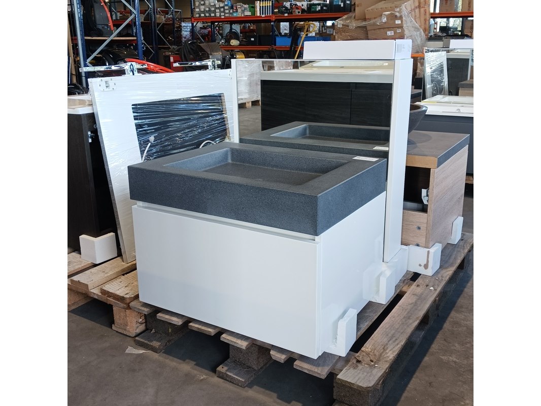 Merk: Dekker -Zevenhuizen Product: Badmeubel Kleur: Glans wit Afmeting: 60x46cm Conditie: Nieuw Specificaties: 1 lade met softclose, met Blum lade-geleiders, wastafel, composiet, grey, spiegelkast
