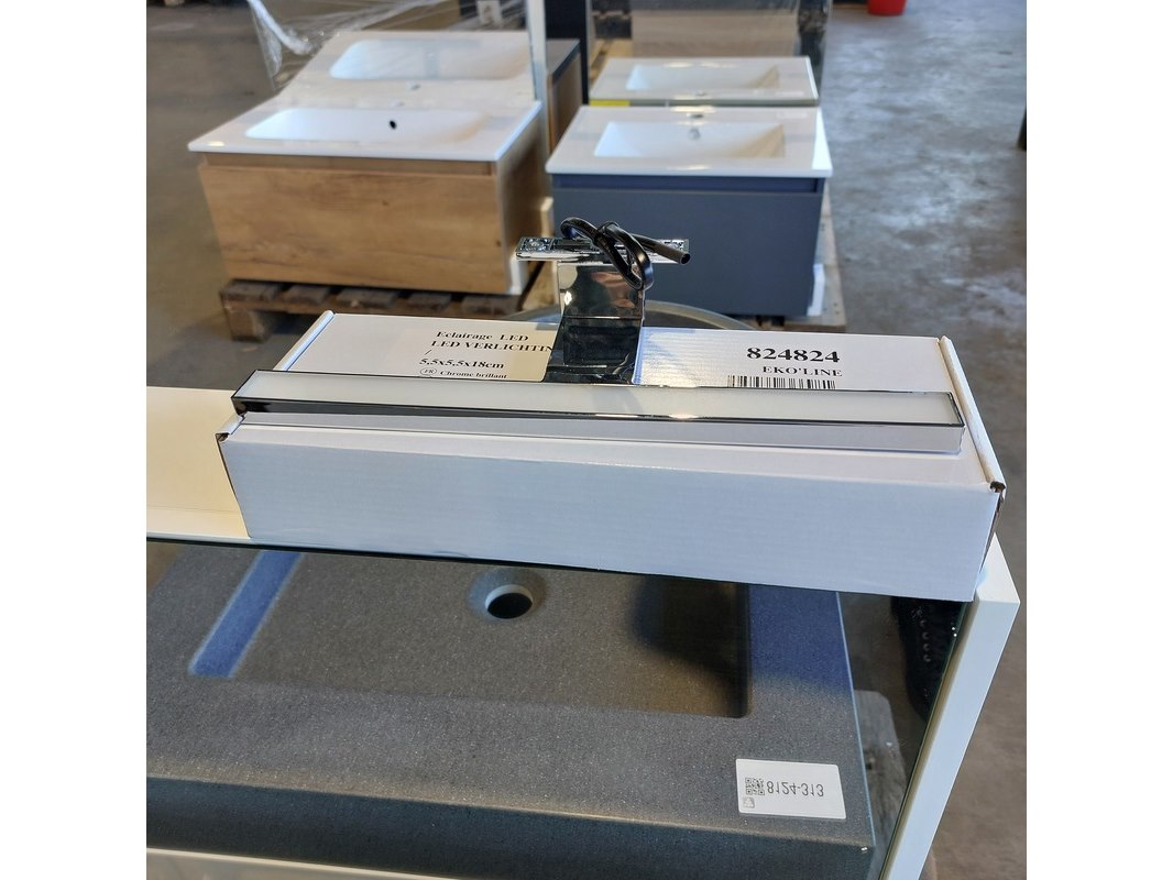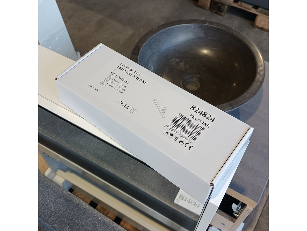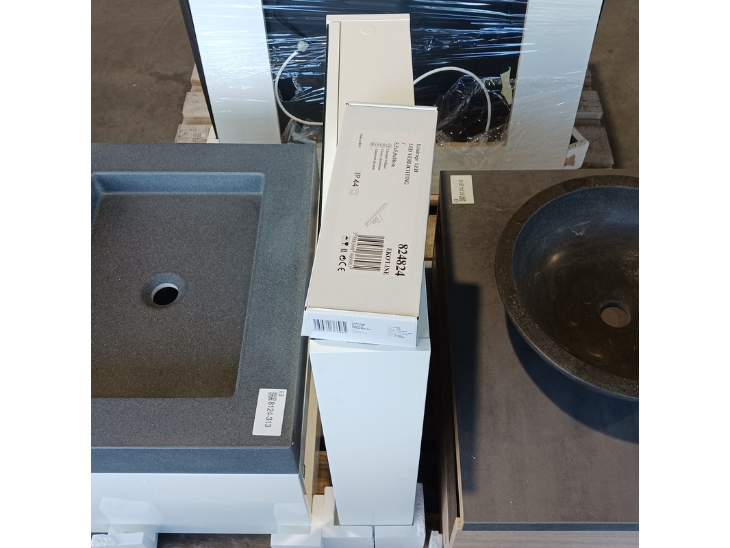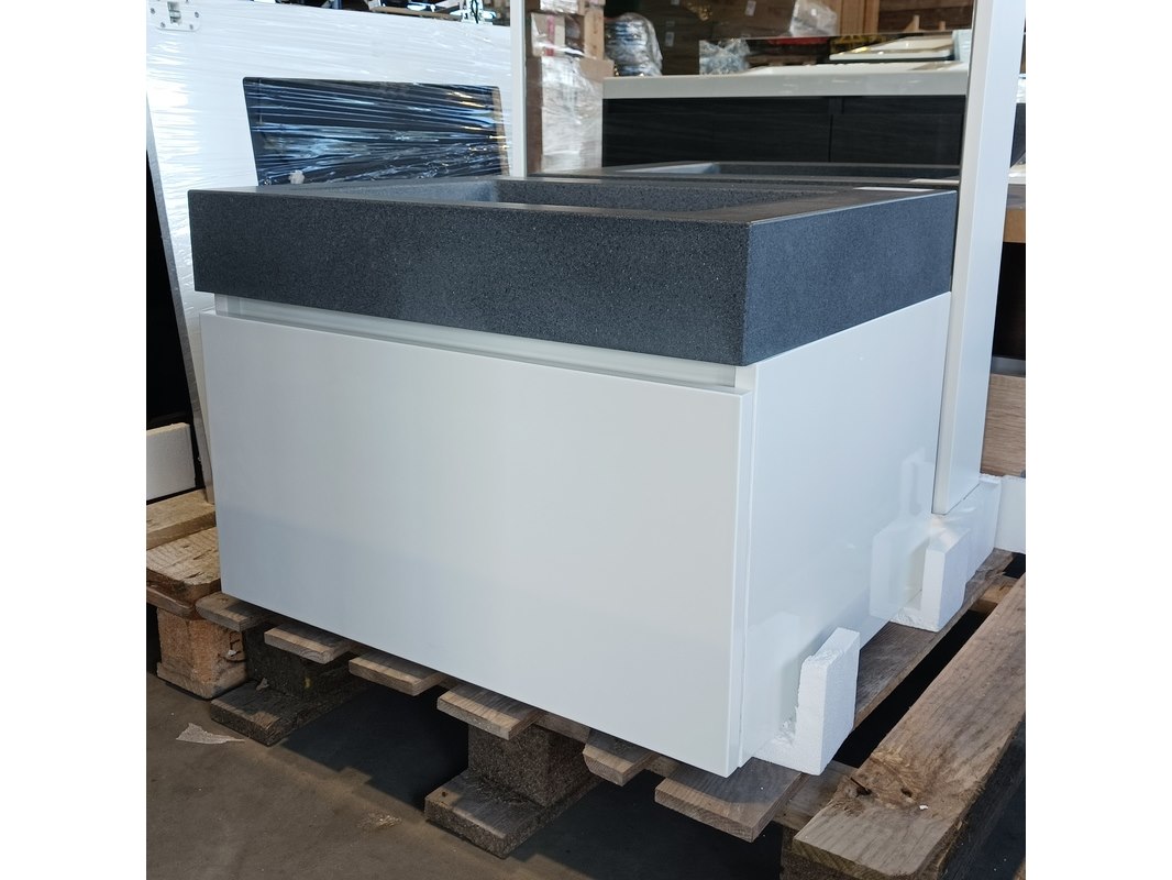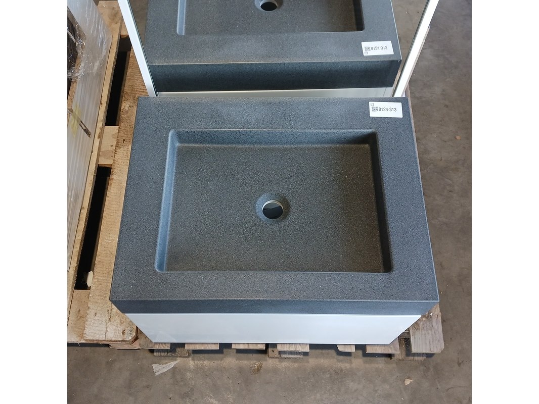 Merk: Dekker -Zevenhuizen Product: Badmeubel Kleur: Glans wit Afmeting: 60x46cm Conditie: Nieuw Specificaties: 1 lade met softclose, met Blum lade-geleiders, wastafel, composiet, grey, spiegelkast