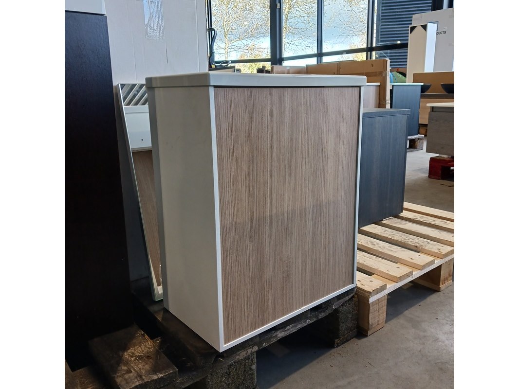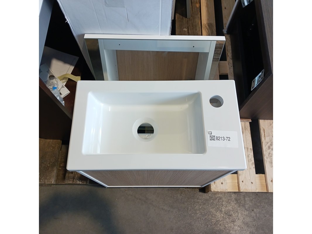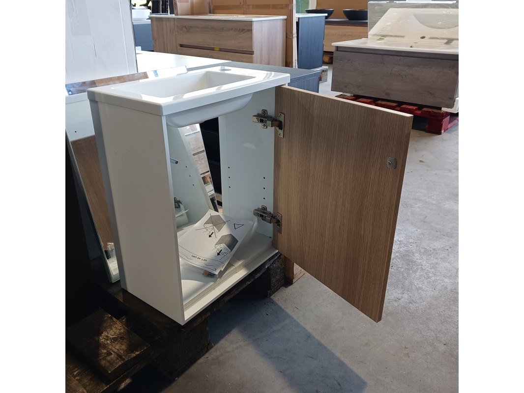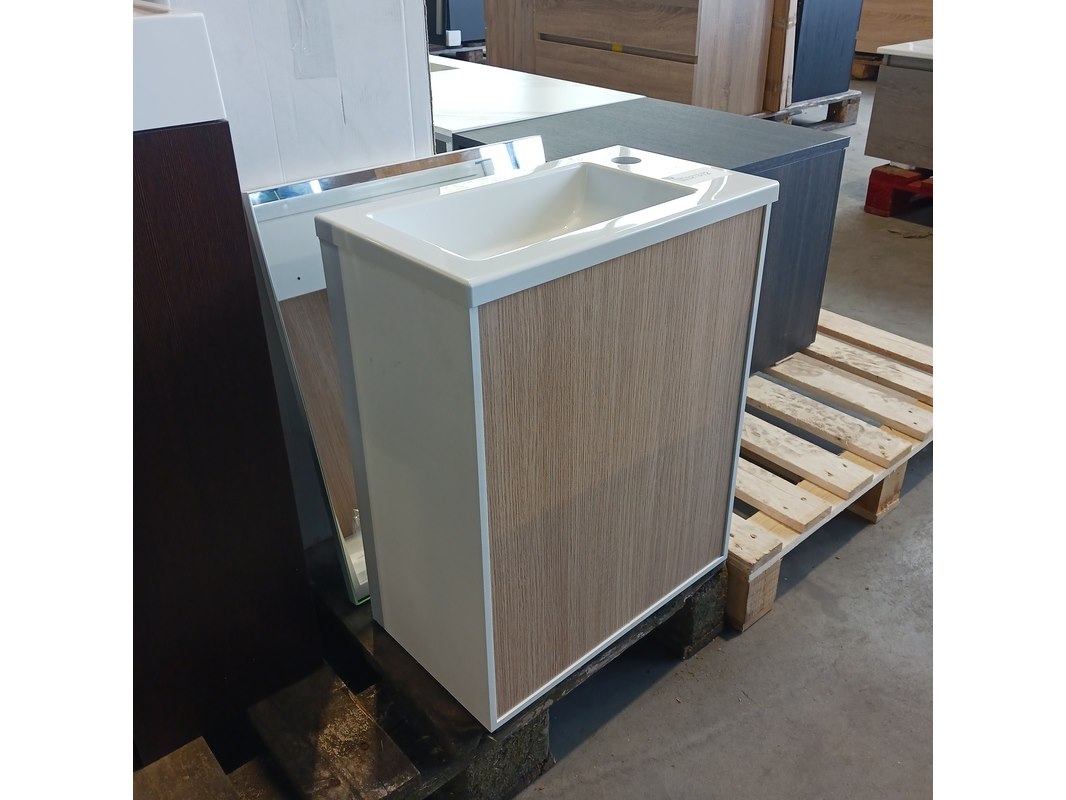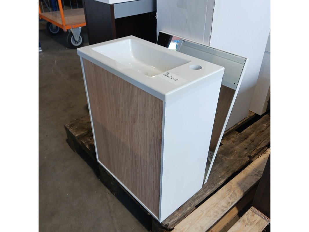 Product: Fonteinmeubel Kleur: Wit/eiken Afmeting: 41x23cm Specificaties: 1 deurtje , push open, polybeton fonteintje, spiegel, 51x41cm, totale hoogte 52cm