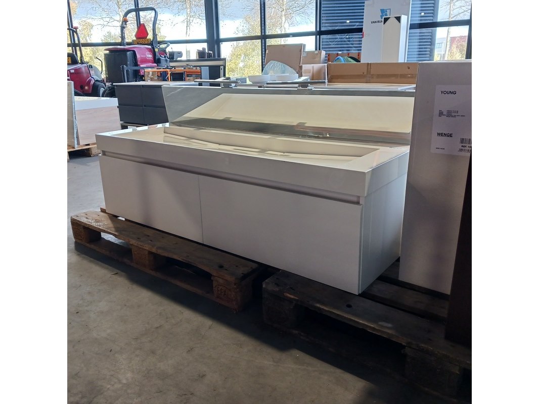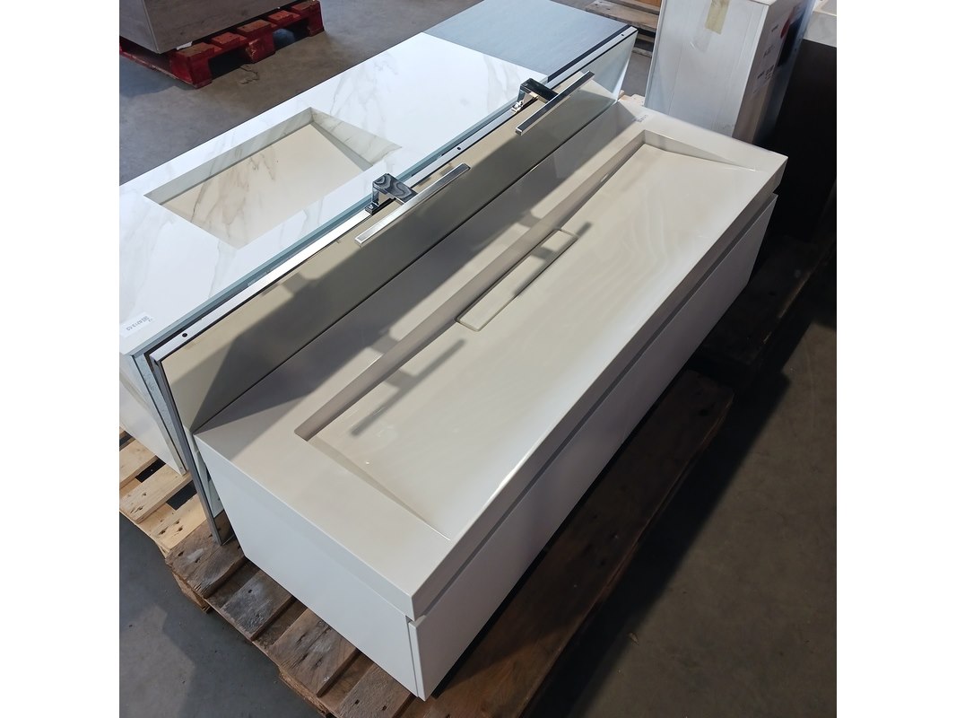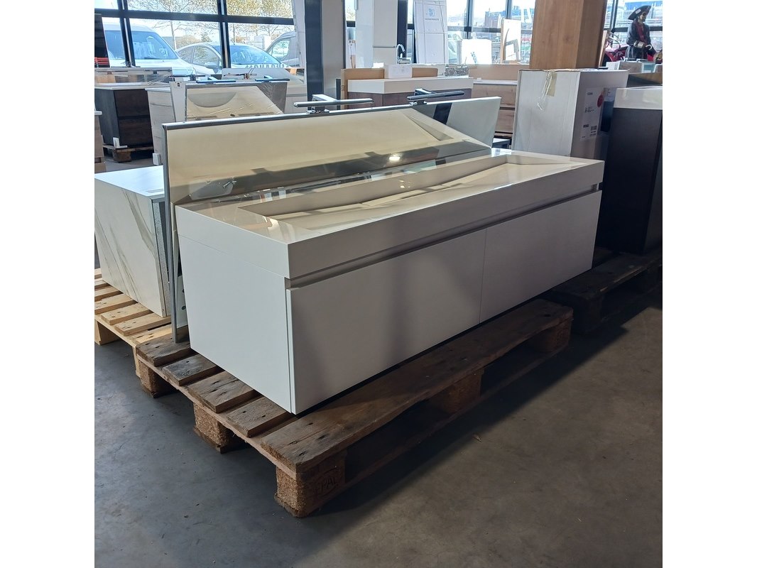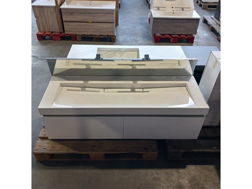 Merk: Blum Product: Badmeubel Kleur: Glanswit Afmeting: 150x50cm Specificaties: 2 lades met s.c. en Blum geleide systeem, polybeton wastafel met verdekte afvoer, spiegel, 150x65cm met 2x verlichting