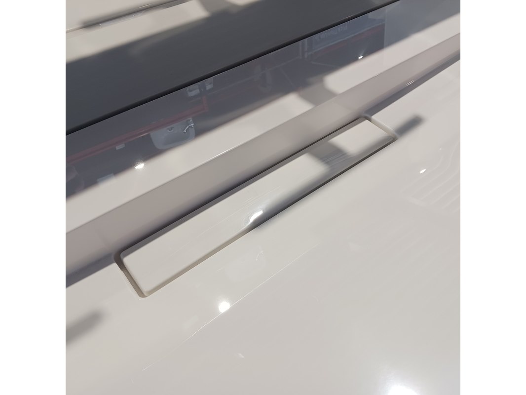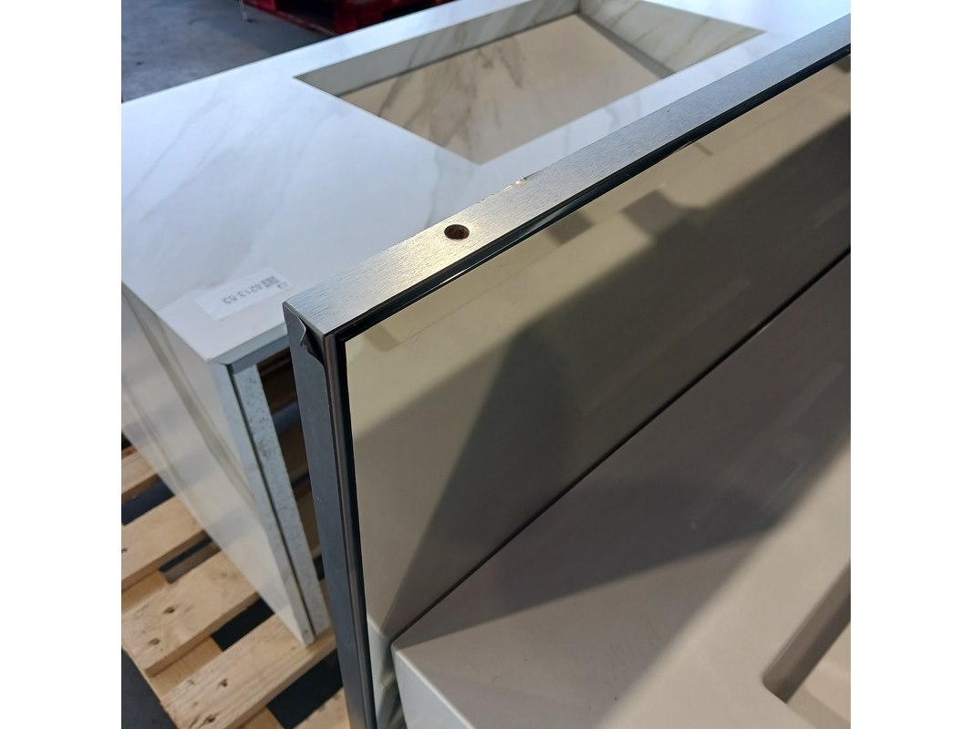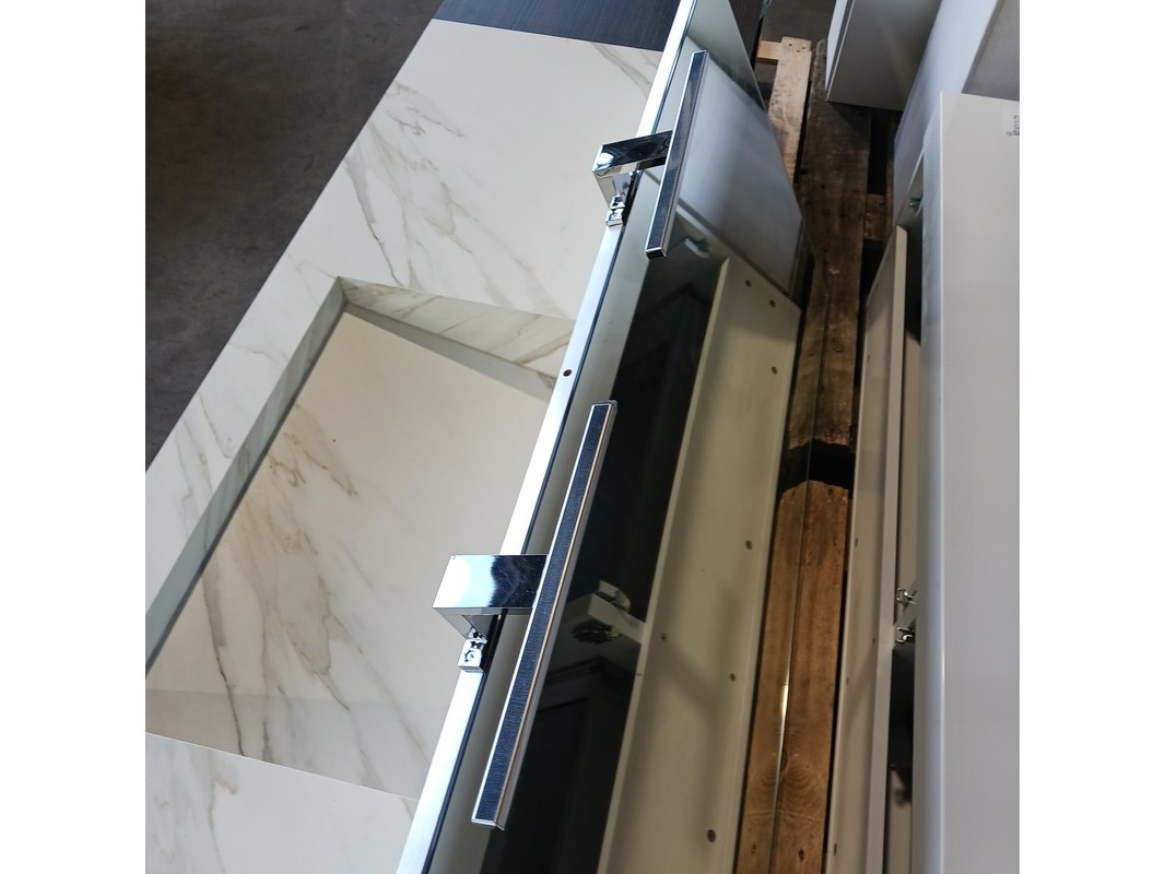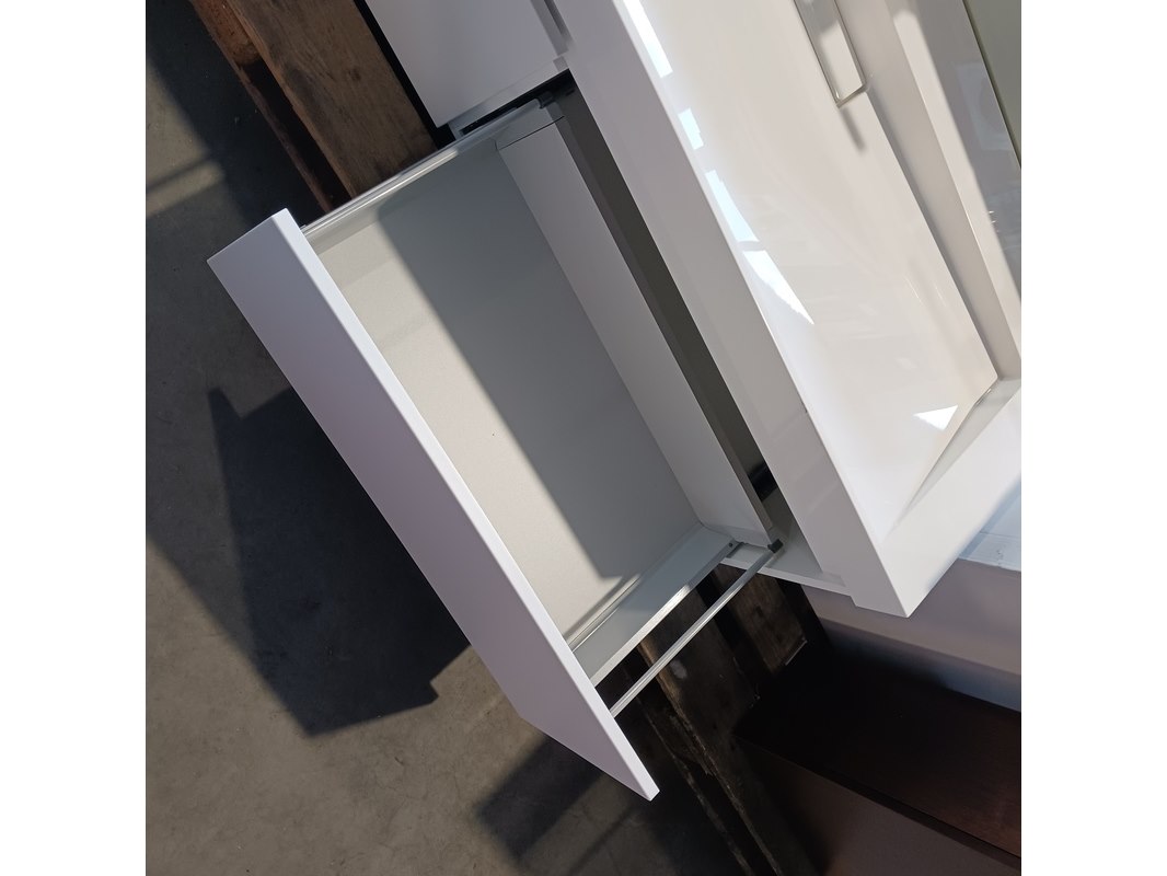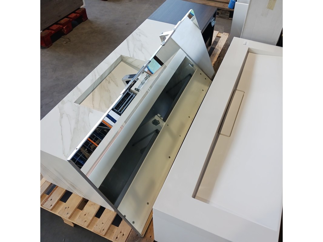 Merk: Blum Product: Badmeubel Kleur: Glanswit Afmeting: 150x50cm Specificaties: 2 lades met s.c. en Blum geleide systeem, polybeton wastafel met verdekte afvoer, spiegel, 150x65cm met 2x verlichting