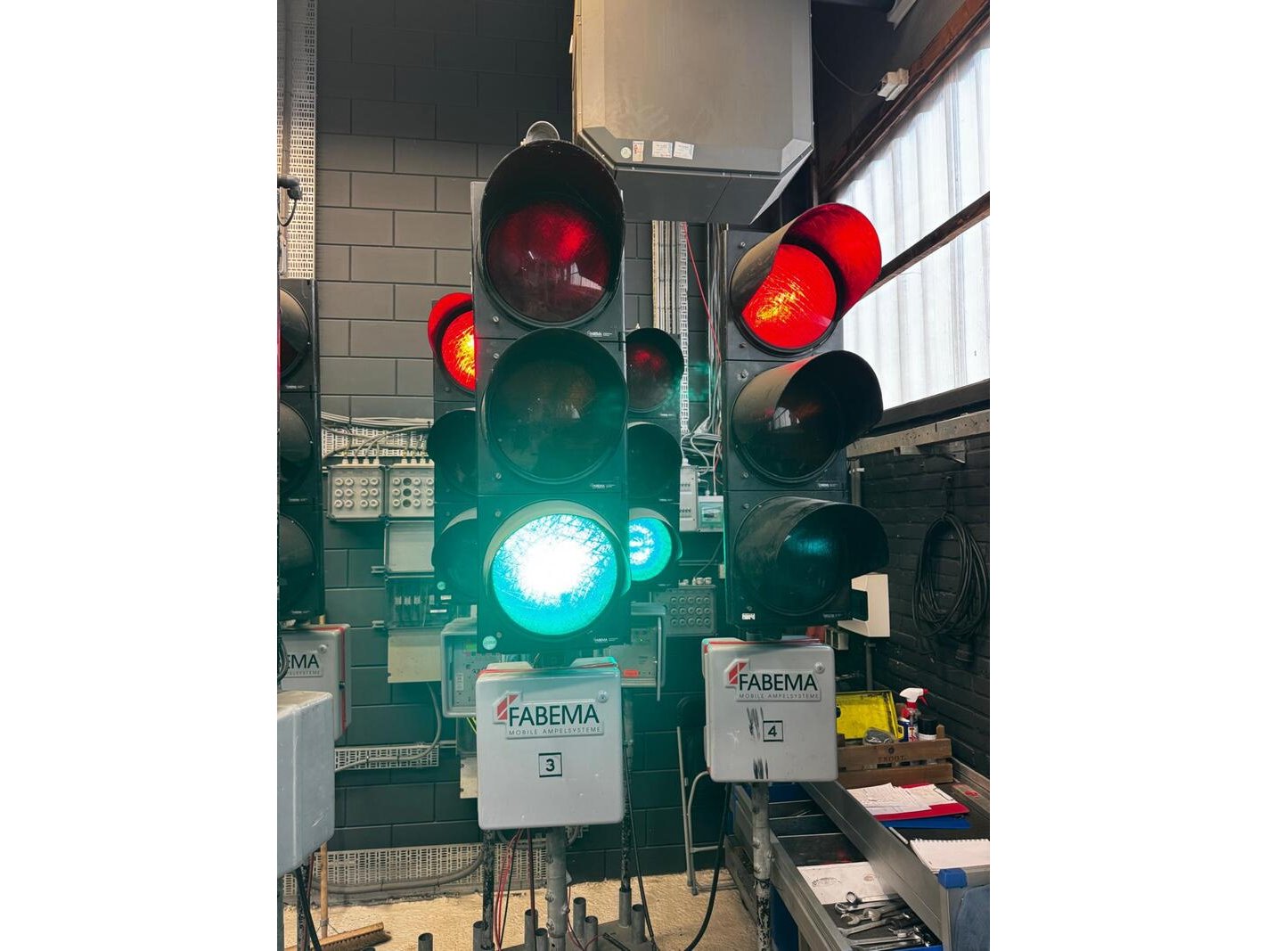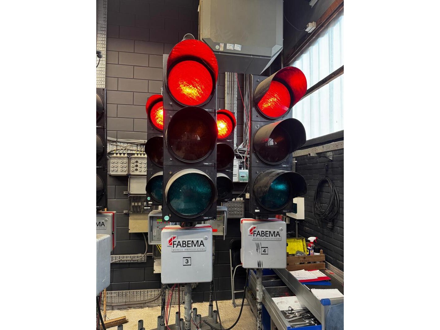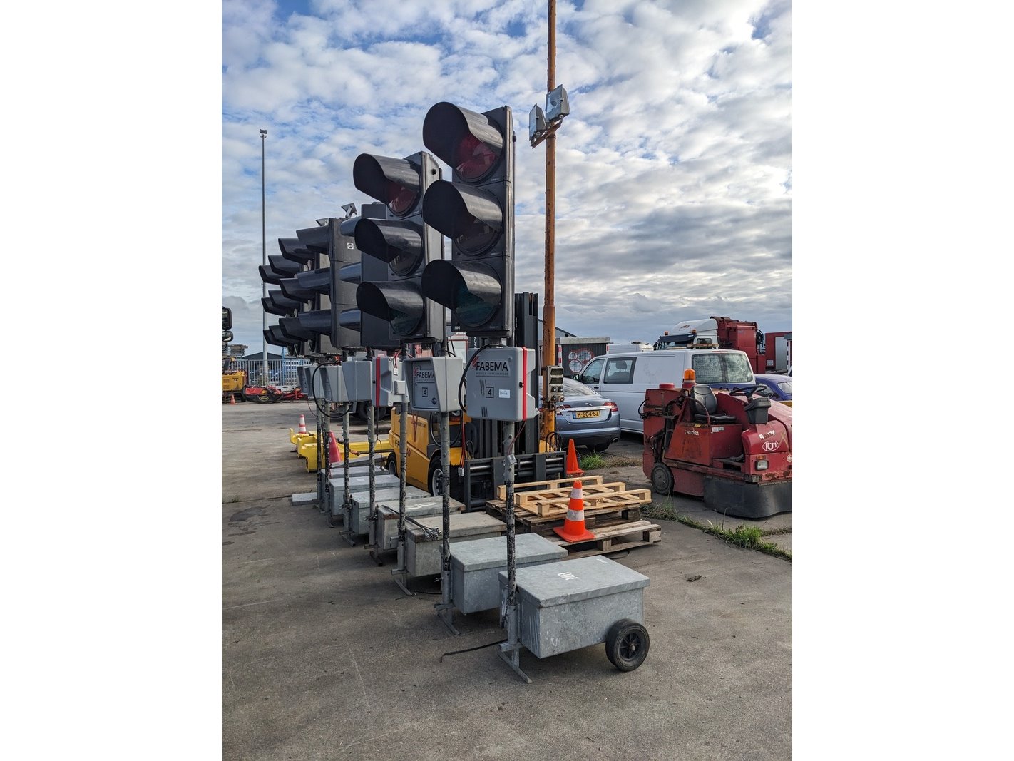 Merk: Fabema Product: Verkeerslicht Specificaties: 8 stuks Fabema EURO 2000 verkeerslichten, Radiografisch te bedienen(incl. antenne) Bekabeld te bedienen (niet bijgeleverd) met ledverlichting Diverse met detectiesensor t.b.v. voertuigafhankelijke instellingen met accubak (accu's niet meegeleverd)