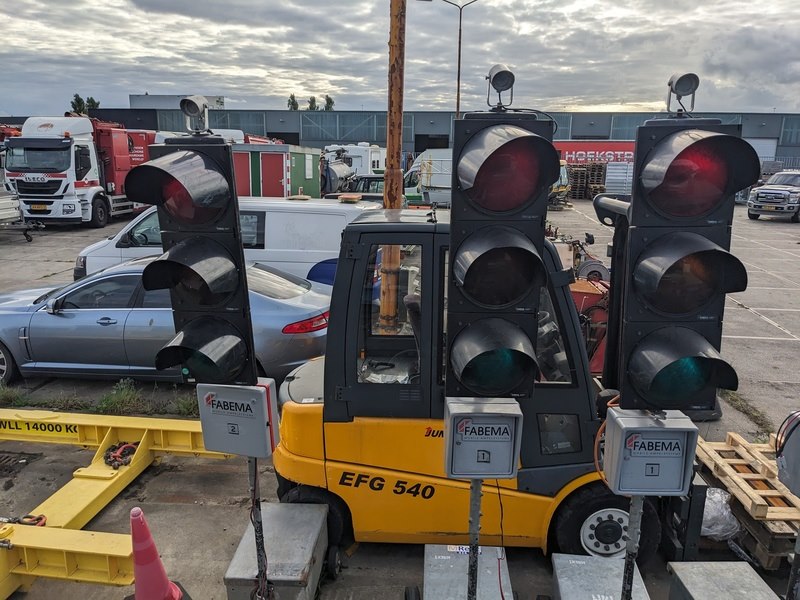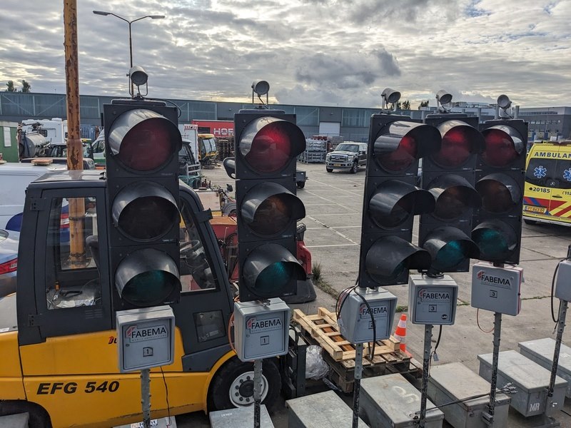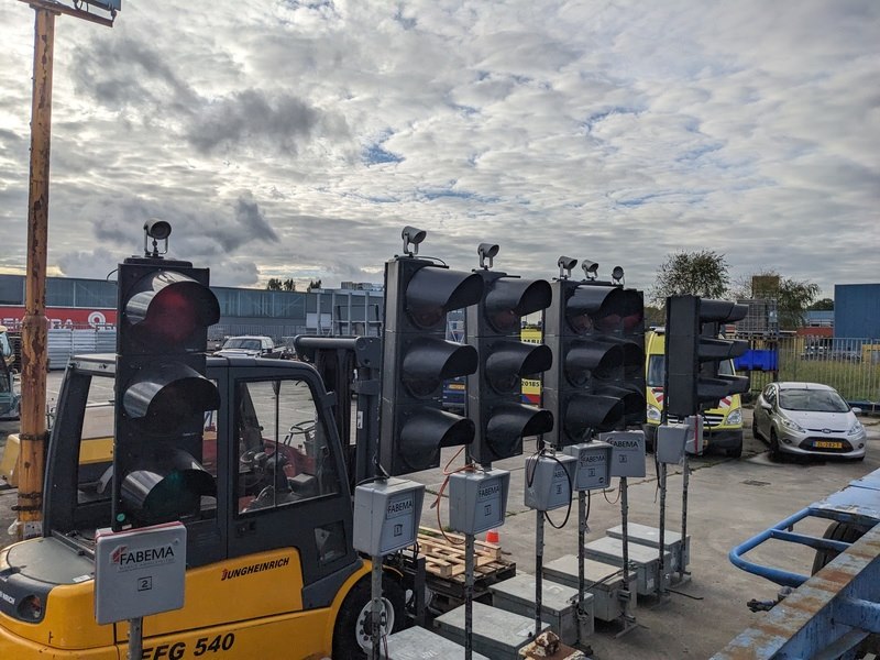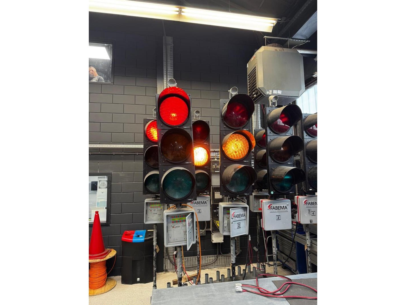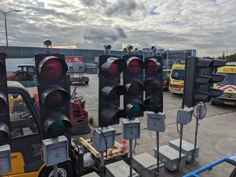 Merk: Fabema Product: Verkeerslicht Specificaties: 8 stuks Fabema EURO 2000 verkeerslichten, Radiografisch te bedienen(incl. antenne) Bekabeld te bedienen (niet bijgeleverd) met ledverlichting Diverse met detectiesensor t.b.v. voertuigafhankelijke instellingen met accubak (accu's niet meegeleverd)