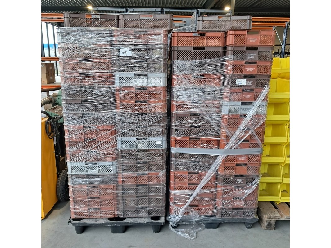 Product: Gebruikte Kratten Kleur: Bruin Materiaal: Kunststof Afmeting: 35x40x11 cm Conditie: Gebruikt Specificaties: 2 Pallets met gebruikte stapelkratten in 3 verschillende kleuren