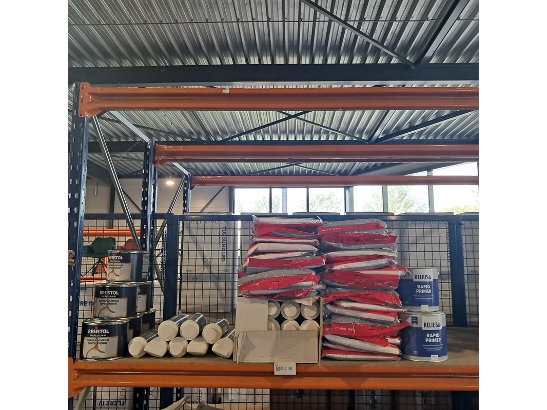 Product: Partij Verf en Non Paint Conditie: Nieuw Specificaties: Partij bestaande uit 3 x 2,5 Relius Rapid primer, 50 stuks Spuitoverall, diverse plamuren etc.