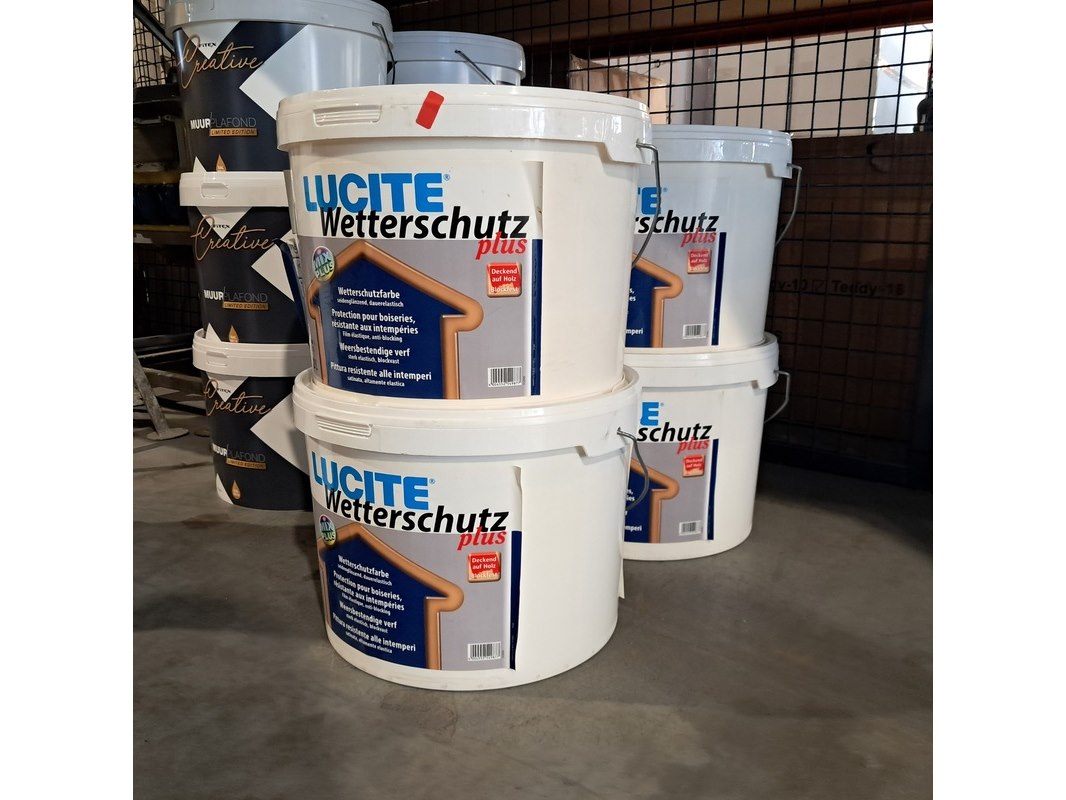 Merk: Lucite Product: Buitenlatex Kleur: Wit Afmeting: 4 x 12 liter Conditie: Nieuw Specificaties: Profesionele buitenlatex in wit
