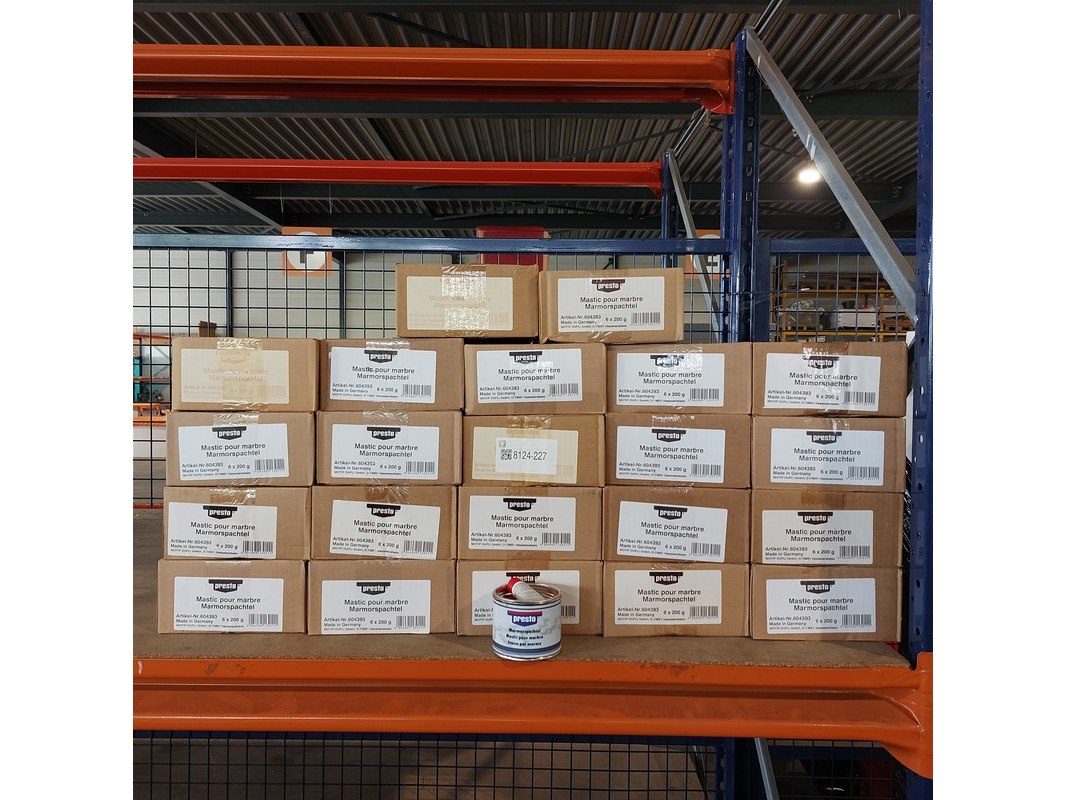 Product: Presto 2k marmerplamuur/ reparatie pasta Conditie: Nieuw Specificaties: 18 dozen a 6stuks Presto 2K marmerplamuur totaal 108stuks a 200g