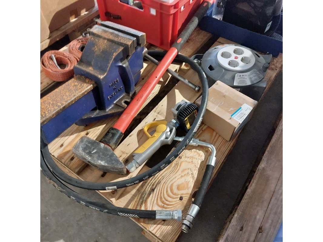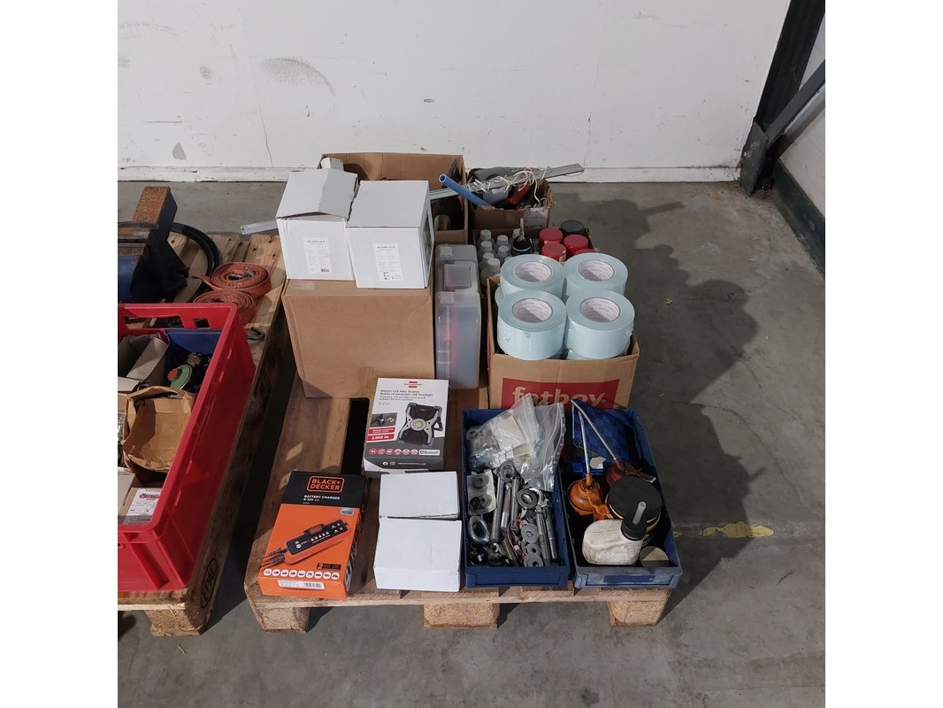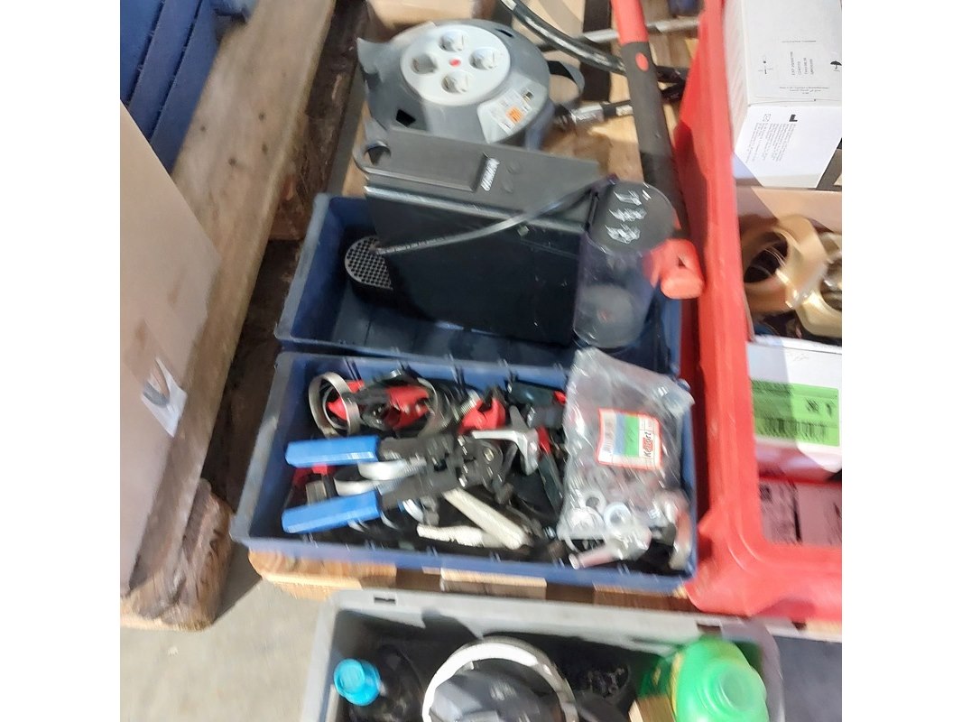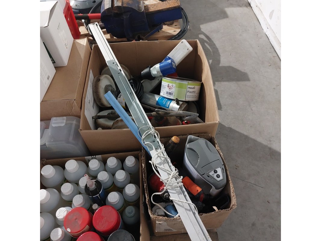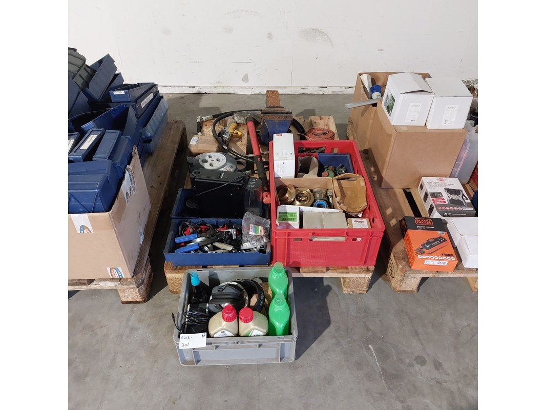 Product: Partij diversen Conditie: Gebruikt Specificaties: Bestaande uit o.a.: Diverse magazijn bakken, bankschroef, moker, divers handgereedschap, koffiezetapparaat, diverse vloeistoffen, divers ijzerwaar, batterij lader Black+Decker, mobiele Led-accu-werklamp, installatiemateriaal, etc.