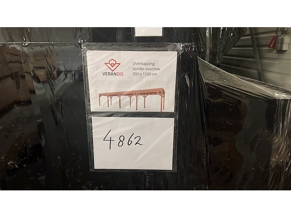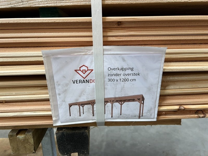 Merk: Verando Product: Overkapping 300x1200cm Materiaal: Douglas hout Conditie: Nieuw Specificaties: Deze overkapping bestaat uit hoogwaardige, bezaagde, Europese, douglashouten onderdelen en wordt geleverd als een compleet pakket inclusief bevestigingsmaterialen en een duidelijke, stapsgewijze handleiding voor de montage. Specificaties: •Palen van 12 × 12 cm •Ringbalk van 5 × 15 cm (bij 400 cm diepte 7,5 x 17,5 cm) •Balklaag van 5 x 15 cm •Dakbeschot van 1,8 cm •Boeiboorden van 2,5 × 20 cm •Schoren van 5 × 15 cm •Bezaagd Europees douglas hout •Inclusief alle benodigde bevestigingsmaterialen •Heldere en gebruiksvriendelijke montagehandleiding