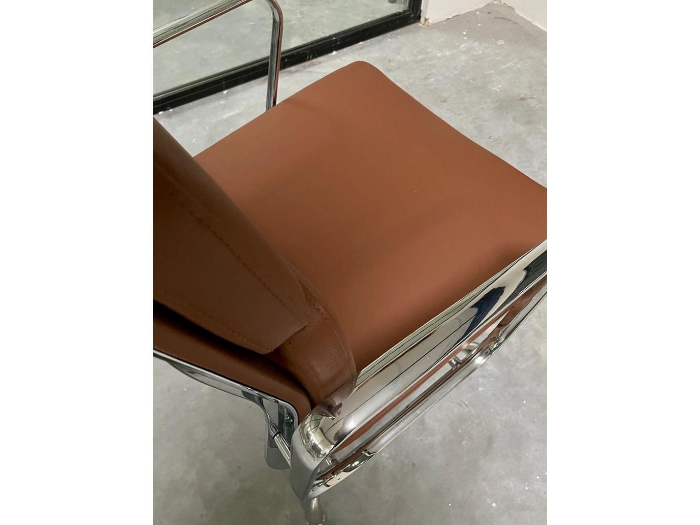 Merk: Replica Product: Eames EA208 softpad bureaustoel in cognac leer Kleur: Cognac / Chroom Materiaal: Verchroomd staal / Leder Afmeting: B58 D54 cm, zithoogte van 45 cm Conditie: Nieuw Specificaties: Nieuw in verpakking.