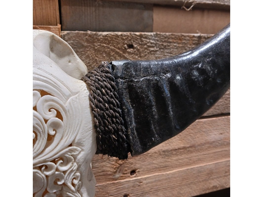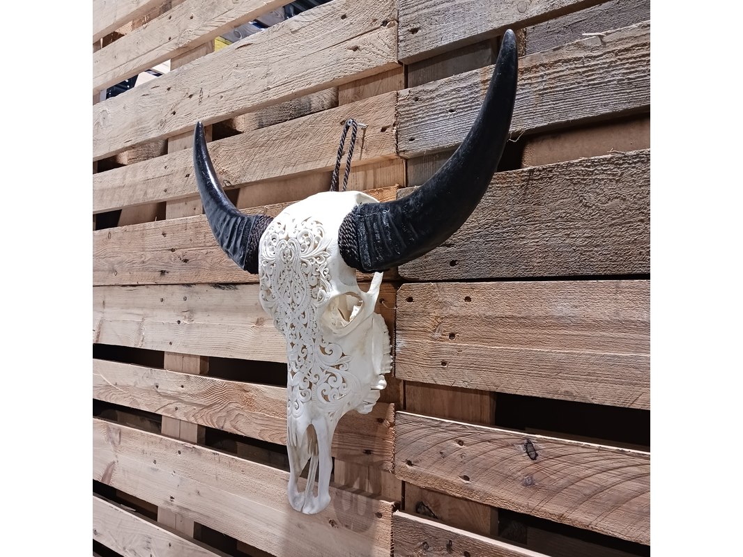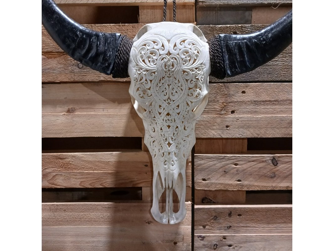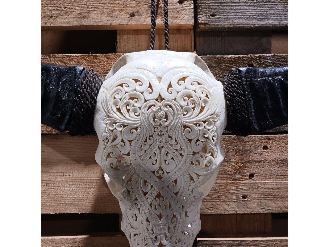 Product: Large hand gegraveerde Buffalo schedel Materiaal: Been Afmeting: B64 x H60cm BouwJaar: 2024 Conditie: Nieuw Specificaties: Nieuw en ongebruikt. Met de hand gegraveerde buffel schedel. Schedel zonder hoorn is B20 x H45cm