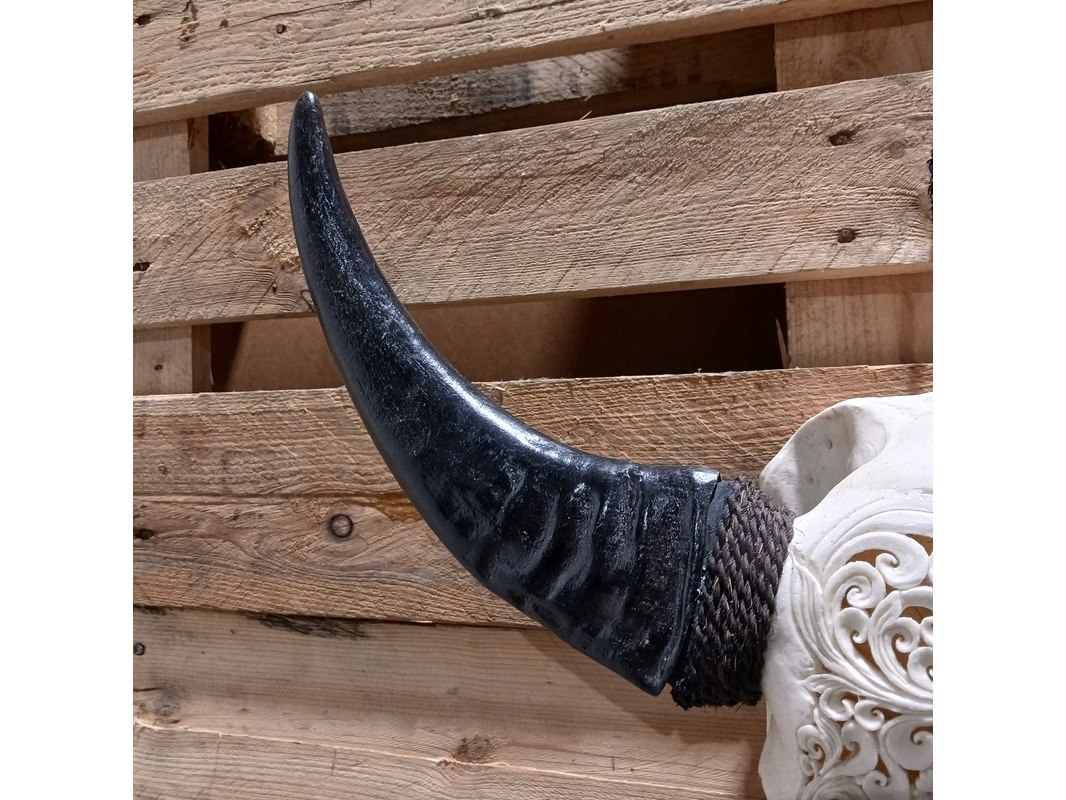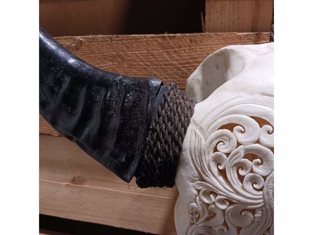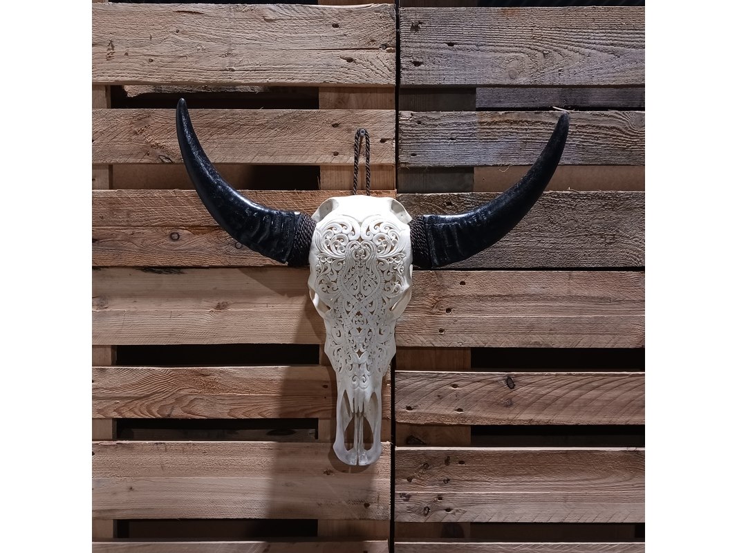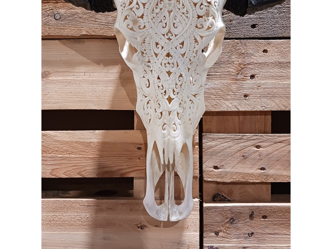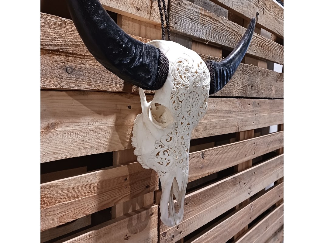 Product: Large hand gegraveerde Buffalo schedel Materiaal: Been Afmeting: B64 x H60cm BouwJaar: 2024 Conditie: Nieuw Specificaties: Nieuw en ongebruikt. Met de hand gegraveerde buffel schedel. Schedel zonder hoorn is B20 x H45cm