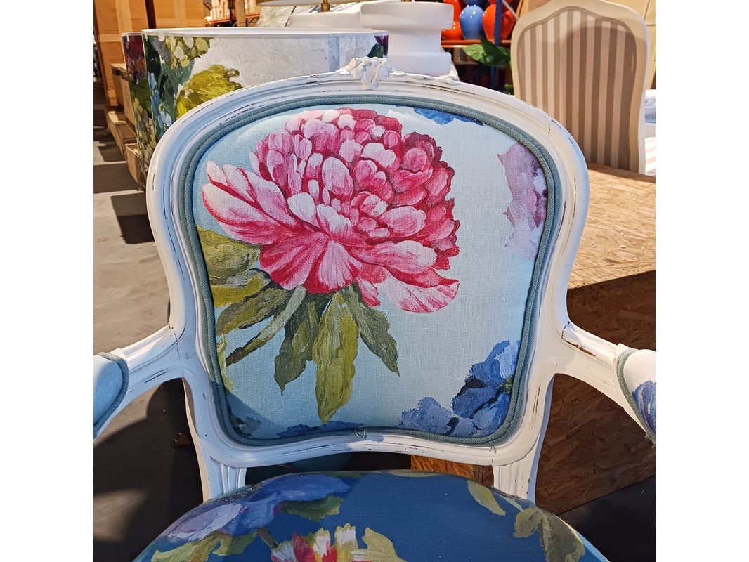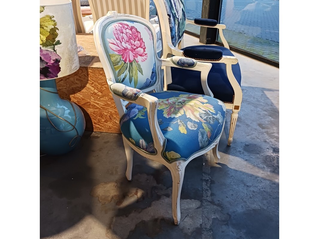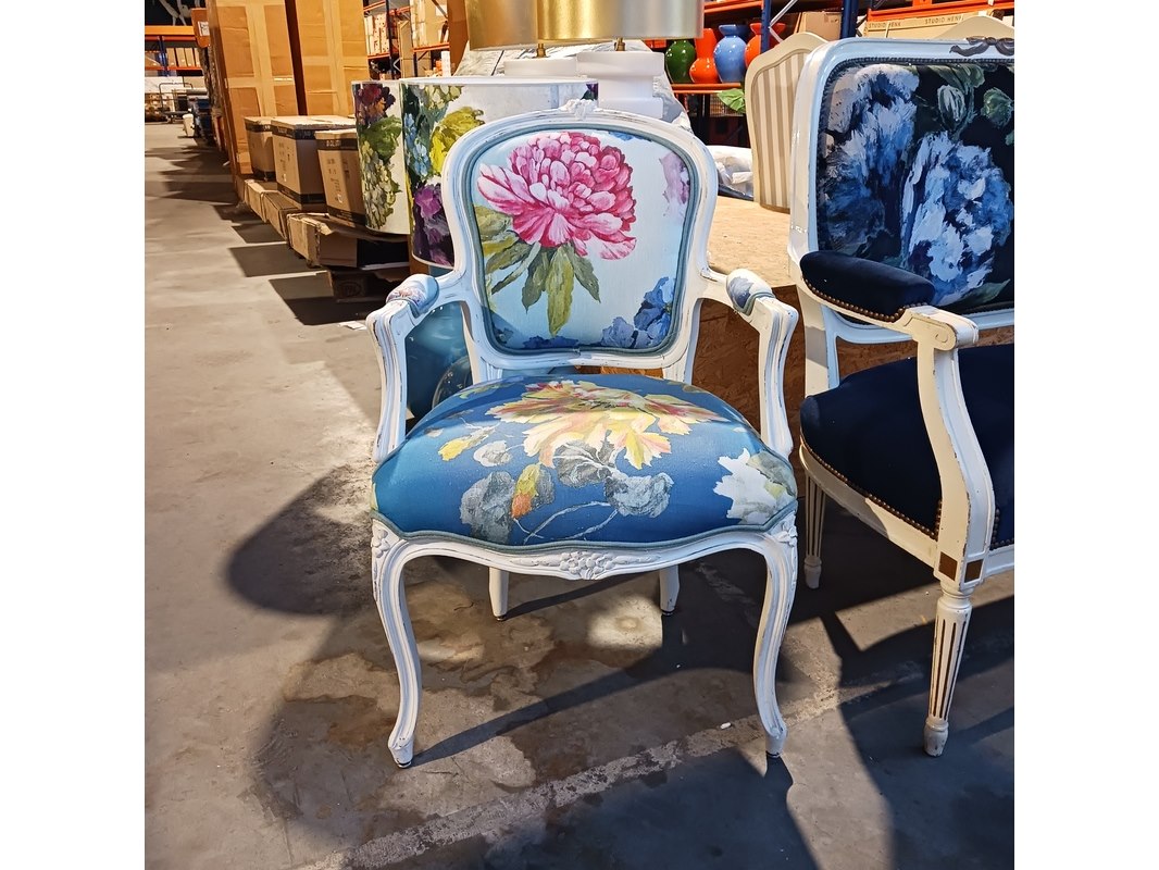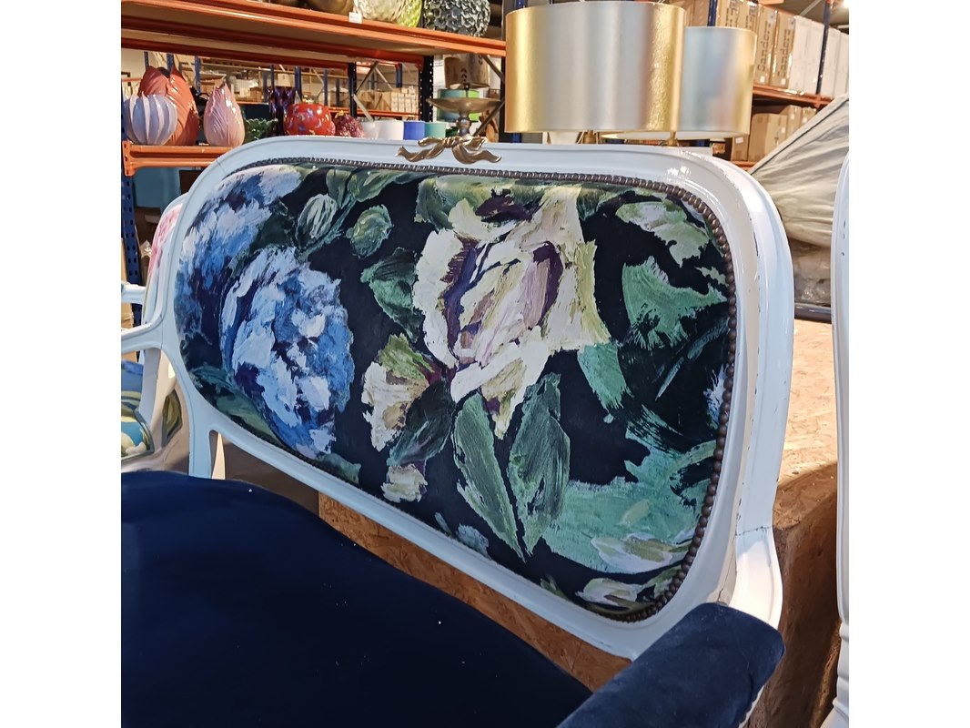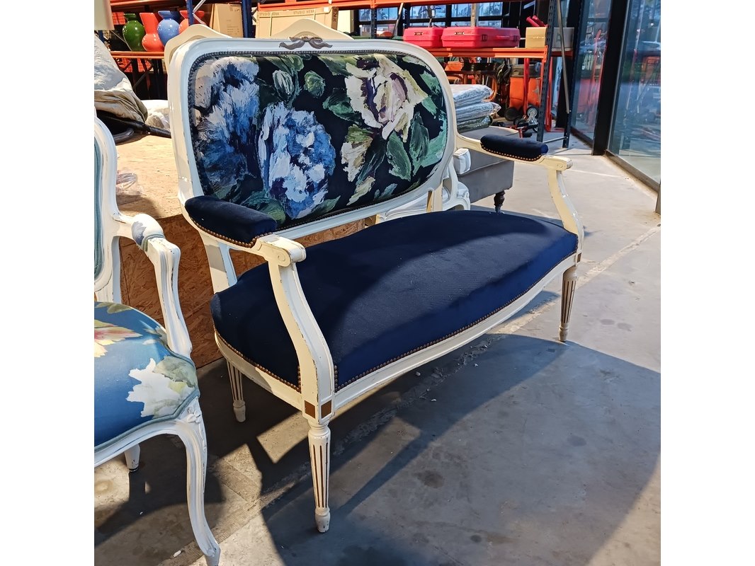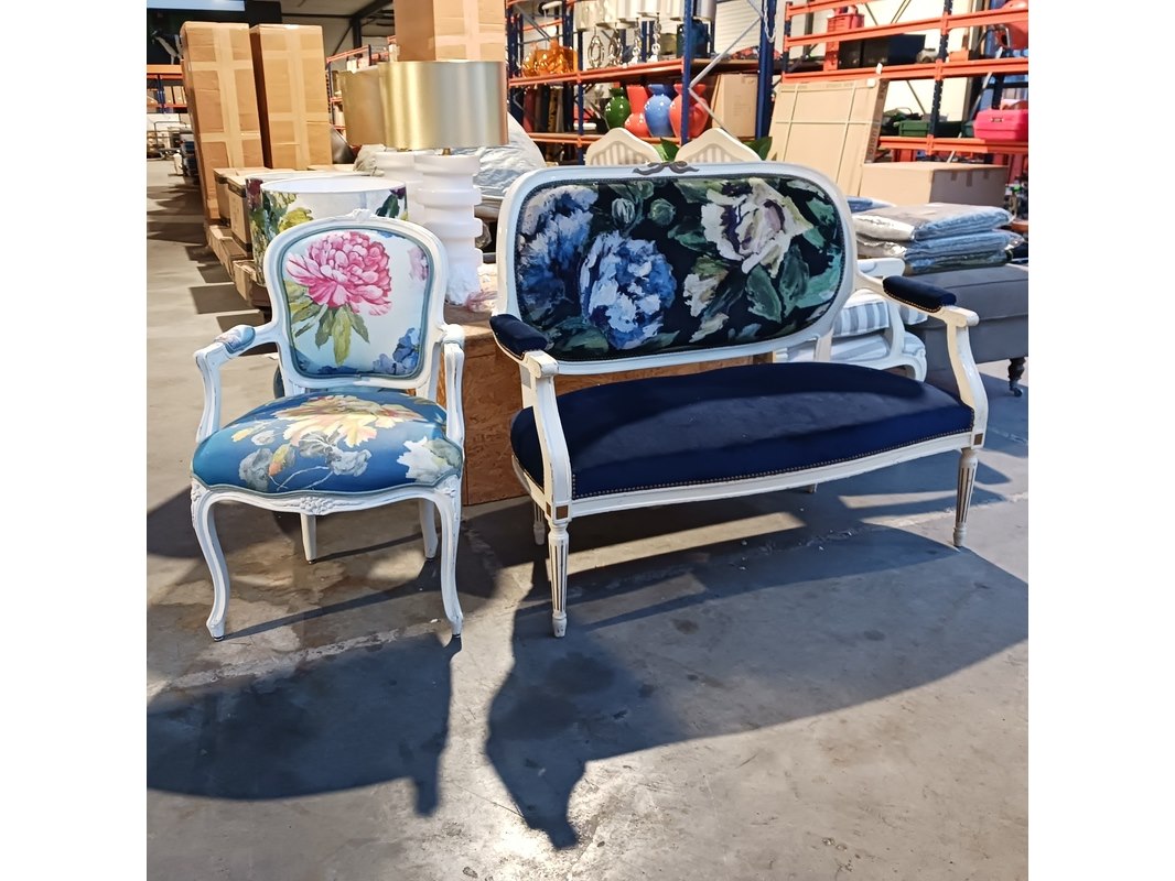 Merk: By Louise Product: Vintage 2-zits bank en stoel Specificaties: De bank is nieuw gestoffeerd met stof van Designers Guild Bank, zithoogte ca. 42 cm, totale hoogte ca. 97 cm, breedte ca. 118 cm. Stoel, zithoogte ca. 45 cm, totale hoogte ca. 88 cm, breedte ca. 58 cm