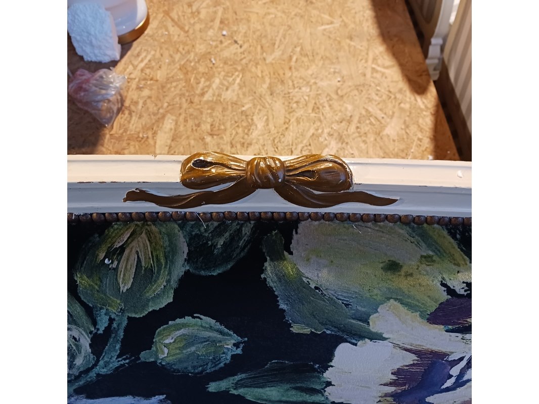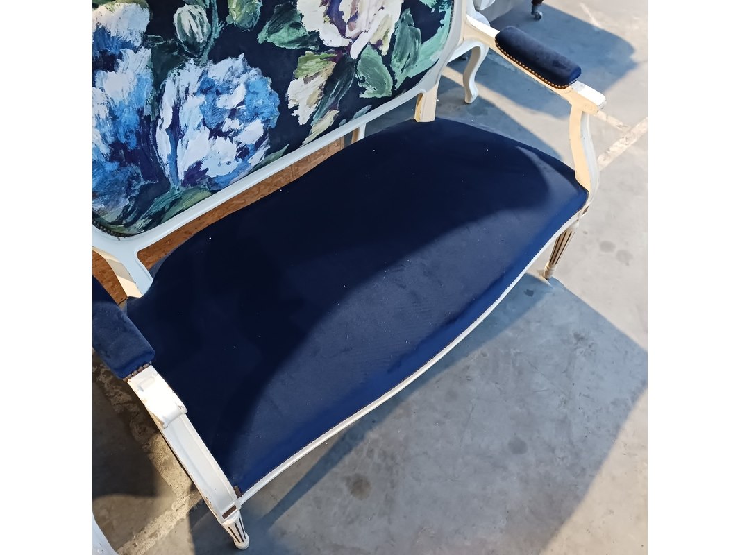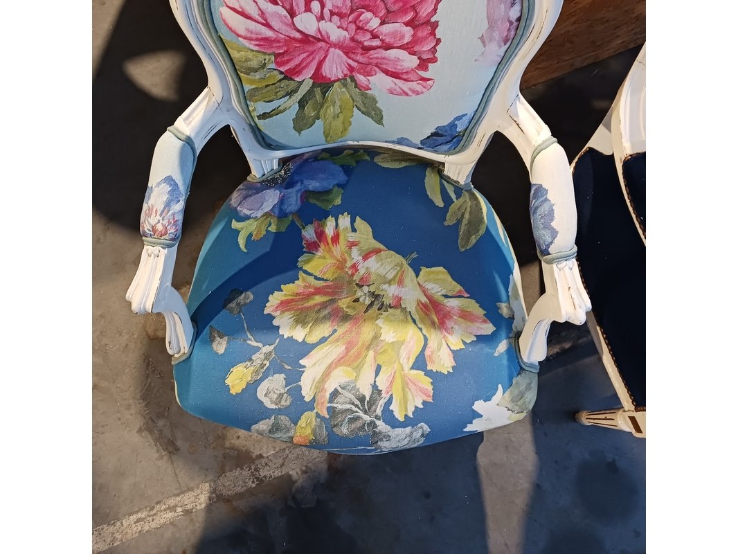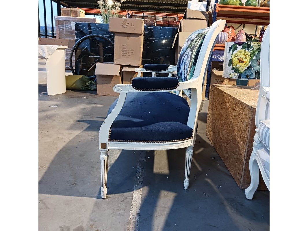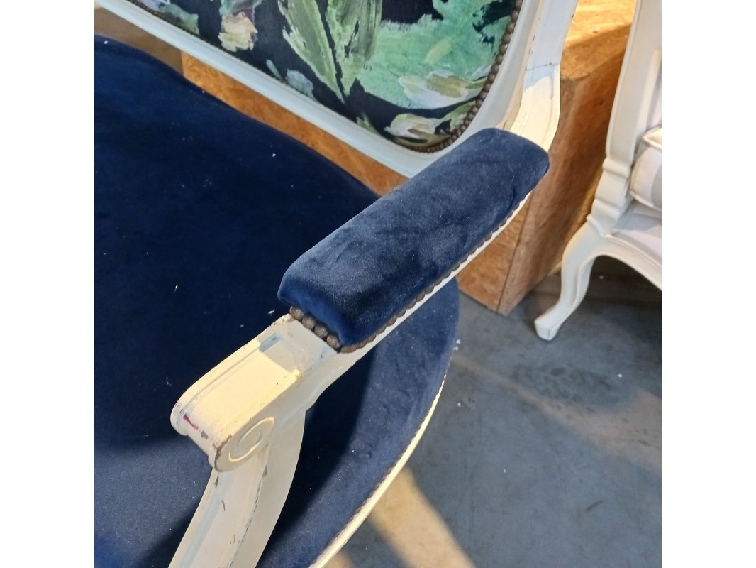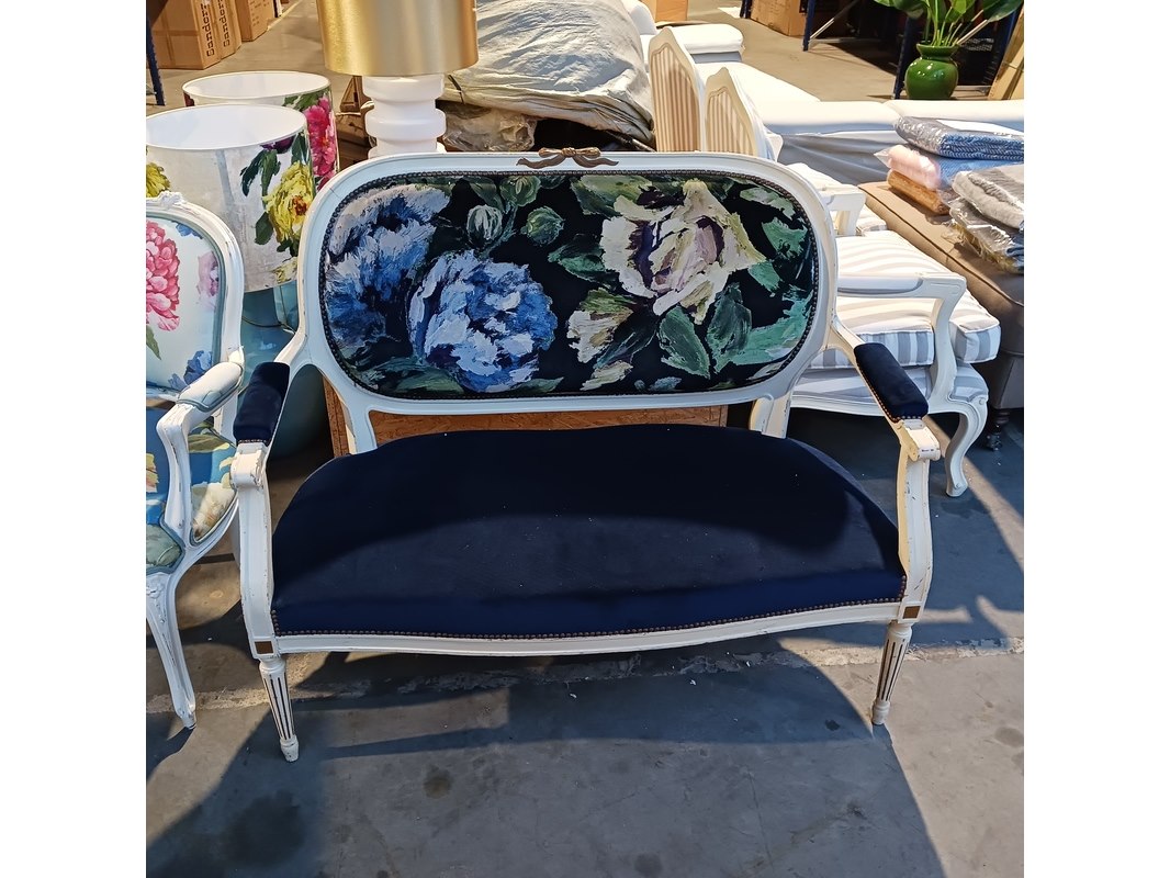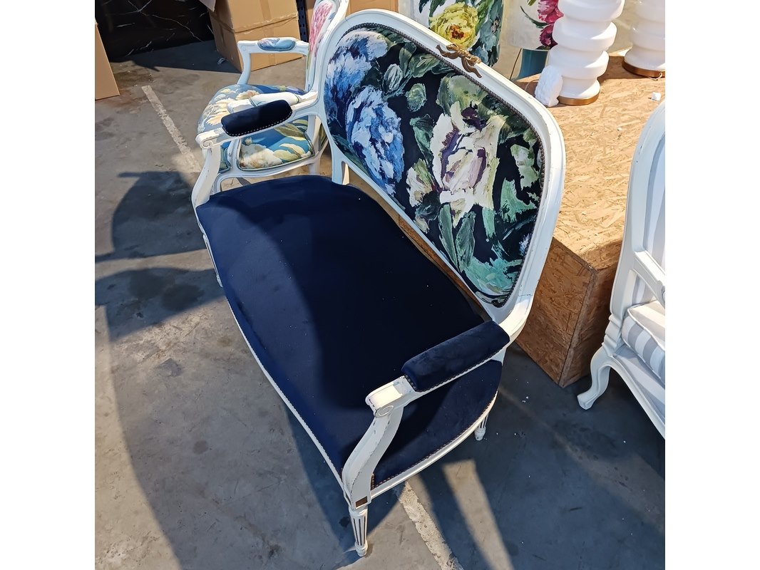Merk: By Louise Product: Vintage 2-zits bank en stoel Specificaties: De bank is nieuw gestoffeerd met stof van Designers Guild Bank, zithoogte ca. 42 cm, totale hoogte ca. 97 cm, breedte ca. 118 cm. Stoel, zithoogte ca. 45 cm, totale hoogte ca. 88 cm, breedte ca. 58 cm