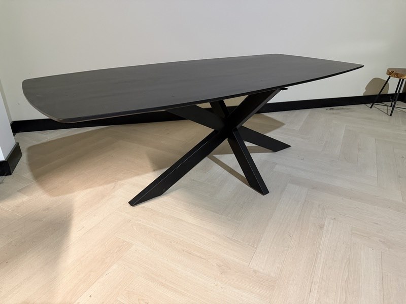 Merk: Richfield Product: Eettafel – Deens Ovaal – Zwart – 200 cm – Nieuw Onderstel Kleur: Zwart Materiaal: Eikenfineer Afmeting: 200x100x76cm BouwJaar: 2025 Specificaties: Strakke en moderne eettafel met een Deens ovaal blad in een tijdloze zwarte afwerking. De afgeronde vormen geven de tafel een elegante uitstraling die perfect past in zowel moderne als industriële interieurs. Specificaties: Lengte: 200 cm Vorm: Deens ovaal Kleur: Zwart Onderstel: Nieuw, nog in de doos Dankzij het slanke design is de tafel ideaal voor 6 tot 8 personen. Het minimalistische uiterlijk maakt deze tafel gemakkelijk te combineren met verschillende stoelen en stijlen. Let op: Het tafelblad kan lichte gebruikssporen bevatten (bijvoorbeeld door showroomgebruik), maar het onderstel is nieuw en ongebruikt – nog verpakt in de originele doos.
