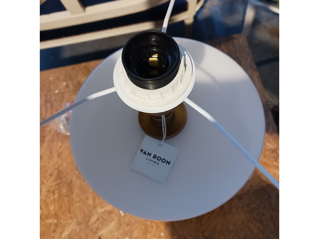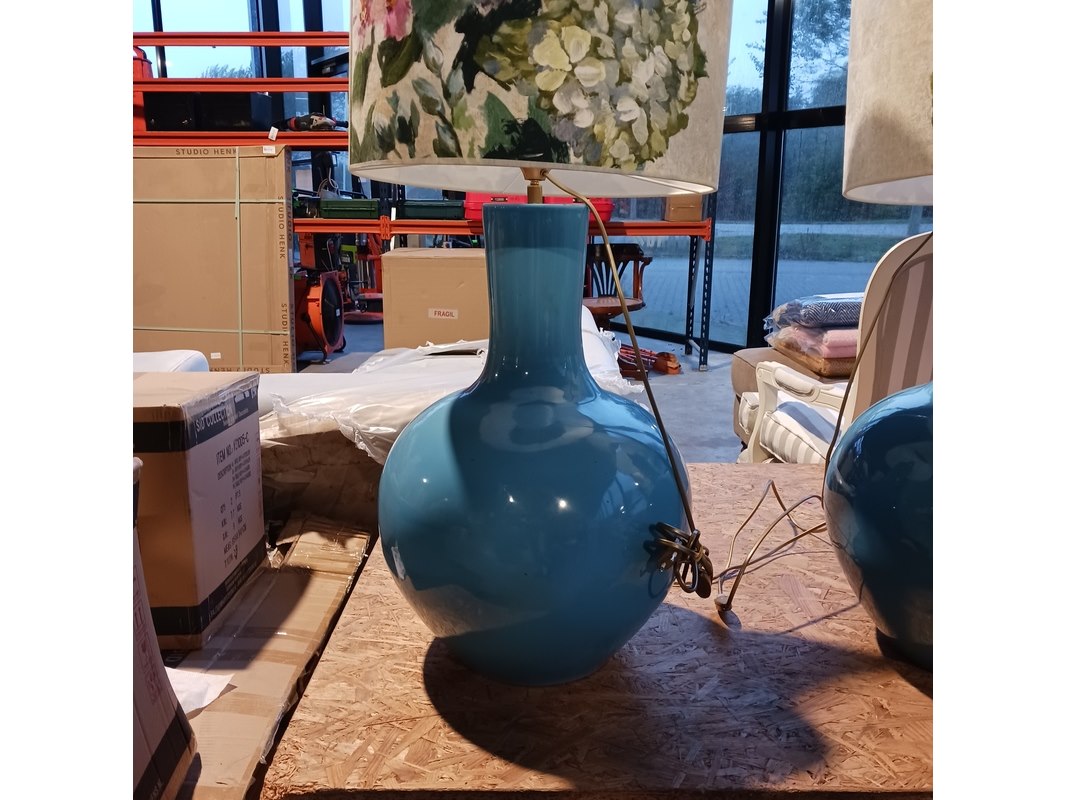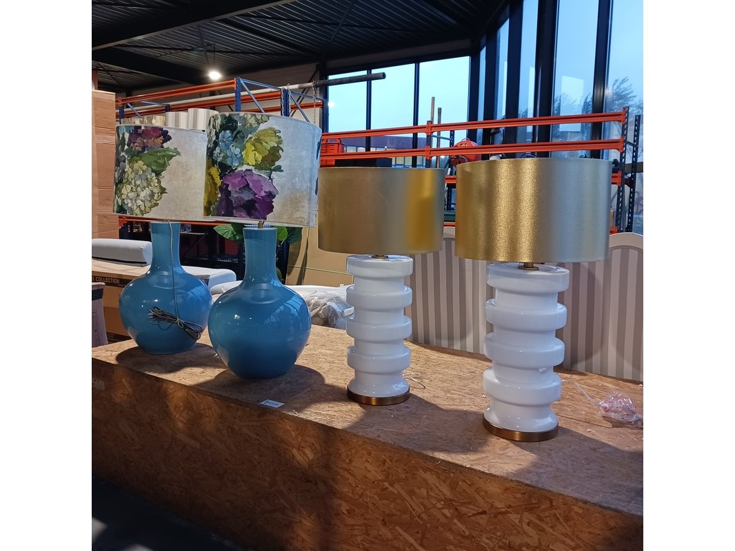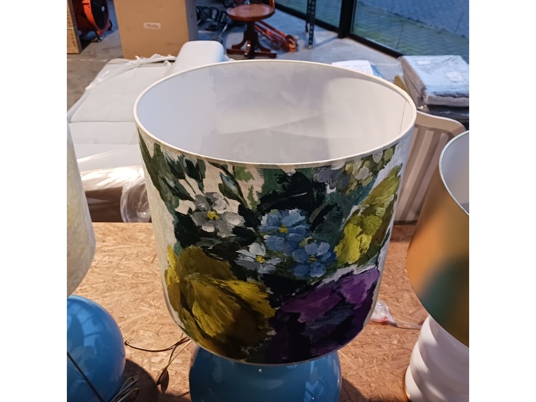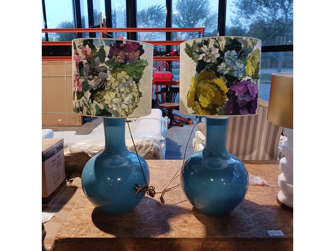 Merk: By Louise Product: XL Tafel lamp Specificaties: 2x kap Designers Guild en 2x kap van Roon 2x hoogte ca. 74 cm, 2x hoogte ca. 91 cm