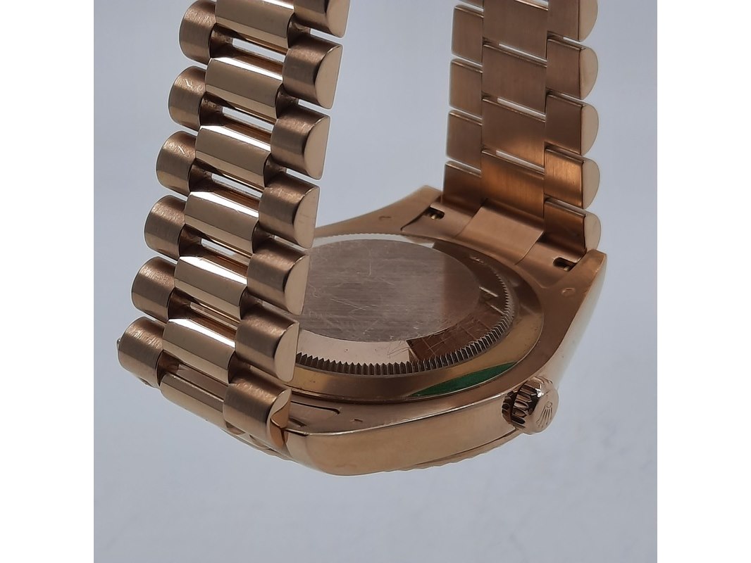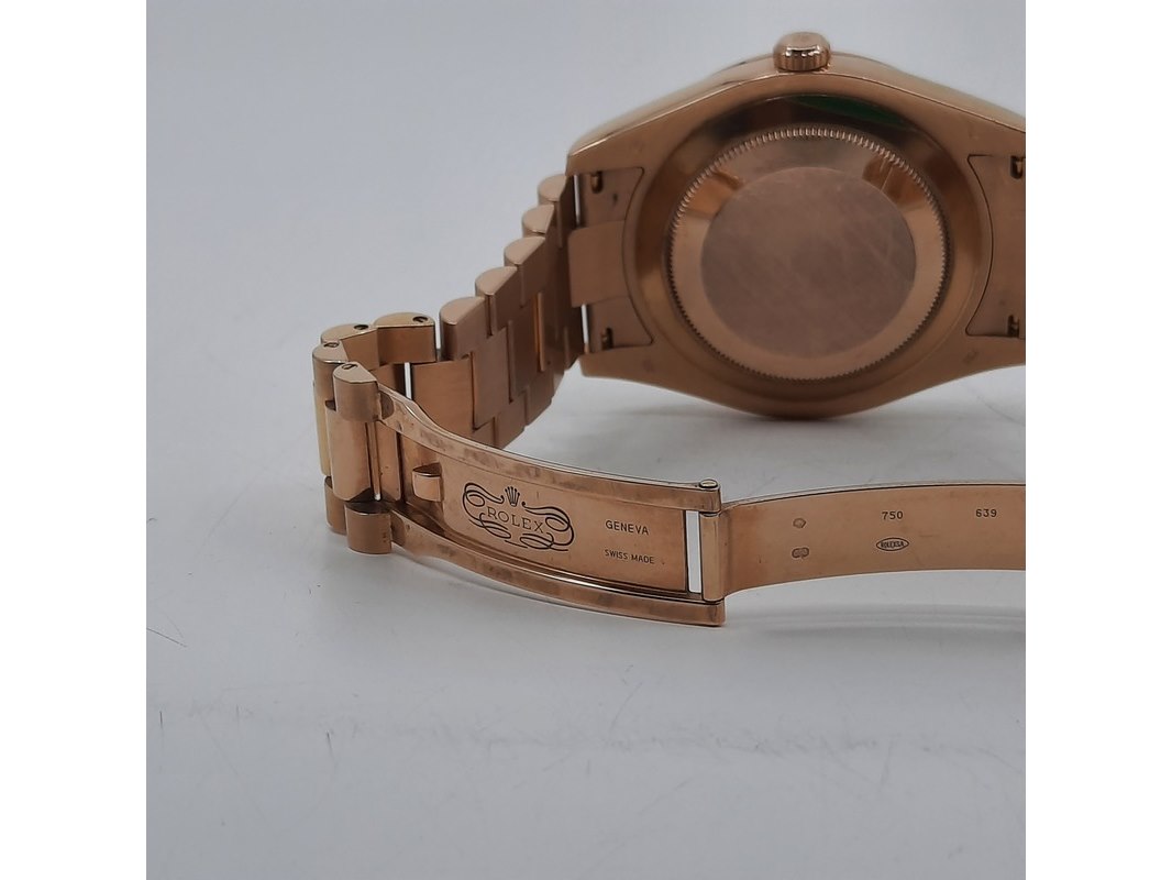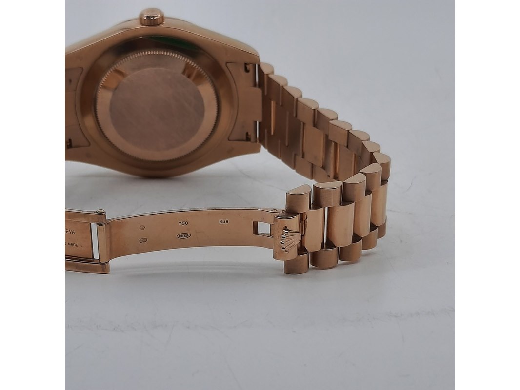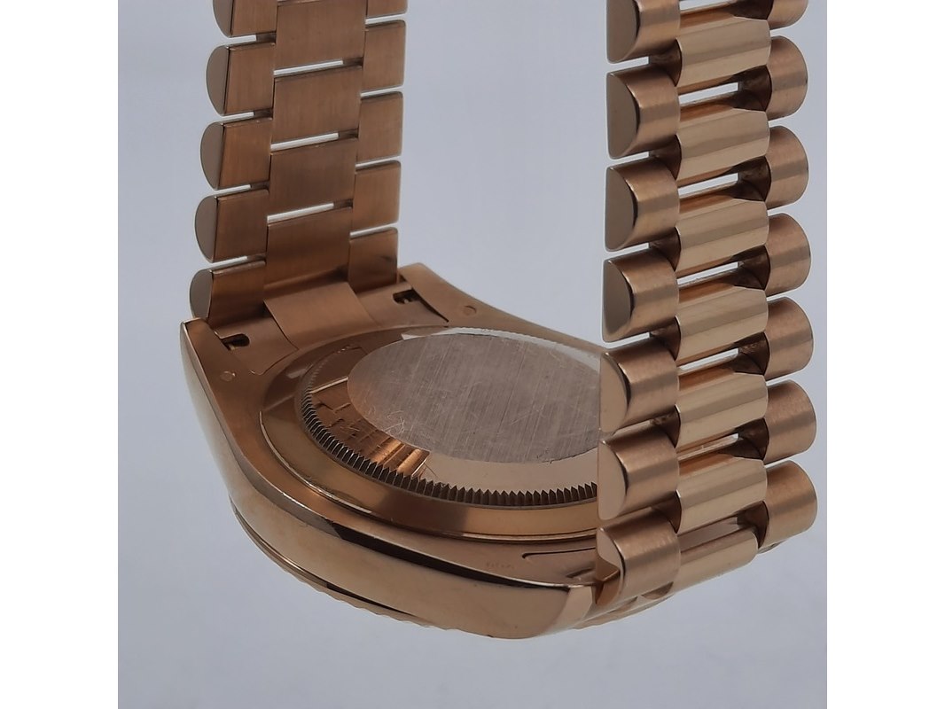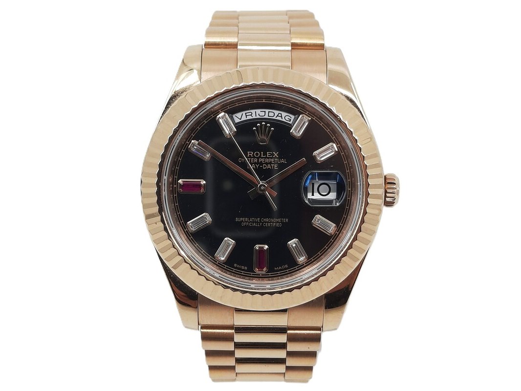 Merk: Rolex Product: Heren polshorloge Conditie: gebruikt Specificaties: Een roségouden heren polshorloge, Rolex Day-Date 218235. Met zwarte wijzerplaat, diamant en robijn indices en roségouden President model band. Gehalte '750', bruto gewicht ca. 207,5 gram. Glas licht beschadigd aan de rand. Inclusief doos, certificaat en reserveschakels. Documentatie van 5-2015. Plastic laagje pasje laat los.