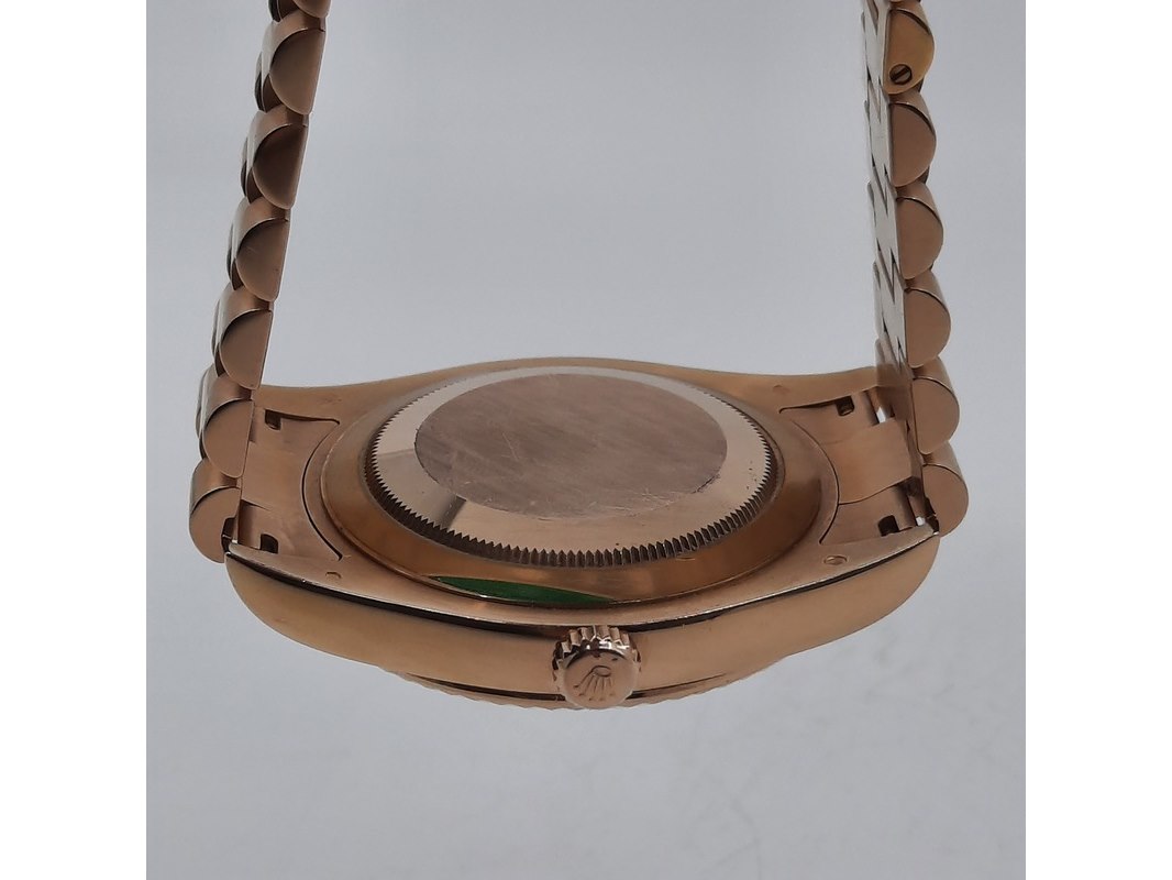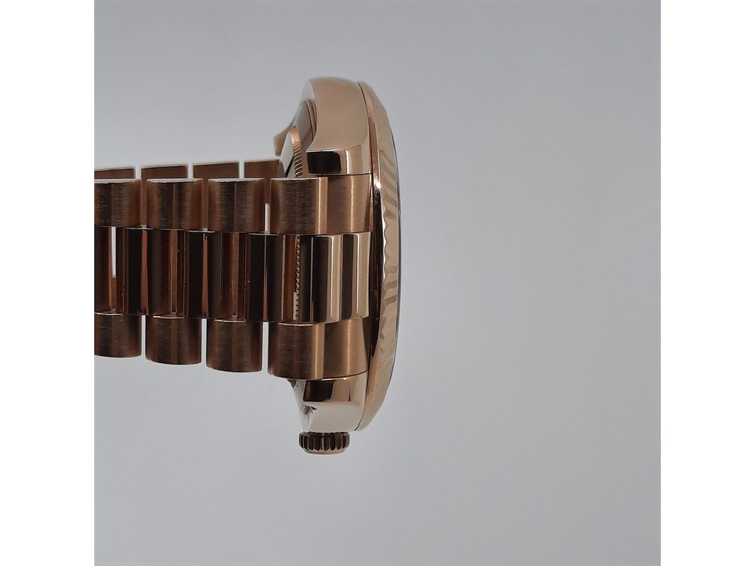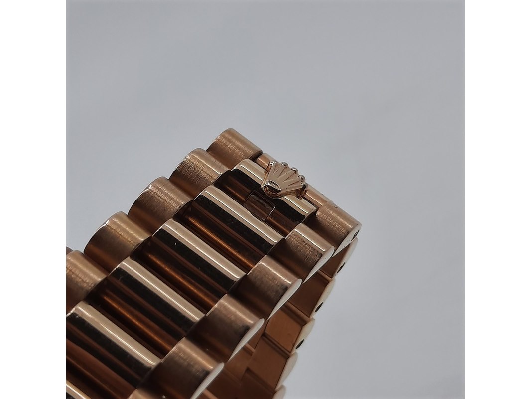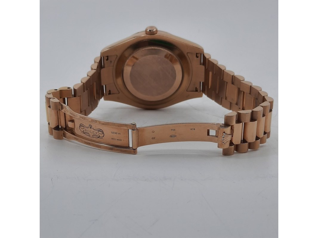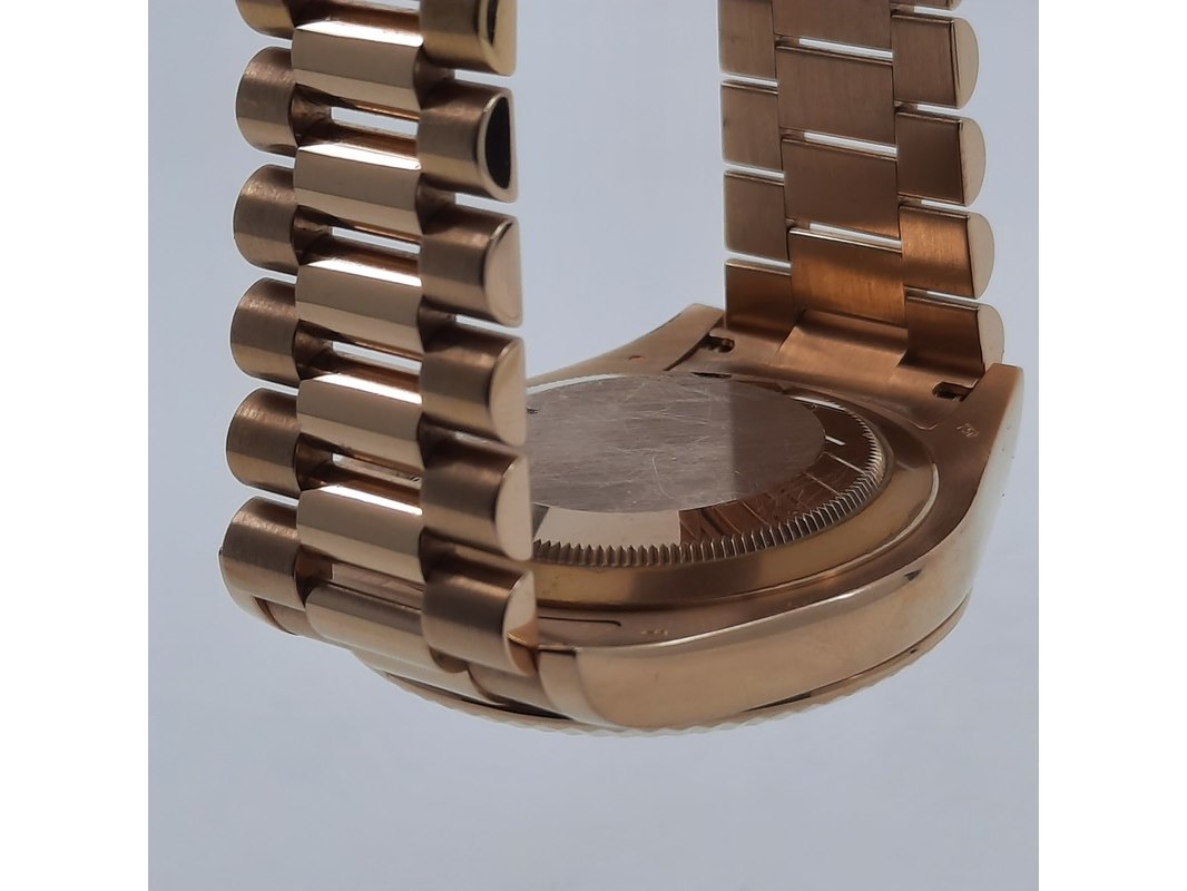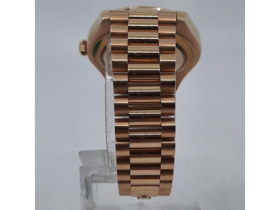 Merk: Rolex Product: Heren polshorloge Conditie: gebruikt Specificaties: Een roségouden heren polshorloge, Rolex Day-Date 218235. Met zwarte wijzerplaat, diamant en robijn indices en roségouden President model band. Gehalte '750', bruto gewicht ca. 207,5 gram. Glas licht beschadigd aan de rand. Inclusief doos, certificaat en reserveschakels. Documentatie van 5-2015. Plastic laagje pasje laat los.