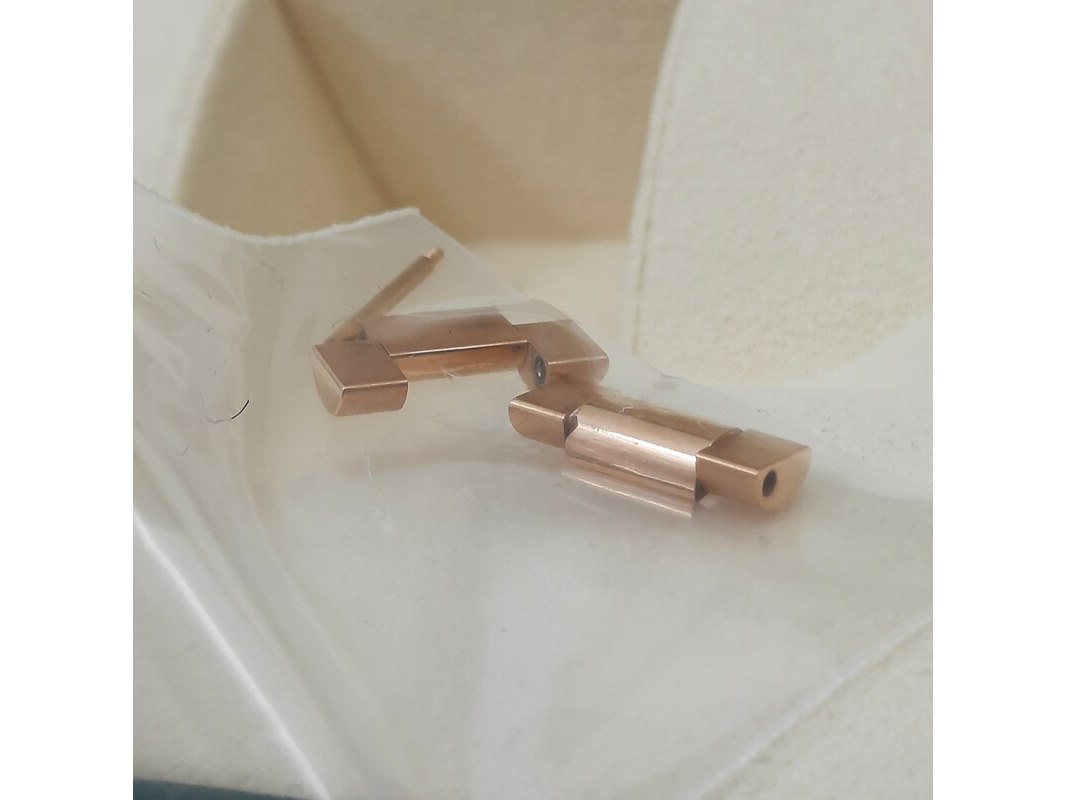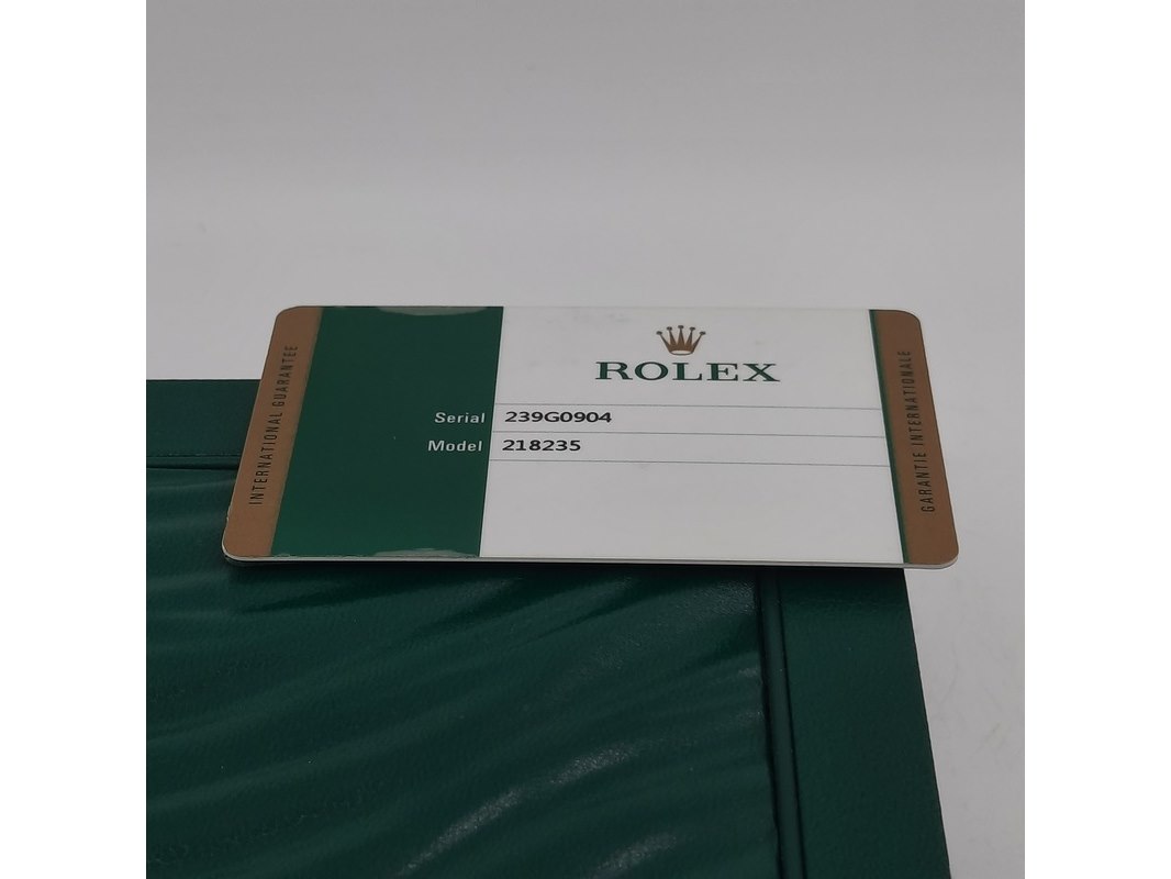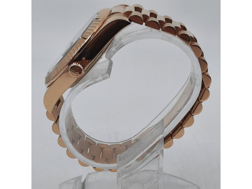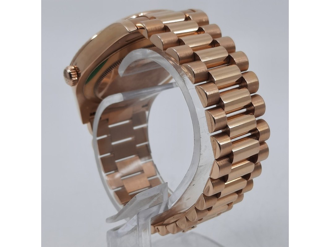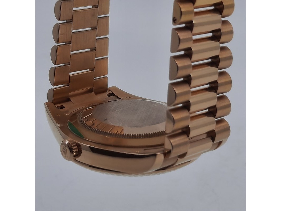 Merk: Rolex Product: Heren polshorloge Conditie: gebruikt Specificaties: Een roségouden heren polshorloge, Rolex Day-Date 218235. Met zwarte wijzerplaat, diamant en robijn indices en roségouden President model band. Gehalte '750', bruto gewicht ca. 207,5 gram. Glas licht beschadigd aan de rand. Inclusief doos, certificaat en reserveschakels. Documentatie van 5-2015. Plastic laagje pasje laat los.