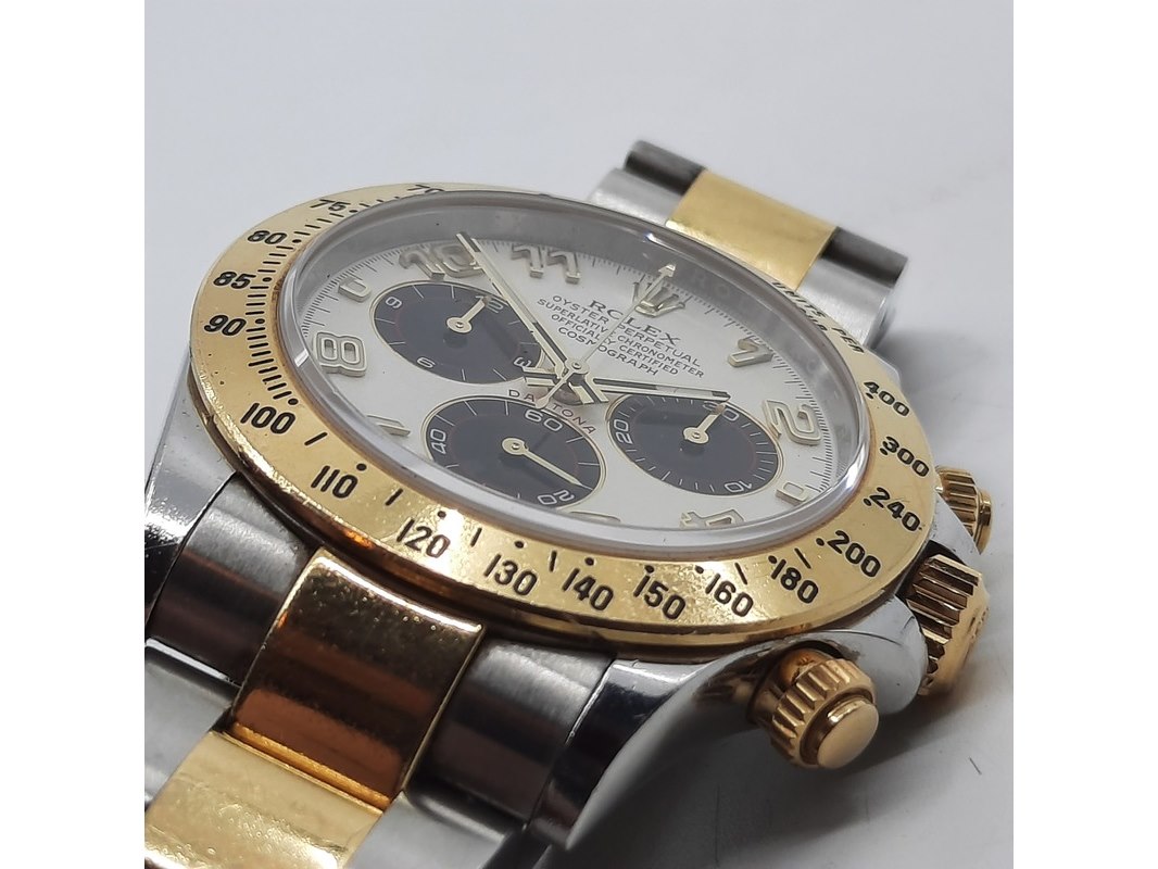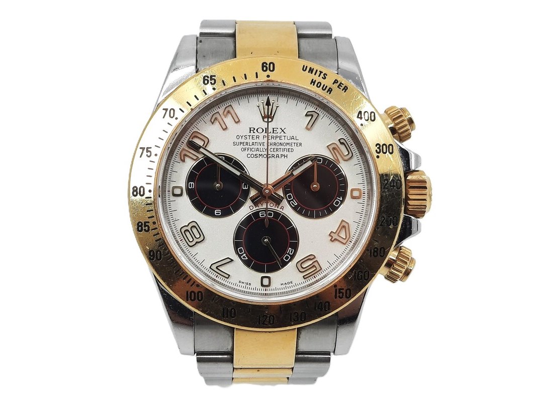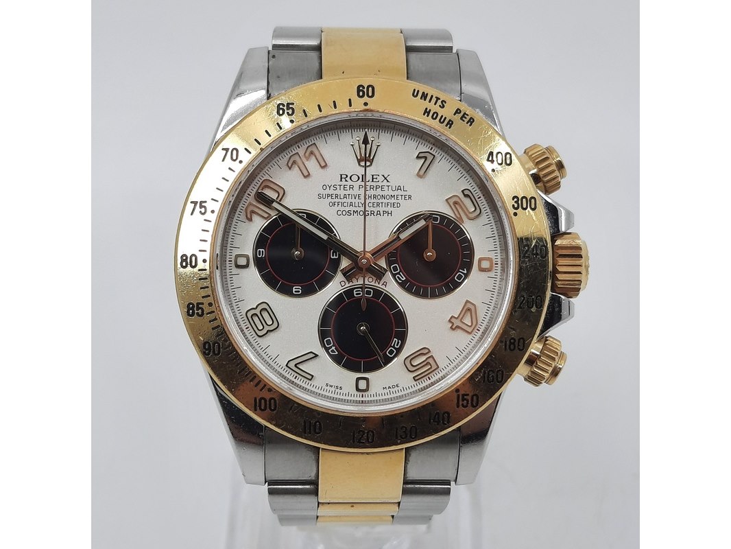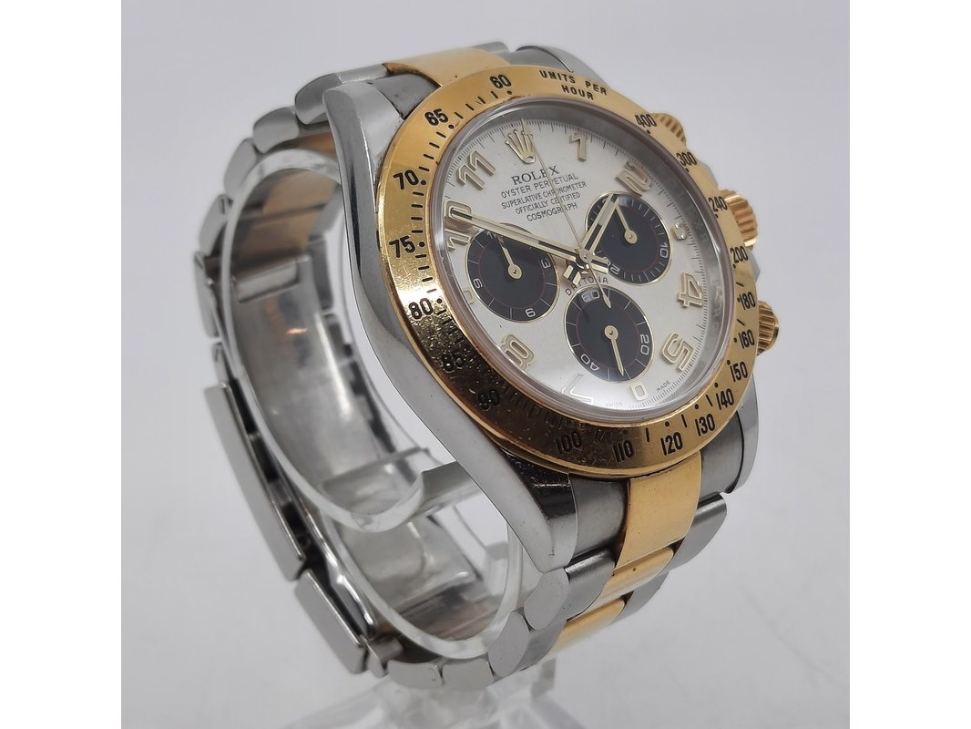 Merk: Rolex Product: Heren polshorloge Conditie: gebruikt Specificaties: Een goud met stalen heren polshorloge, Rolex Daytona 116523. Met gouden lunet, stalen kast, argente wijzerplaat, drie zwarte registers, automatisch uurwerk, kaliber 4130 en goud met stalen Oyster model band. Geen doos en geen certificaat.