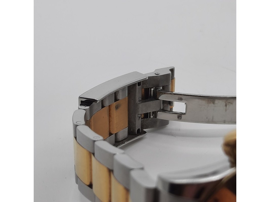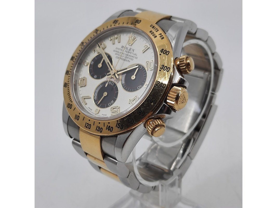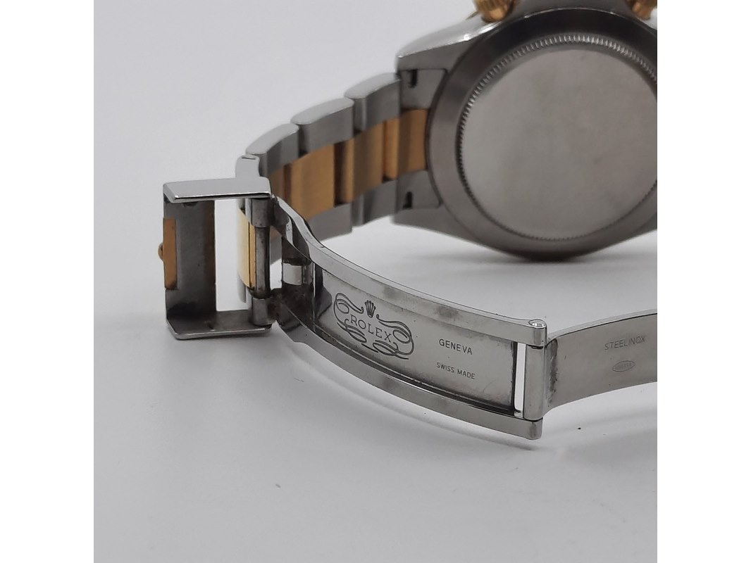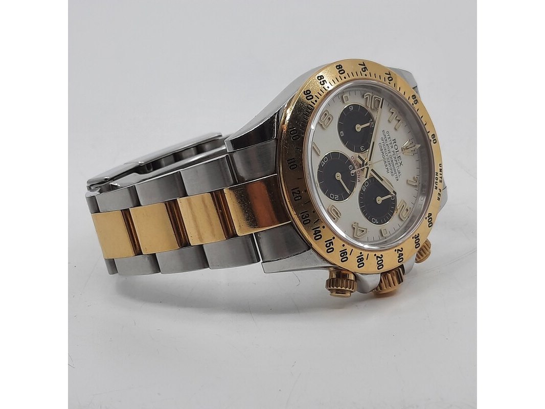 Merk: Rolex Product: Heren polshorloge Conditie: gebruikt Specificaties: Een goud met stalen heren polshorloge, Rolex Daytona 116523. Met gouden lunet, stalen kast, argente wijzerplaat, drie zwarte registers, automatisch uurwerk, kaliber 4130 en goud met stalen Oyster model band. Geen doos en geen certificaat.