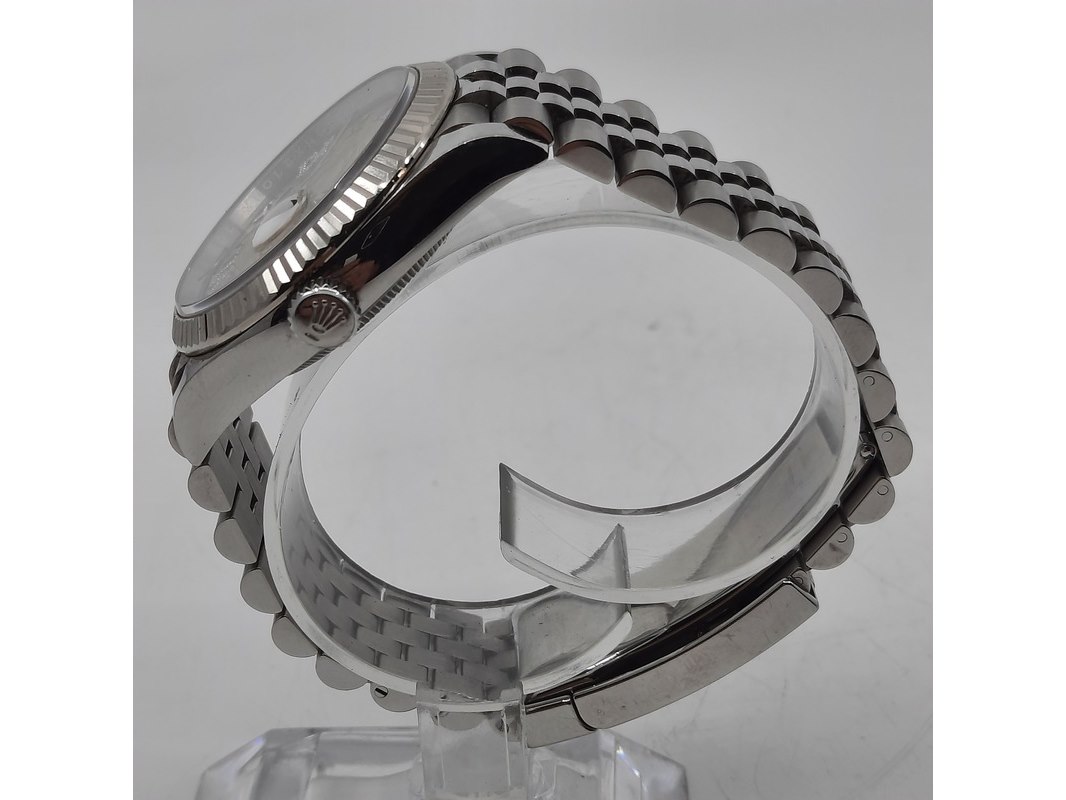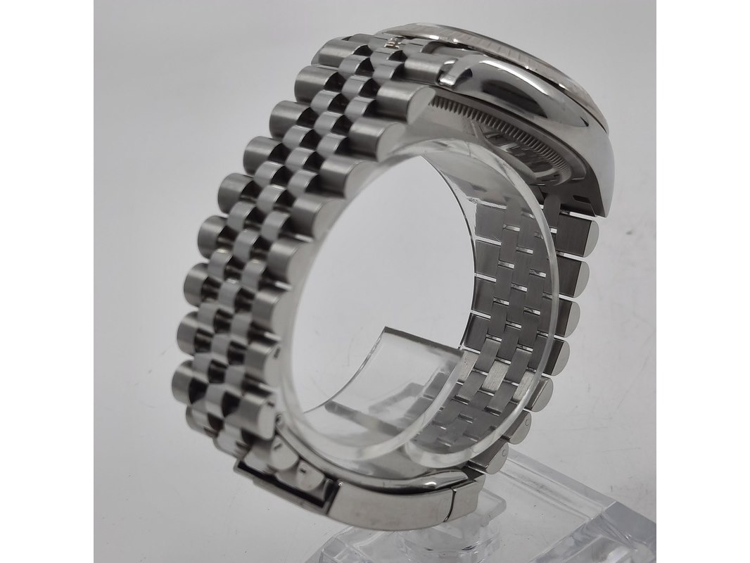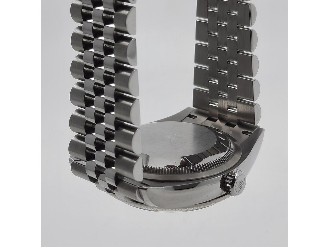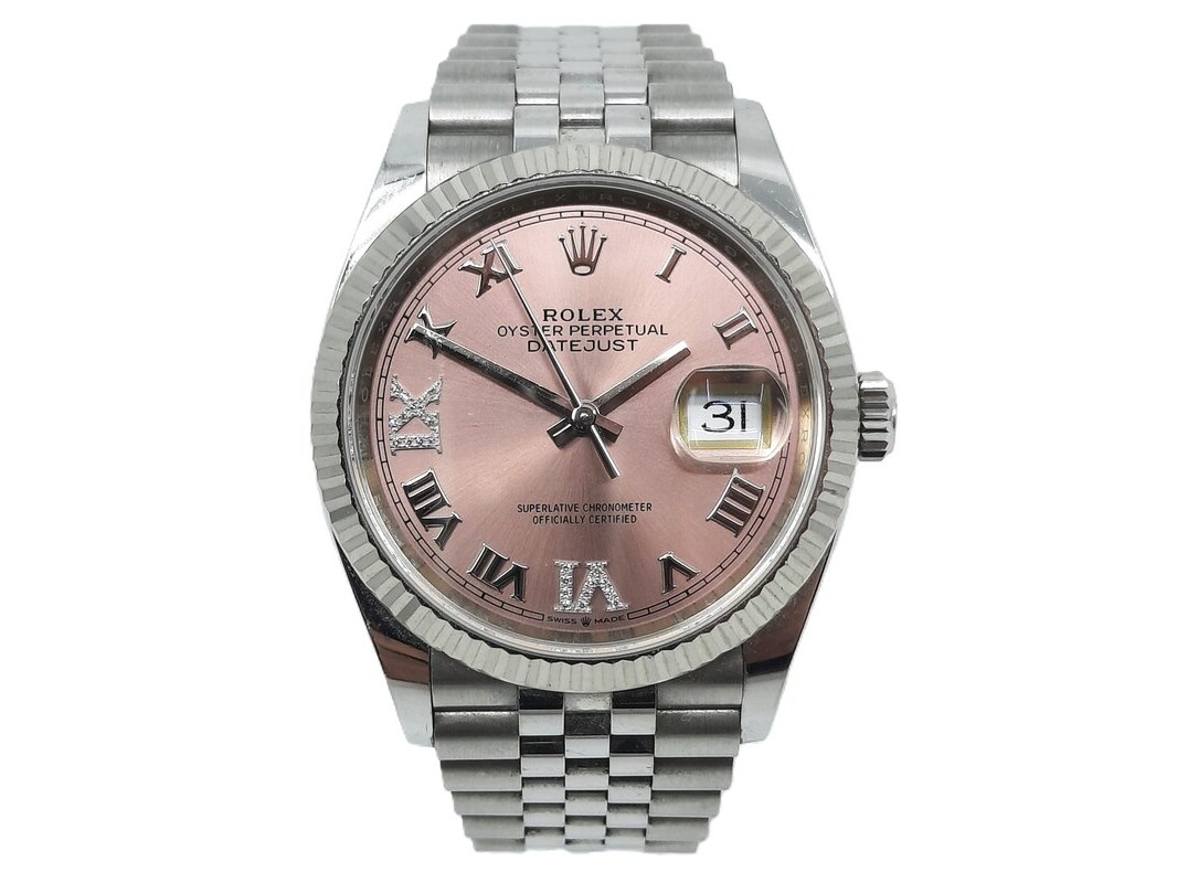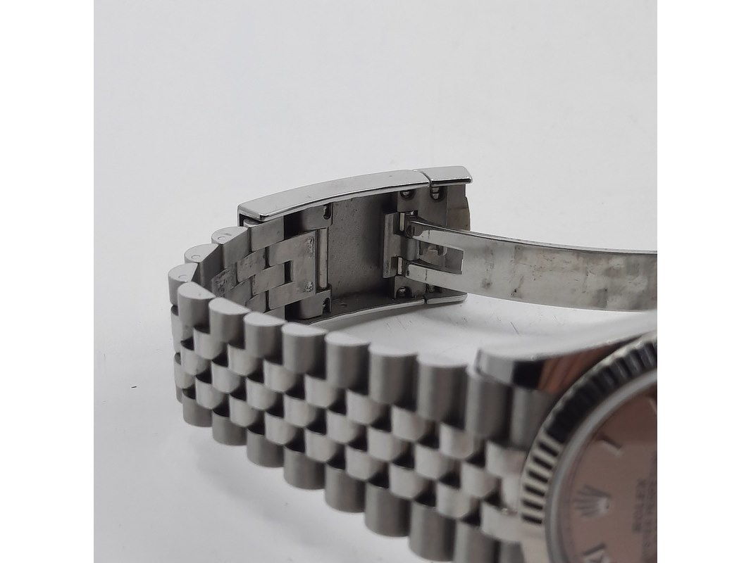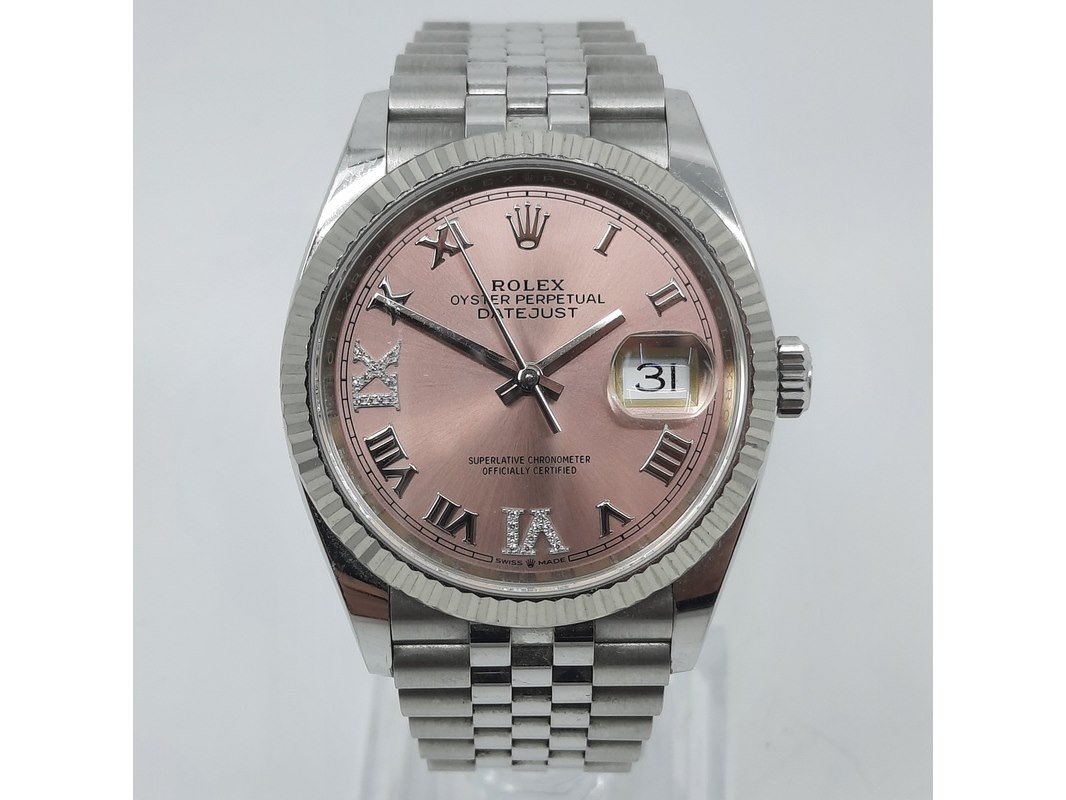 Merk: Rolex Product: Heren polshorloge Conditie: gebruikt Specificaties: Een goud met stalen heren polshorloge, Rolex Datejust II 126234. Met witgouden lunet, stalen kast, roze wijzerplaat, Romeinse index, de zes en negen met diamant, automatisch uurwerk, kaliber 3235 en stalen Jubilee model band. Geen doos en geen certificaat.