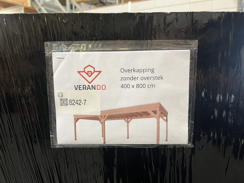 Merk: Verando Product: Douglas overkapping Materiaal: Douglas hout Afmeting: 400*800cm Conditie: nieuw Specificaties: Deze overkapping bestaat uit hoogwaardige, bezaagde, Europese, Douglas houten onderdelen en wordt geleverd als een compleet pakket inclusief bevestigingsmaterialen en een duidelijke, stapsgewijze handleiding voor de montage. Specificaties: •Palen van 12 × 12 cm •Ringbalk van 5 × 15 cm (bij 400 cm diepte 7,5 x 17,5 cm) •Balklaag van 5 x 15 cm •Dakbeschot van 1,8 cm •Boeiboorden van 2,5 × 20 cm •Schoren van 5 × 15 cm •Bezaagd Europees Douglas hout •Inclusief alle benodigde bevestigingsmaterialen •Heldere en gebruiksvriendelijke montagehandleiding