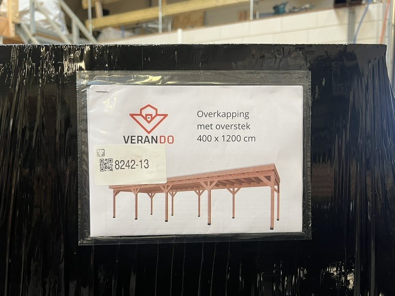 Merk: Verando Product: Douglas overkapping met overstek Materiaal: Douglas hout Afmeting: 400*1200cm Conditie: nieuw Specificaties: Deze overkapping bestaat uit hoogwaardige, bezaagde, Europese, Douglas houten onderdelen en wordt geleverd als een compleet pakket inclusief bevestigingsmaterialen en een duidelijke, stapsgewijze handleiding voor de montage. Specificaties: •Palen van 12 × 12 cm •Ringbalk van 5 × 15 cm (bij 400 cm diepte 7,5 x 17,5 cm) •Balklaag van 5 x 15 cm •Dakbeschot van 1,8 cm •Boeiboorden van 2,5 × 20 cm •Schoren van 5 × 15 cm •Bezaagd Europees Douglas hout •Inclusief alle benodigde bevestigingsmaterialen •Heldere en gebruiksvriendelijke montagehandleiding