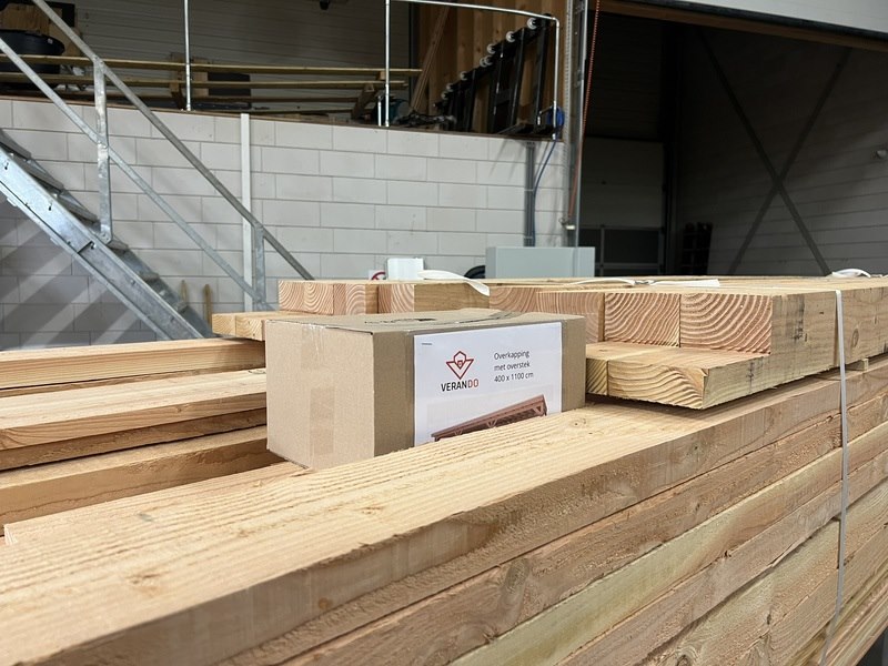 Merk: Verando Product: Douglas overkapping met overstek Materiaal: Douglas hout Afmeting: 400*1100cm Conditie: nieuw Specificaties: Deze overkapping bestaat uit hoogwaardige, bezaagde, Europese, Douglas houten onderdelen en wordt geleverd als een compleet pakket inclusief bevestigingsmaterialen en een duidelijke, stapsgewijze handleiding voor de montage. Specificaties: •Palen van 12 × 12 cm •Ringbalk van 5 × 15 cm (bij 400 cm diepte 7,5 x 17,5 cm) •Balklaag van 5 x 15 cm •Dakbeschot van 1,8 cm •Boeiboorden van 2,5 × 20 cm •Schoren van 5 × 15 cm •Bezaagd Europees Douglas hout •Inclusief alle benodigde bevestigingsmaterialen •Heldere en gebruiksvriendelijke montagehandleiding