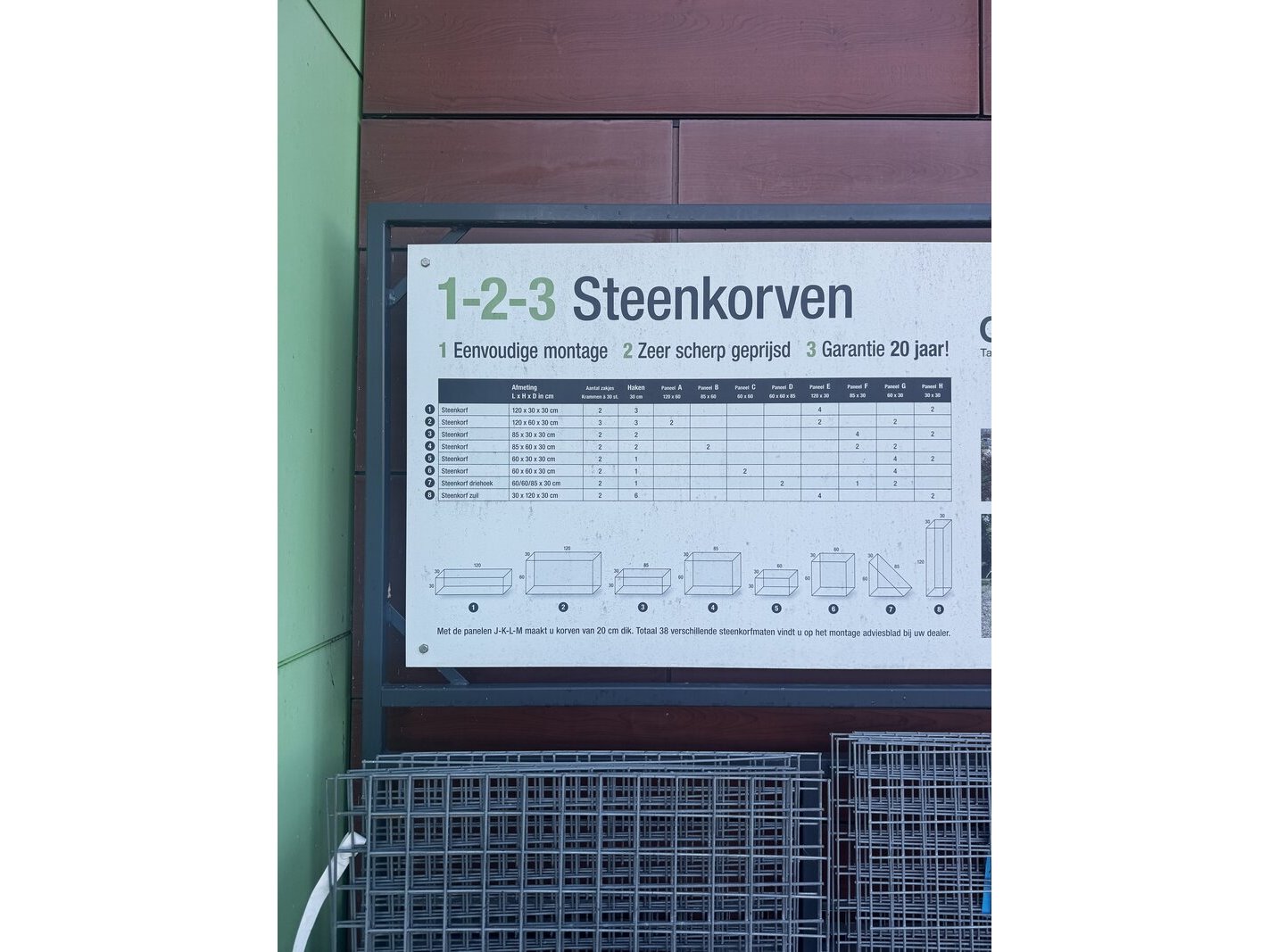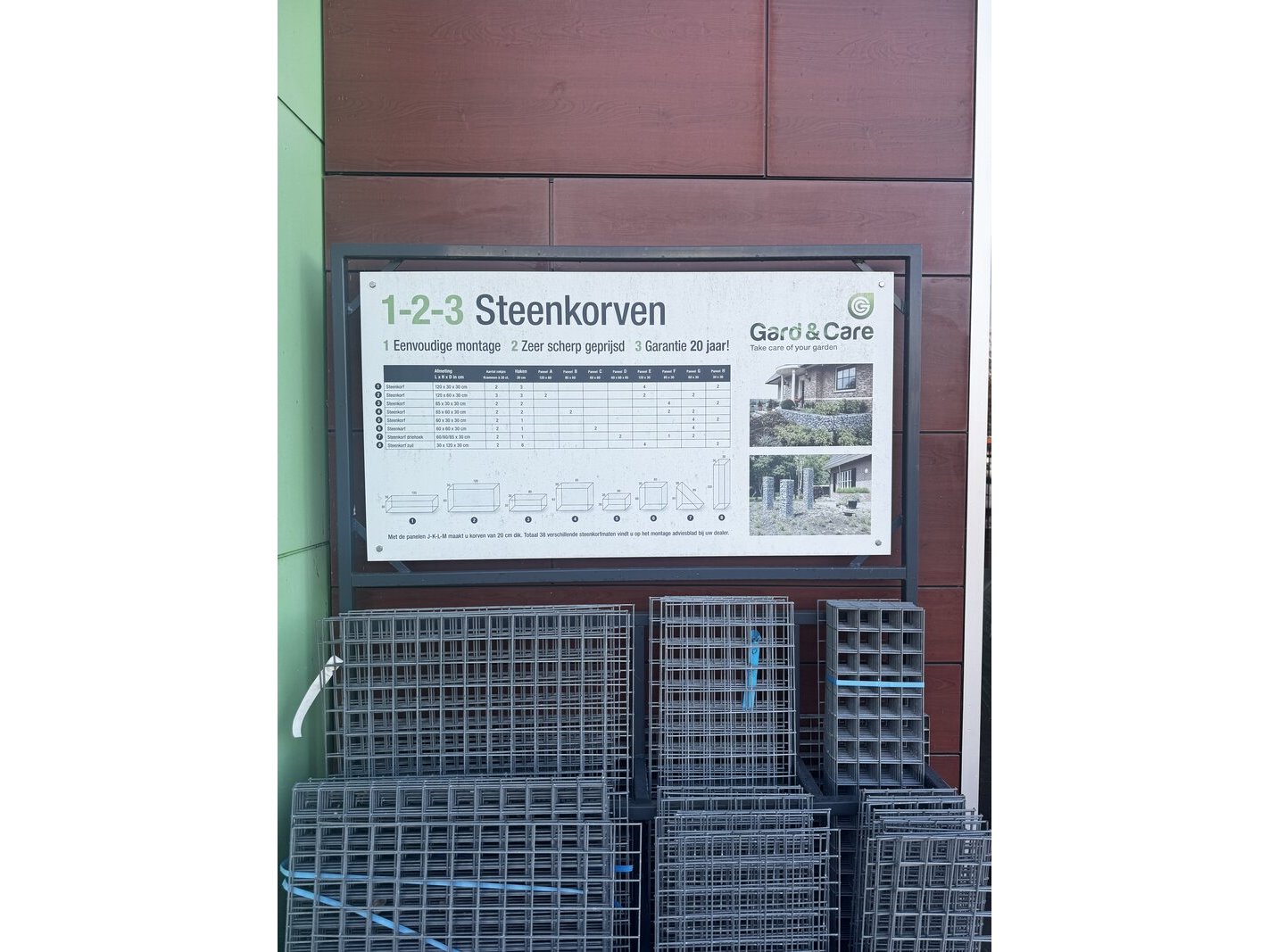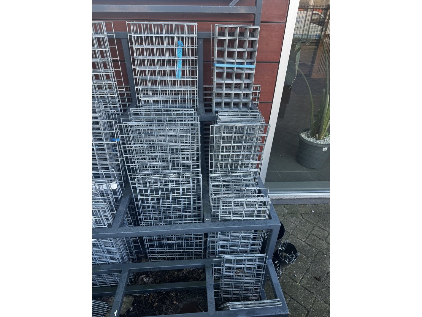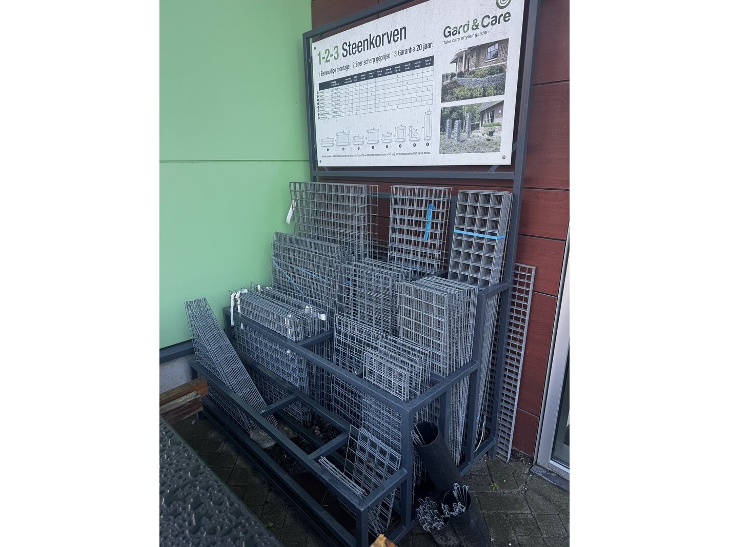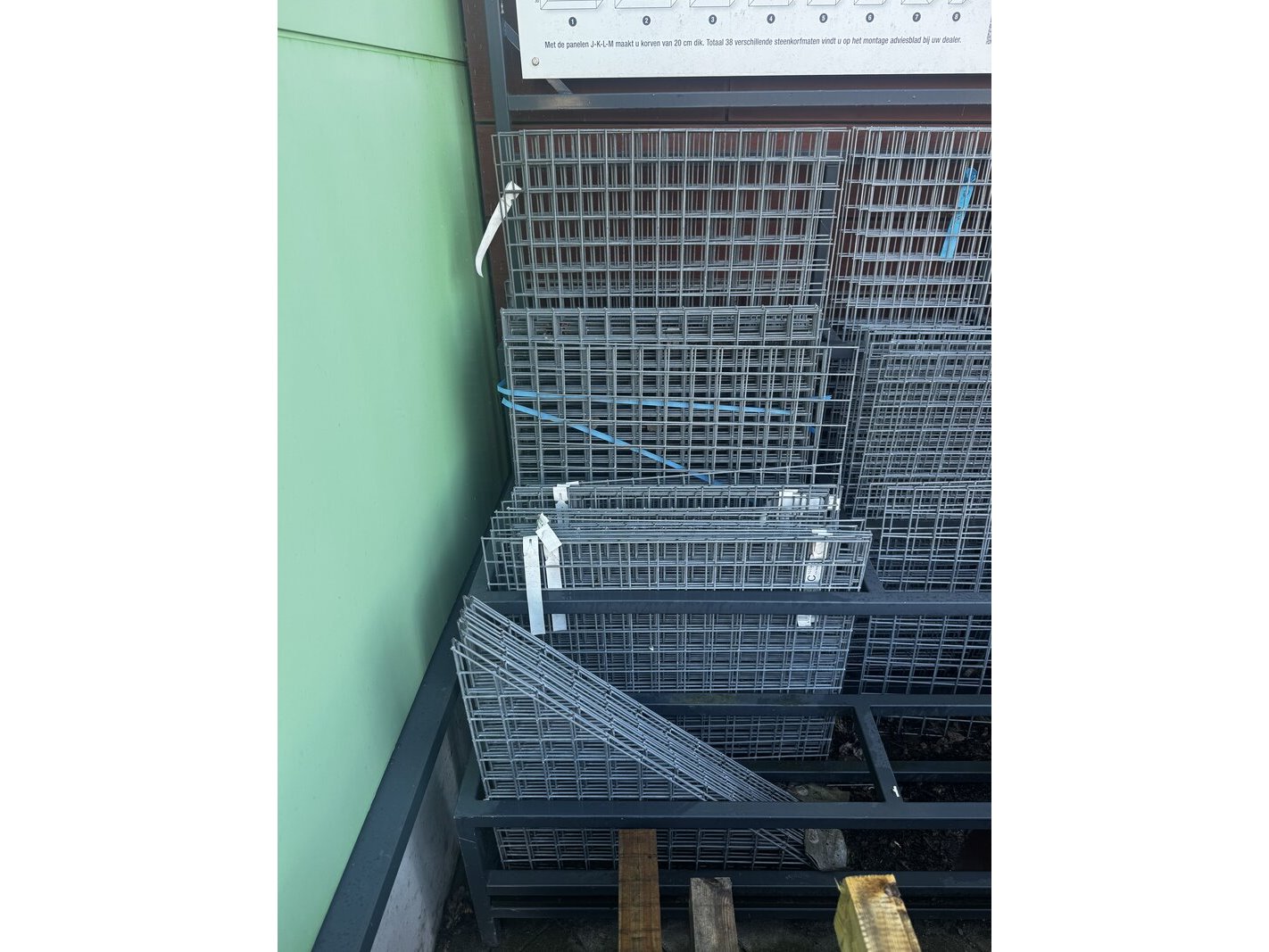 Product: 123 Steenkorvenrek + voorraad Materiaal: Staal Afmeting: verschillende afmetingen Specificaties: Voorraad rek vol met steenkorf panelen en gegalvaniseerd staal. Hiermee kan je zelf je steenkorven maken.
