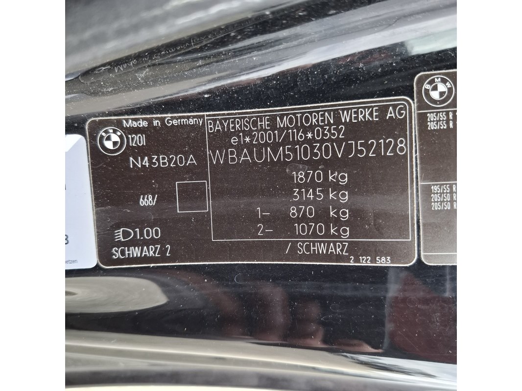 Merk: BMW Product: Personenauto BouwJaar: 2009 Conditie: gebruikt Specificaties: Kenteken: N-598-BR Eerste toelating nationaal: 30-05-2022 Geïmporteerd APK vervaldatum: 26-03-2026 Brandstof: Benzine Afgelezen tellerstand: 123.201 Transmissie: Handgeschakeld Aantal sleutels: 1 VIN nummer: WBAUM51030VJ52128 Start: Ja Opties e.d. Elektrische ramen/spiegels Lederen stoelen Stoelverwarming Waargenomen gebreken Motorlampje brand Gebruikerssporen rondom