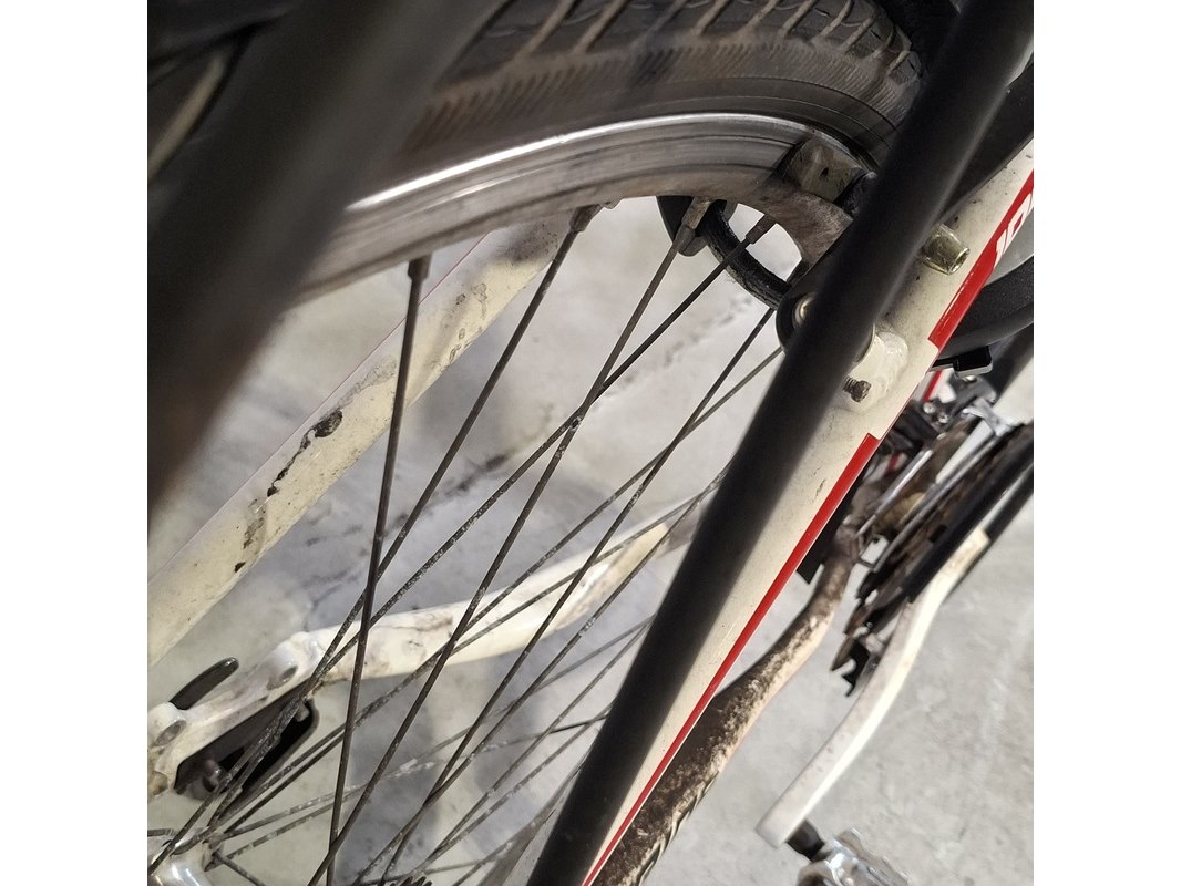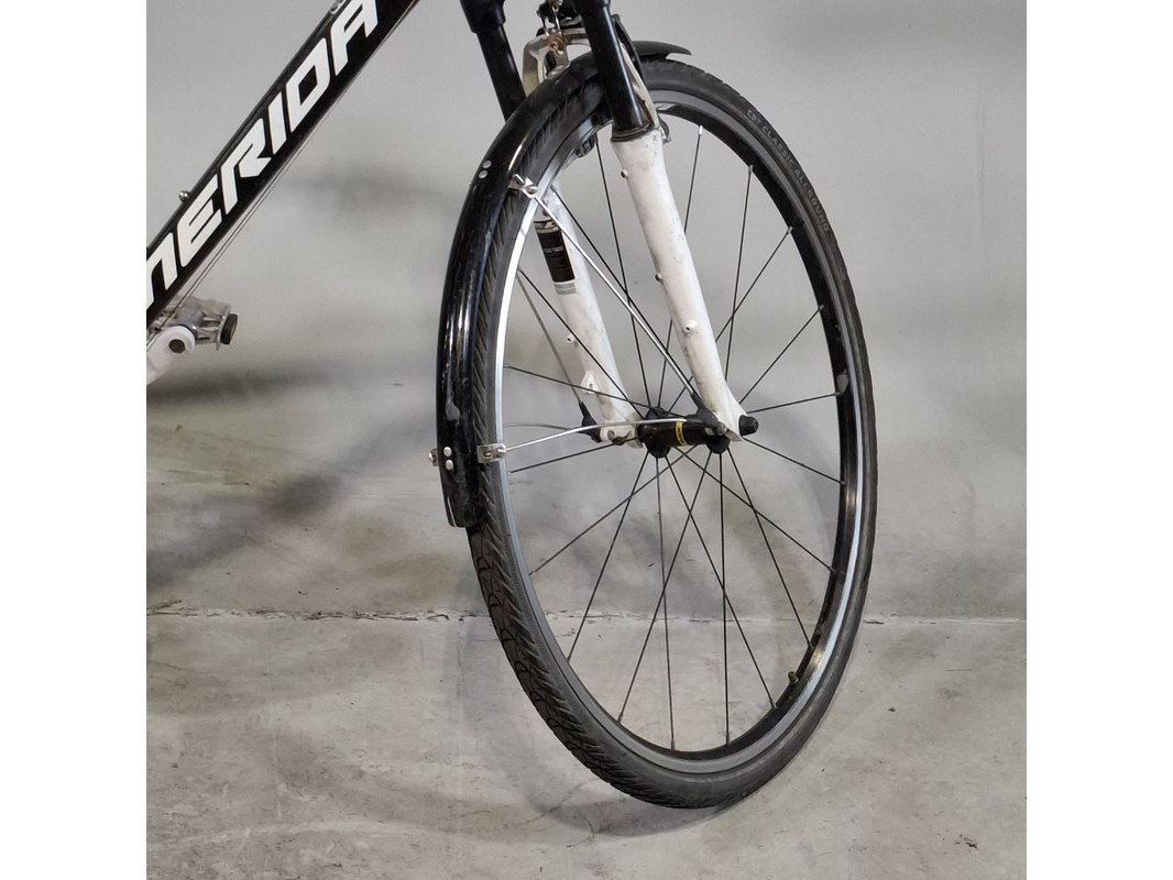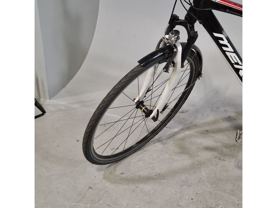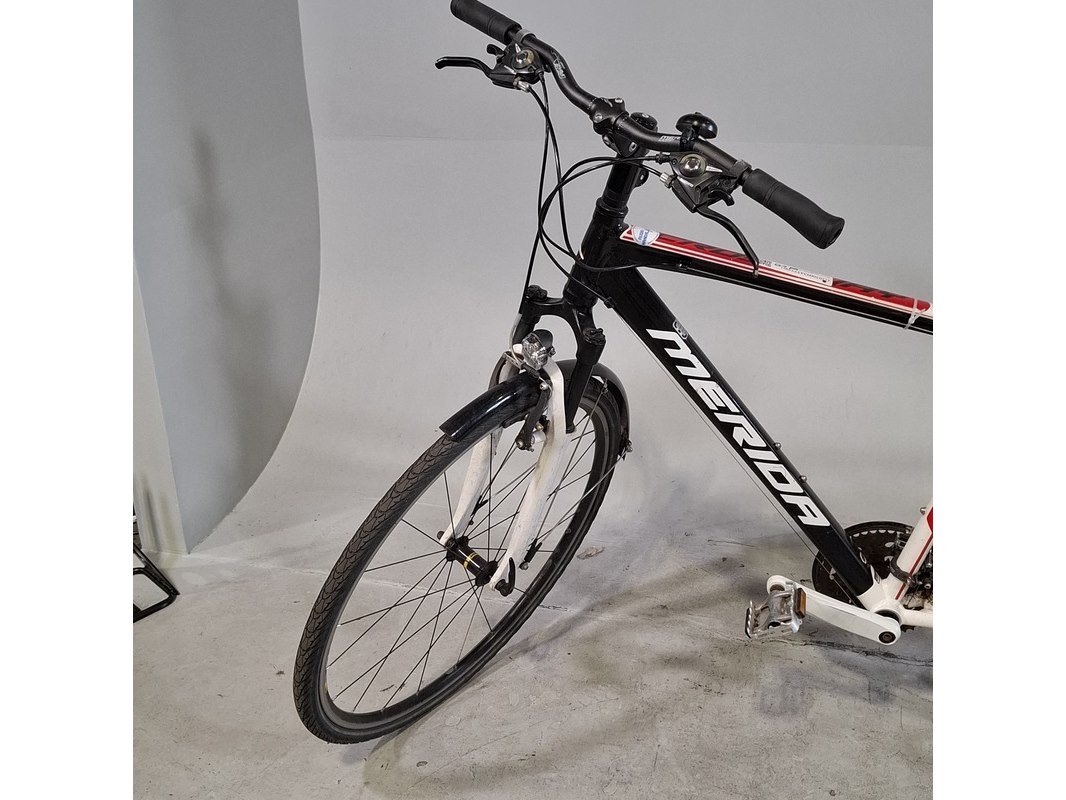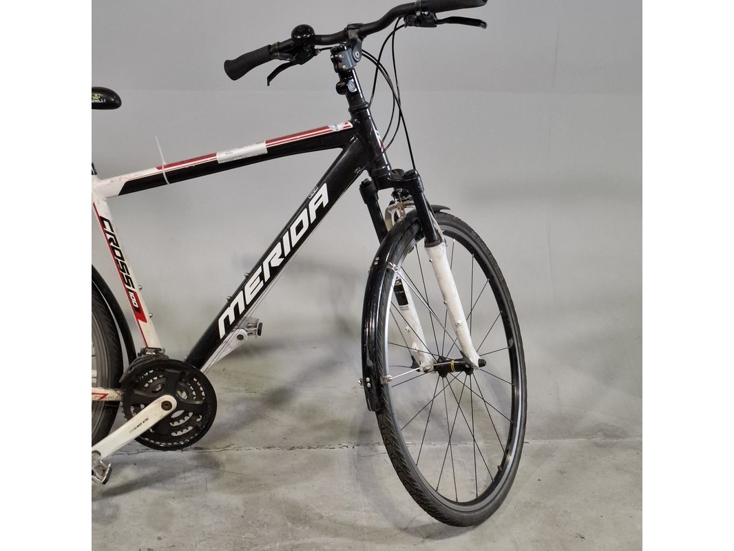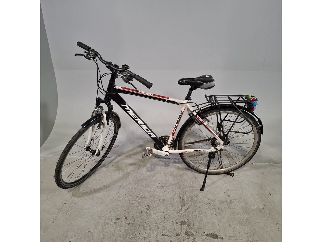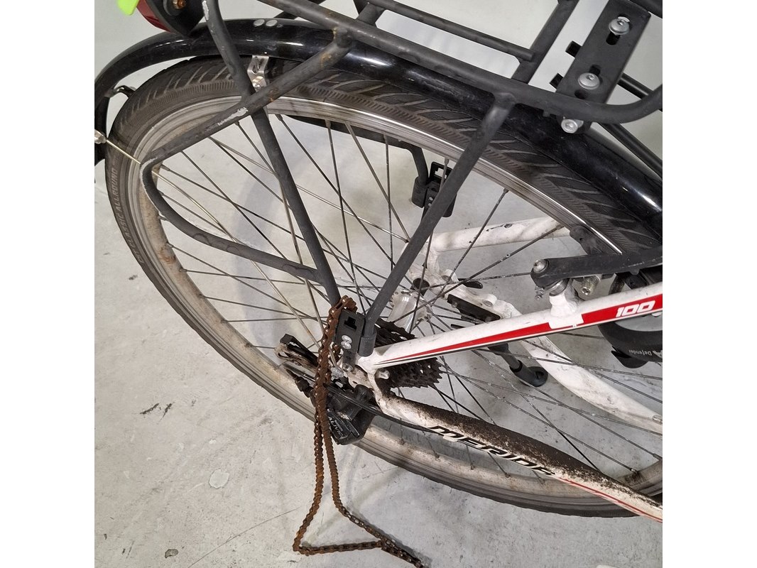 Merk: Merida Product: Herenfiets Afmeting: Framemaat ca. 53 cm Specificaties: 3x8 versnellingen Geveerde voorvork Ketting gebroken, ligt er af. Fiets staat op slot, sleutel ontbreekt.
