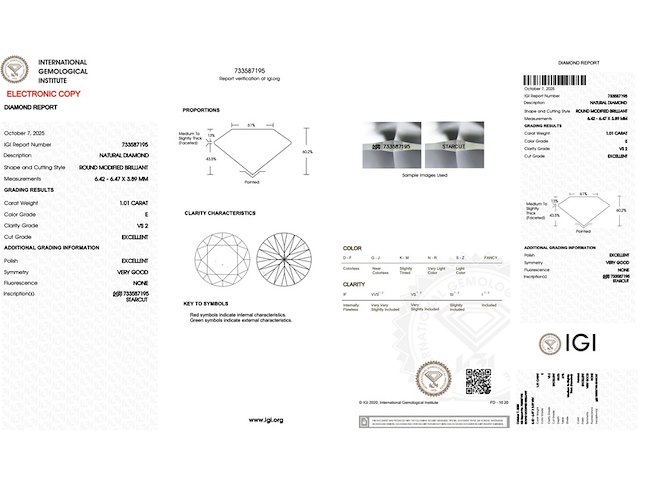 Product: Diamant - 1.01 carat echte natuurlijke Starcut Briljant geslepen diamant (gecertificeerd) Specificaties: Diamant: Natuurlijk Aantal: 1 stuk Slijpvorm: Briljant geslepen Gewicht (carat): 1.01 carat Kleur: E Zuiverheid: VS2 Slijpkwaliteit: Excellent Certificaat: IGI Certificaat nummer: 733587195 Extra informatie: Deze diamant is een echte Starcut diamant Conditie: Nieuw Verpakking: Komt met een Edelsteendoos Toelichting: De kwaliteit is overgenomen van het rapport behorend bij item. De waardebepaling is een beoordeling van een gecertificeerde diamantair, gebaseerd op consumentenprijzen. Consumentenprijs: € 31.500,-