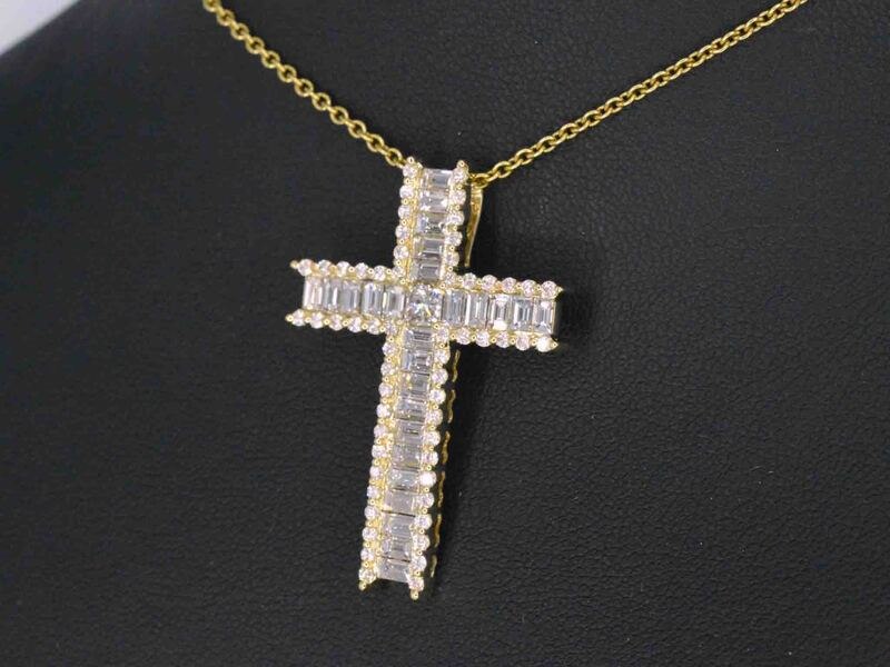 Product: Gouden kruis hanger met schitterende diamanten gezet Specificaties: Diamant: Natuurlijk Aantal: 85 stuks Slijpvorm: Briljant, baguette en prinses geslepen Gewicht (carat): 3.00 carat Kleur: F-G Zuiverheid: VVS-VS Slijpkwaliteit: Zeer mooi Juweel: Hanger (excl. ketting) Gewicht: 5.8 gram Afmetingen/lengte: 3.5 cm Materiaal: 18K goud (750) Conditie: Nieuw Verpakking: Luxe sieradendoos Toelichting: De kwaliteit is overgenomen van het rapport behorend bij item. De waardebepaling is een beoordeling van een gecertificeerde diamantair, gebaseerd op consumentenprijzen. Consumentenprijs: € 17.833,-