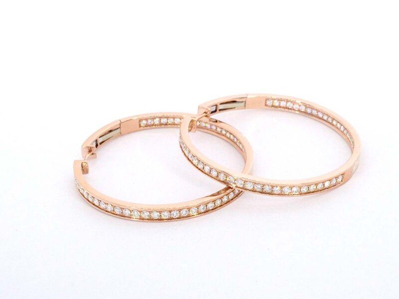 Product: Rosegouden creolen met diamanten Specificaties: Diamant: Natuurlijk Aantal: 102 stuks Slijpvorm: Briljant geslepen Gewicht (carat): 4.00 carat Kleur: D-E Zuiverheid: VVS Slijpkwaliteit: Zeer mooi Juweel: Oorbellen Gewicht: 22.2 gram Materiaal: 14k goud (585) Conditie: Zo goed als nieuw Verpakking: Luxe sieradendoos Toelichting: De kwaliteit is overgenomen van het rapport behorend bij item. De waardebepaling is een beoordeling van een gecertificeerde diamantair, gebaseerd op consumentenprijzen. Consumentenprijs: € 24.000,-