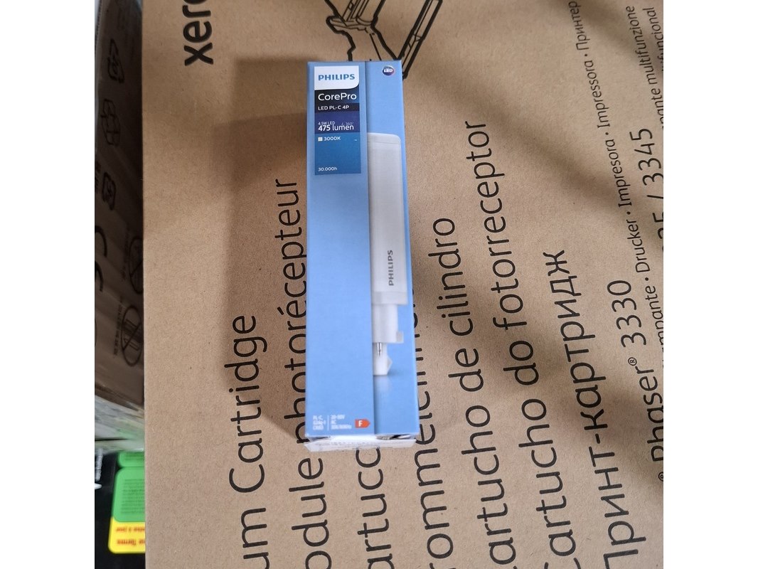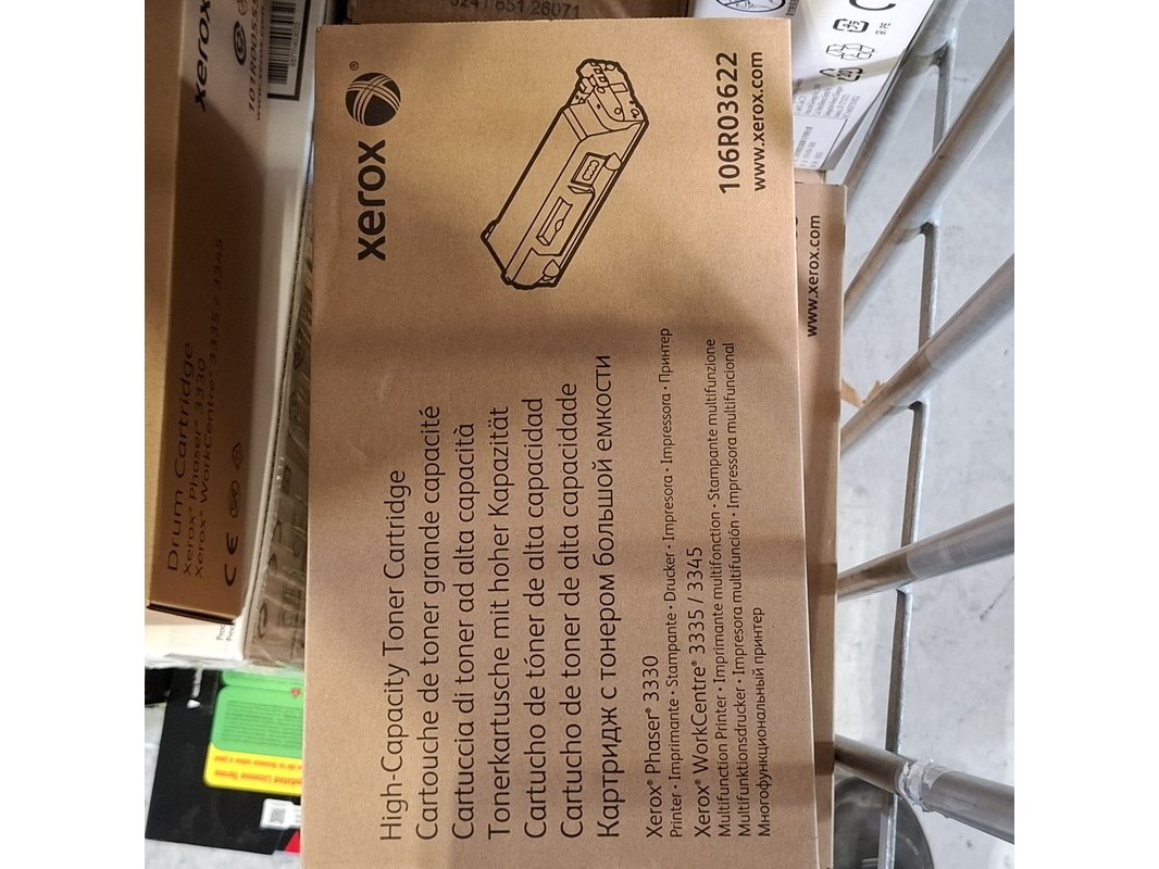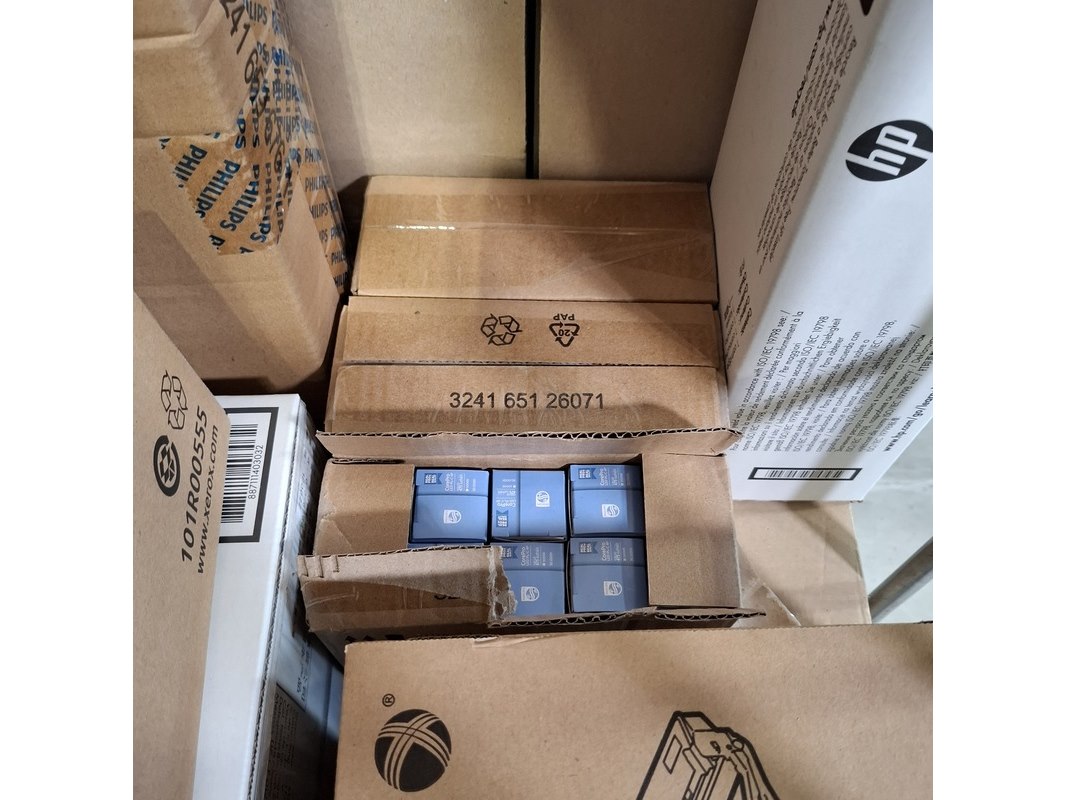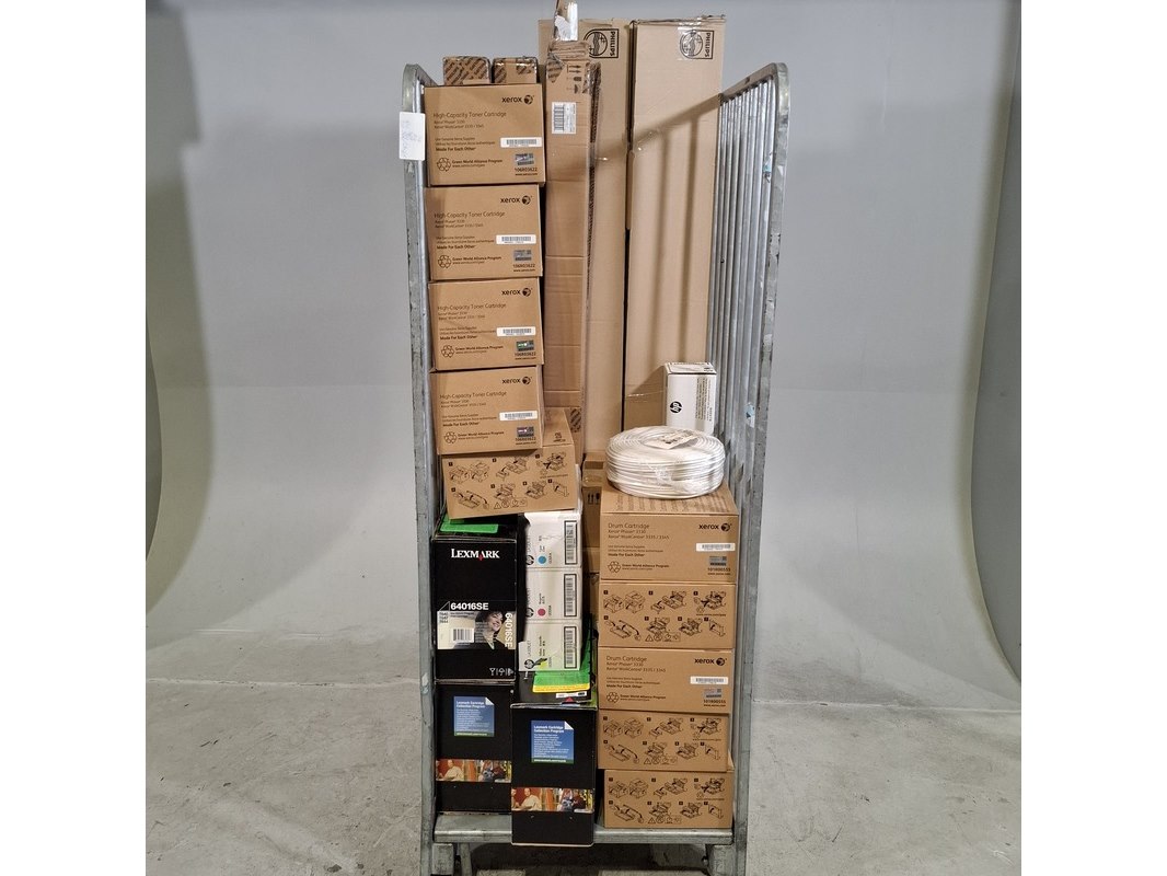 Product: Toners, verlichting en kabels Specificaties: Bestaande uit o.a. HP, Lexmark en Xerox toners: Diverse soorten en maten. Philips TL lampen, coax kabel, etc Technische staat en compleetheid onbekend. Exclusief rolcontainer.