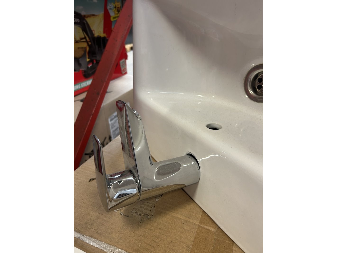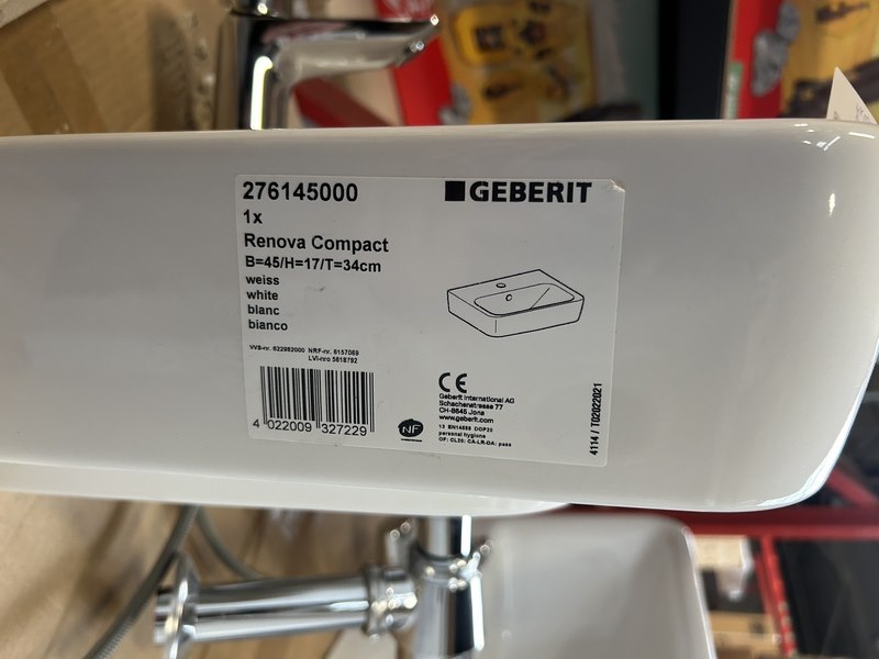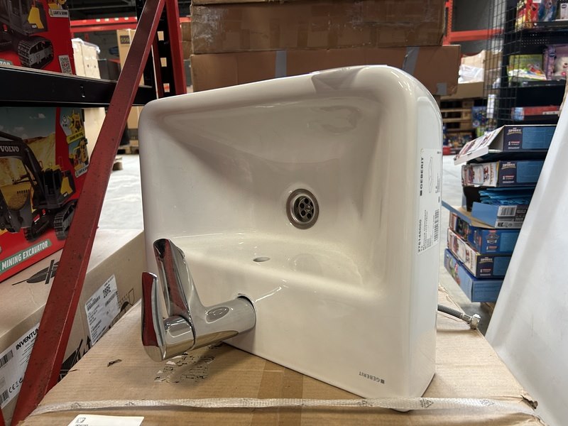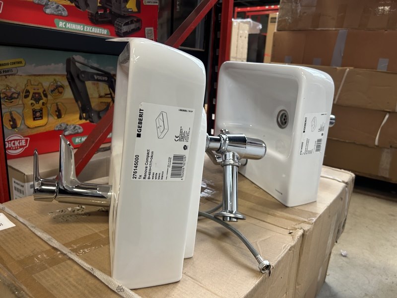 Merk: w.o. Geberit Product: Wastafel met kraan, 1x douchebak Specificaties: Nieuw, showroom modellen en demo modellen.
